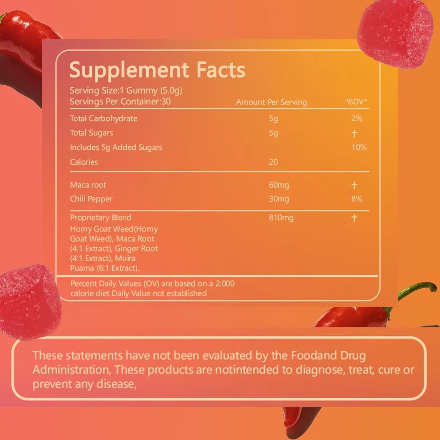 Enjoy 60 gummies packed with Maca Root Extract, L-Theanine, Caffeine, and Ginger. These gummies are a dietary supplement without live cultures. Perfect for daily use, they offer a unique blend of ingredients for your wellness routine. Each gummy is designed to provide a convenient way to incorporate these beneficial components into your diet.