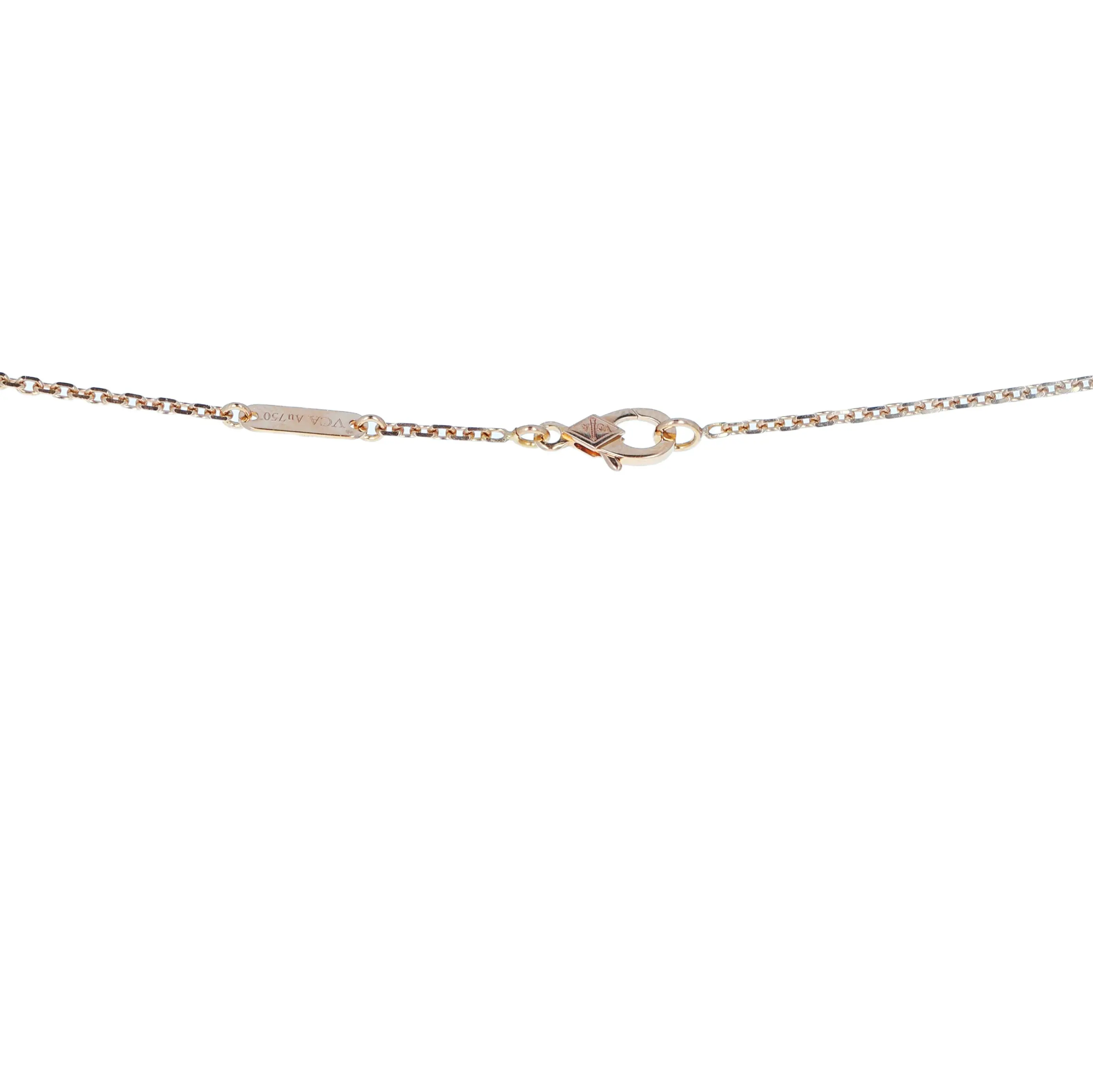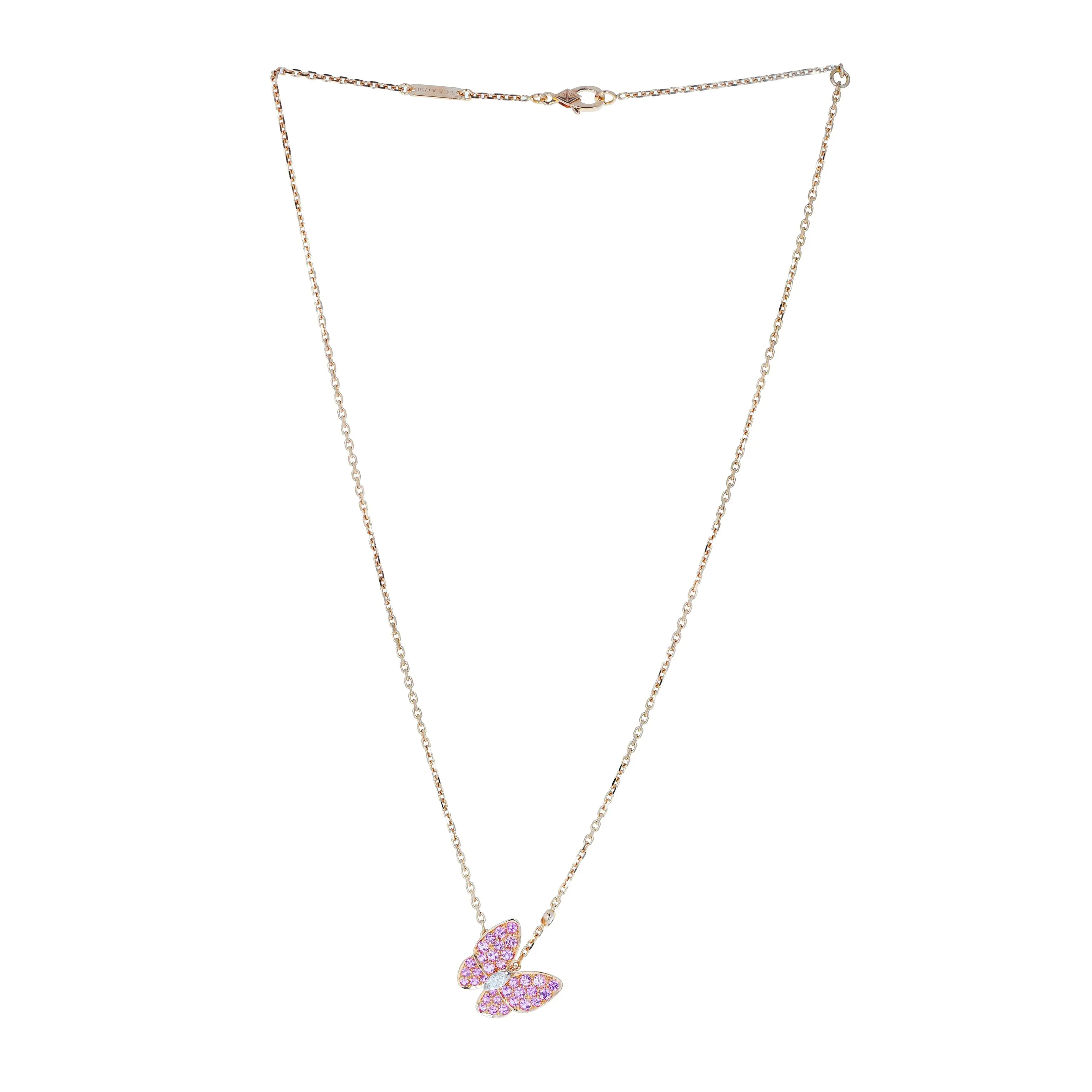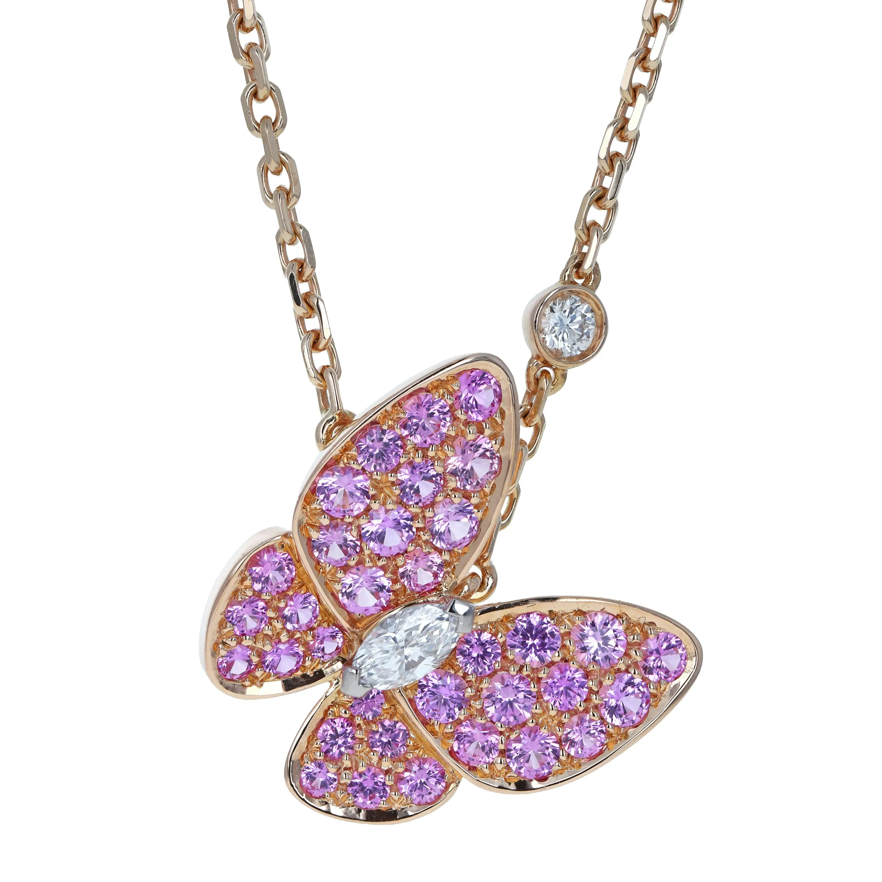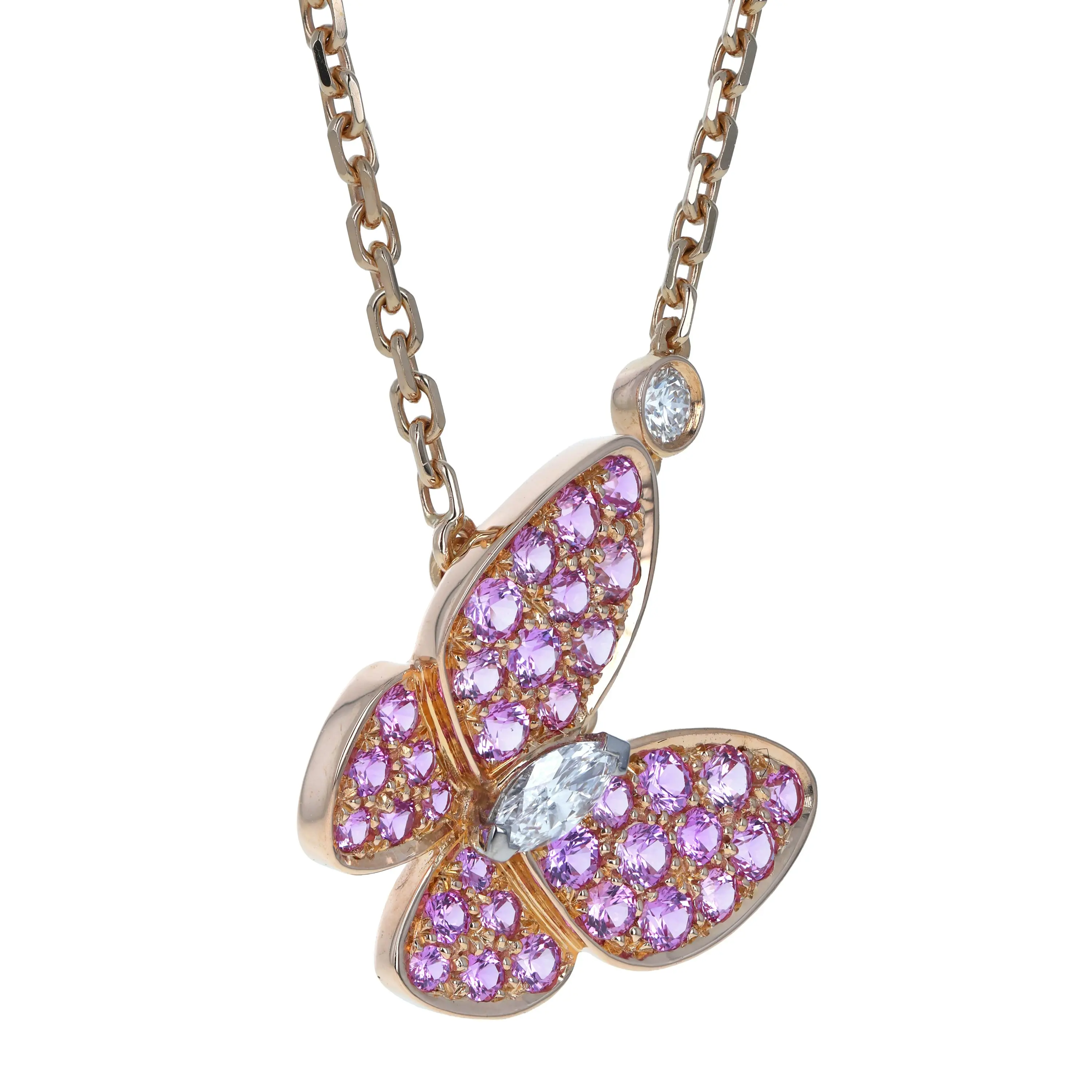 Pre-owned Van Cleef & Arpels 18k rose gold, diamond and pink sapphire pendant necklace from the Two Butterfly collection. The necklace features a single butterfly pendant that is pave-set with round pink sapphires in the wings and one marquise diamond in the center as the body. The pendant is stationed at the center of an 18k rose gold cable-link chain that has one bezel-set diamond accent, measures 17 inches in length and is secured with a lobster clasp. This piece comes with the original papers.
