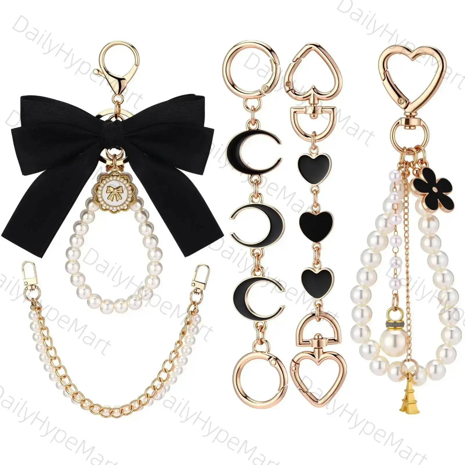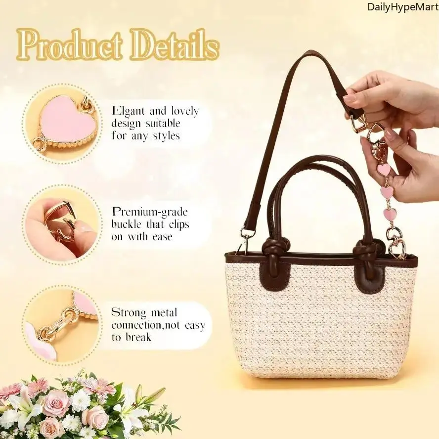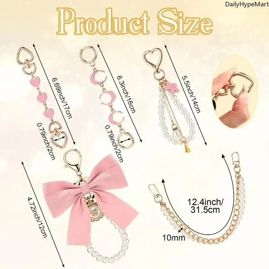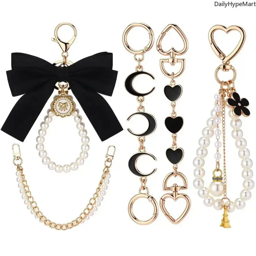5 Pcs Gold Pearl Bag Extender Chain Set – Bow Purse Strap Charms Upgrade your handbag style instantly with this 5 Pcs Gold Pearl Bag Extender Chain Set. Featuring elegant gold chains, pearl accents, and cute bow details, these purse strap charms add a fashionable and luxurious touch to your favorite bags. Perfect for handbags, shoulder bags, mini bags, and crossbody purses. Elegant Bow & Pearl Design The bow charm and pearl details create a sweet and stylish look that instantly makes your bag more eye-catching and trendy. Functional Bag Extender Chain Designed as a bag extender chain, it helps add extra length or decorative style to your purse strap while upgrading the overall look of your bag. Easy to Attach With secure clasps on both ends, the chain can be easily attached to: Handbags Crossbody bags Tote bags Wallets Mini purses Transform your bag style in seconds. Perfect For Handbag decoration Bag strap extender DIY purse styling Fashion bag accessories Everyday outfit upgrades Why You'll Love It 5-piece value set Gold chain with pearl accents Cute bow charm design Easy clip-on attachment Perfect for handbag styling and customization Perfect Gift Idea A stylish accessory gift for friends, fashion lovers, or anyone who enjoys decorating their handbags.