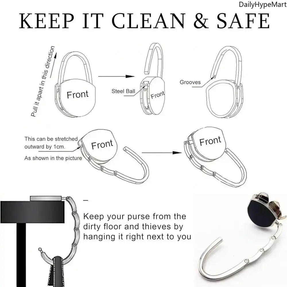 Never Put Your Bag on the Floor Again Keep your handbag clean, safe, and within reach with this foldable purse hook. Designed with a stylish clover shape, it easily attaches to tables, desks, and more—perfect for dining, travel, and everyday use. Key Features Foldable & Portable Design Compact and lightweight—fits easily in your purse. Clover Aesthetic Design Stylish and elegant look that complements any handbag. Strong & Stable Hold Securely supports your bag on most tables and surfaces. Keeps Your Bag Clean & Safe No more placing your purse on dirty floors. Multi-Use Convenience Perfect for restaurants, cafes, offices, travel, and daily use.