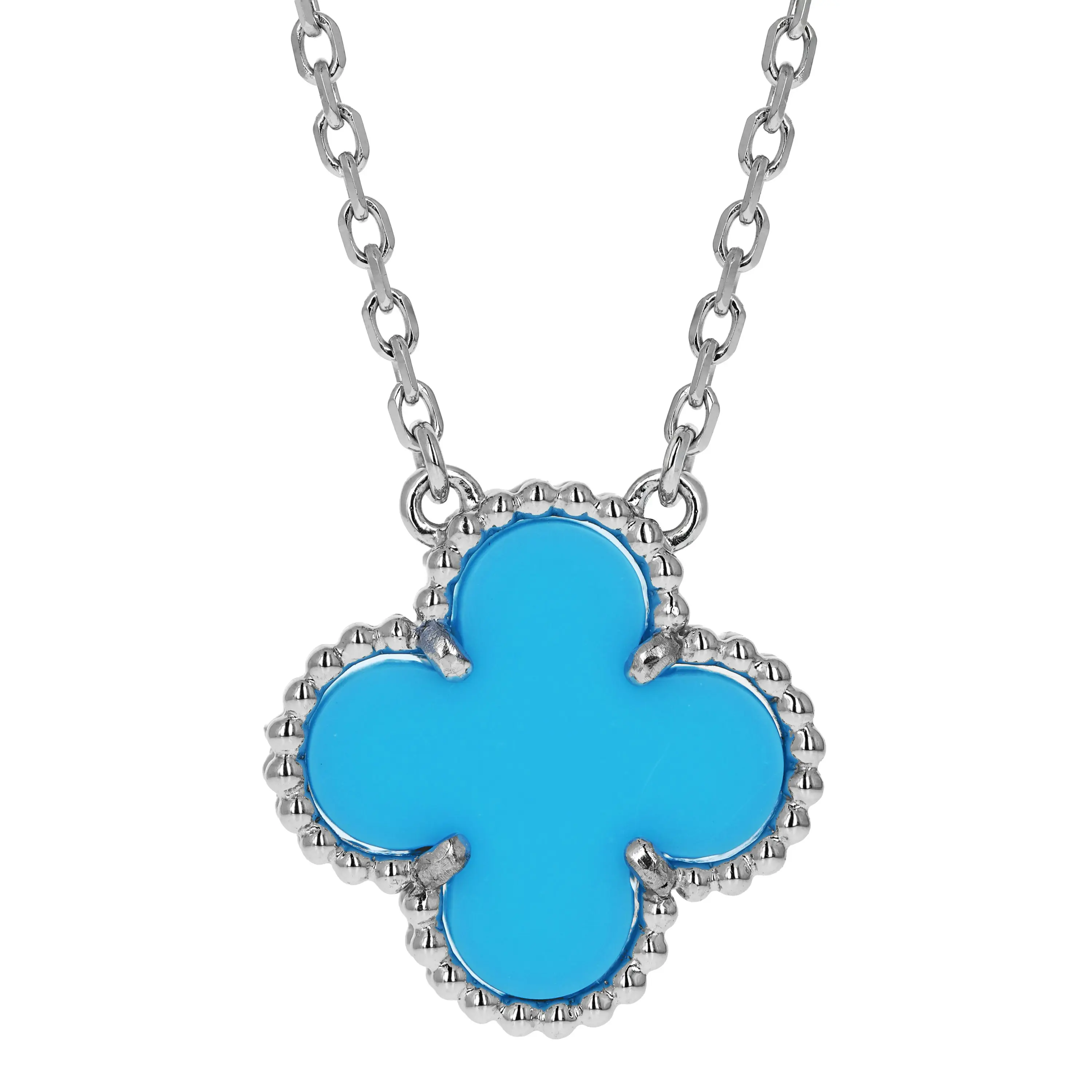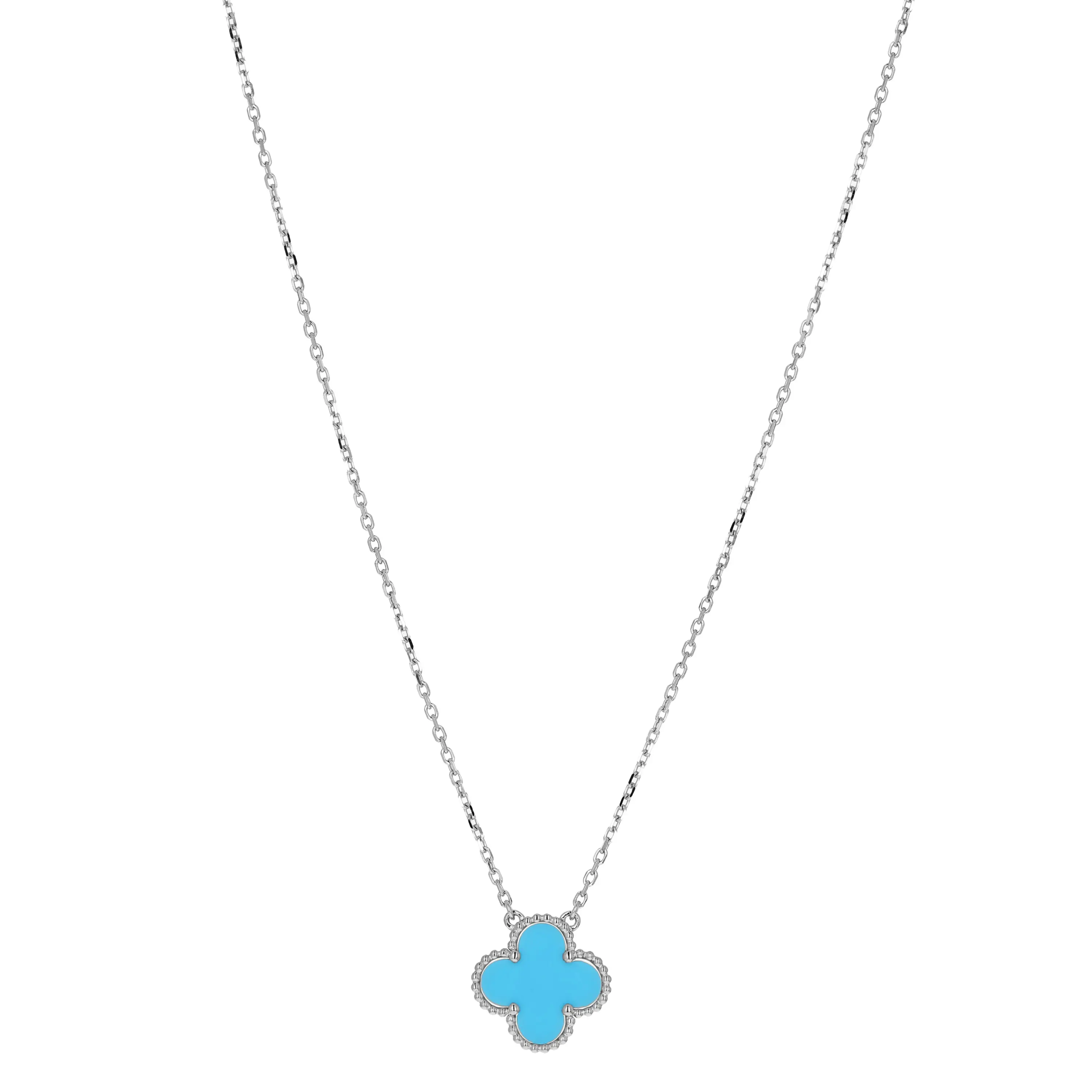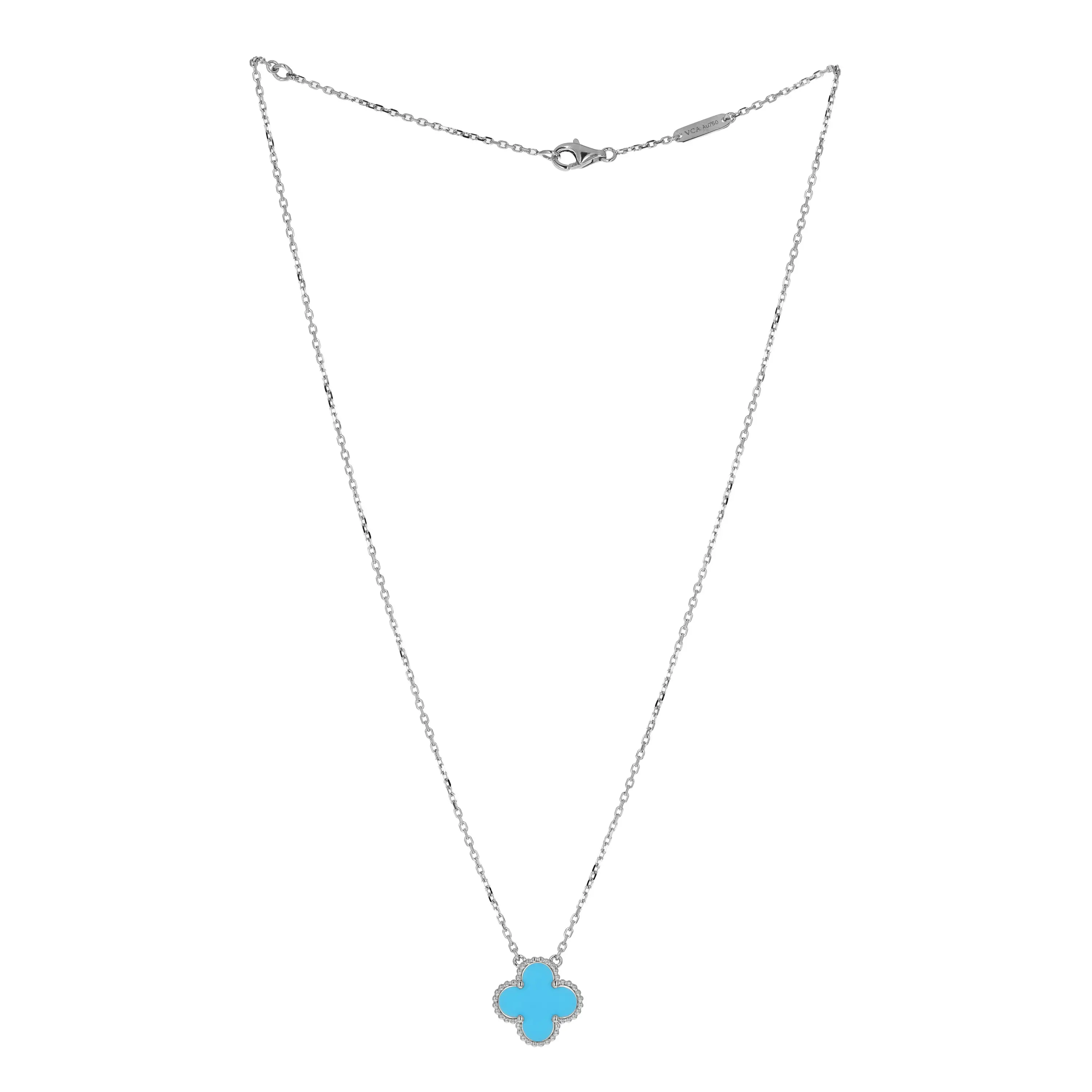 Pre-owned Van Cleef & Arpels 18k white gold and turquoise pendant necklace from the Vintage Alhambra collection. The necklace features a single signature four petal motif pendant that is set with a turquoise stone. The pendant is stationed at the center of an 18k white gold cable-link chain that measures 16.5 inches in length and is secured with a lobster clasp.