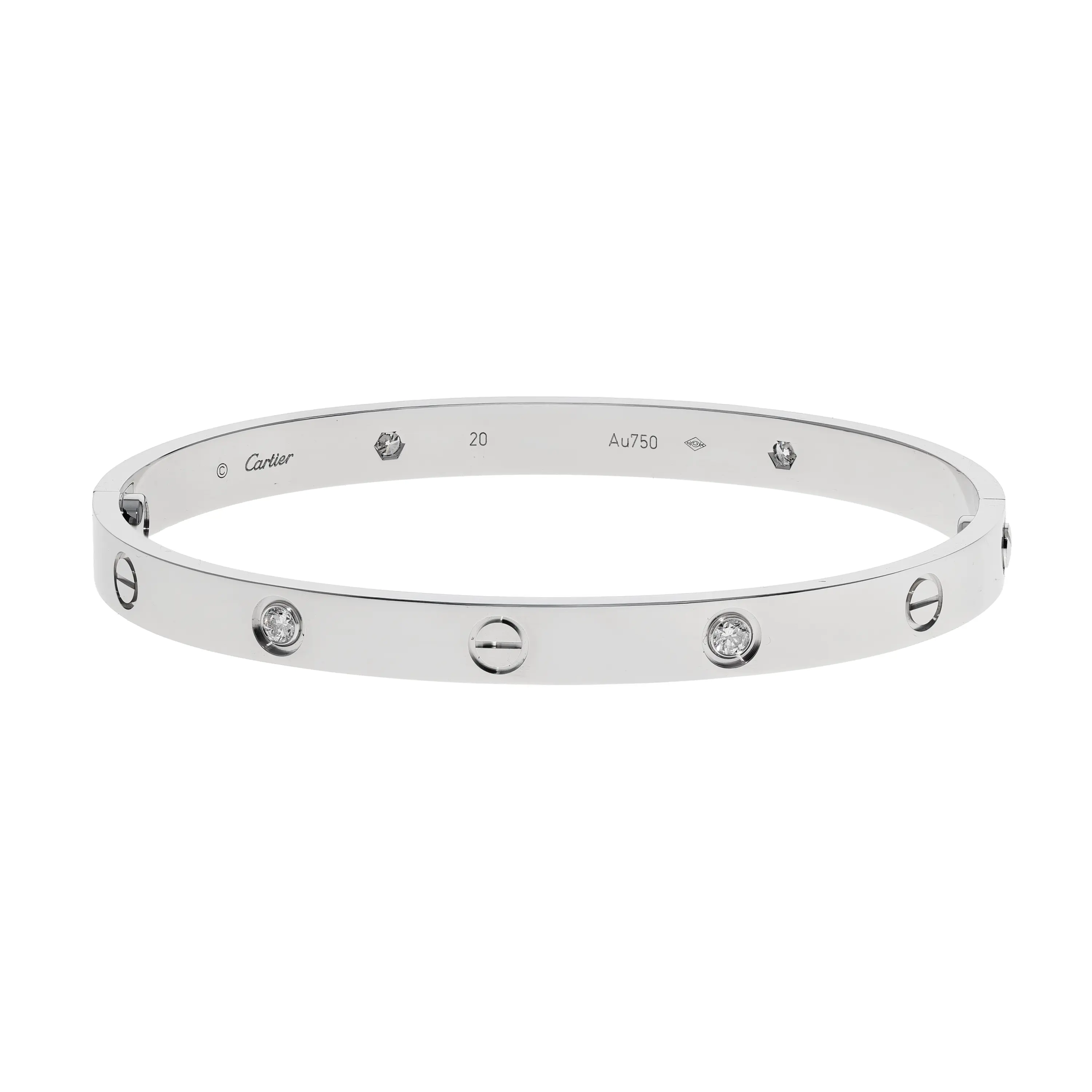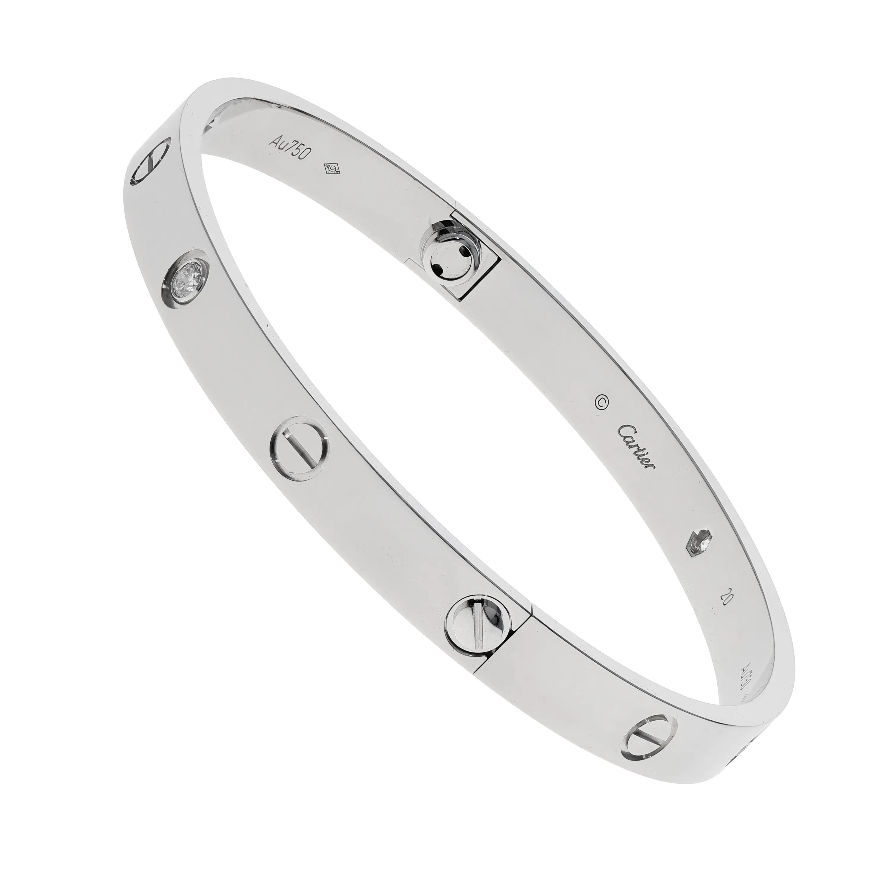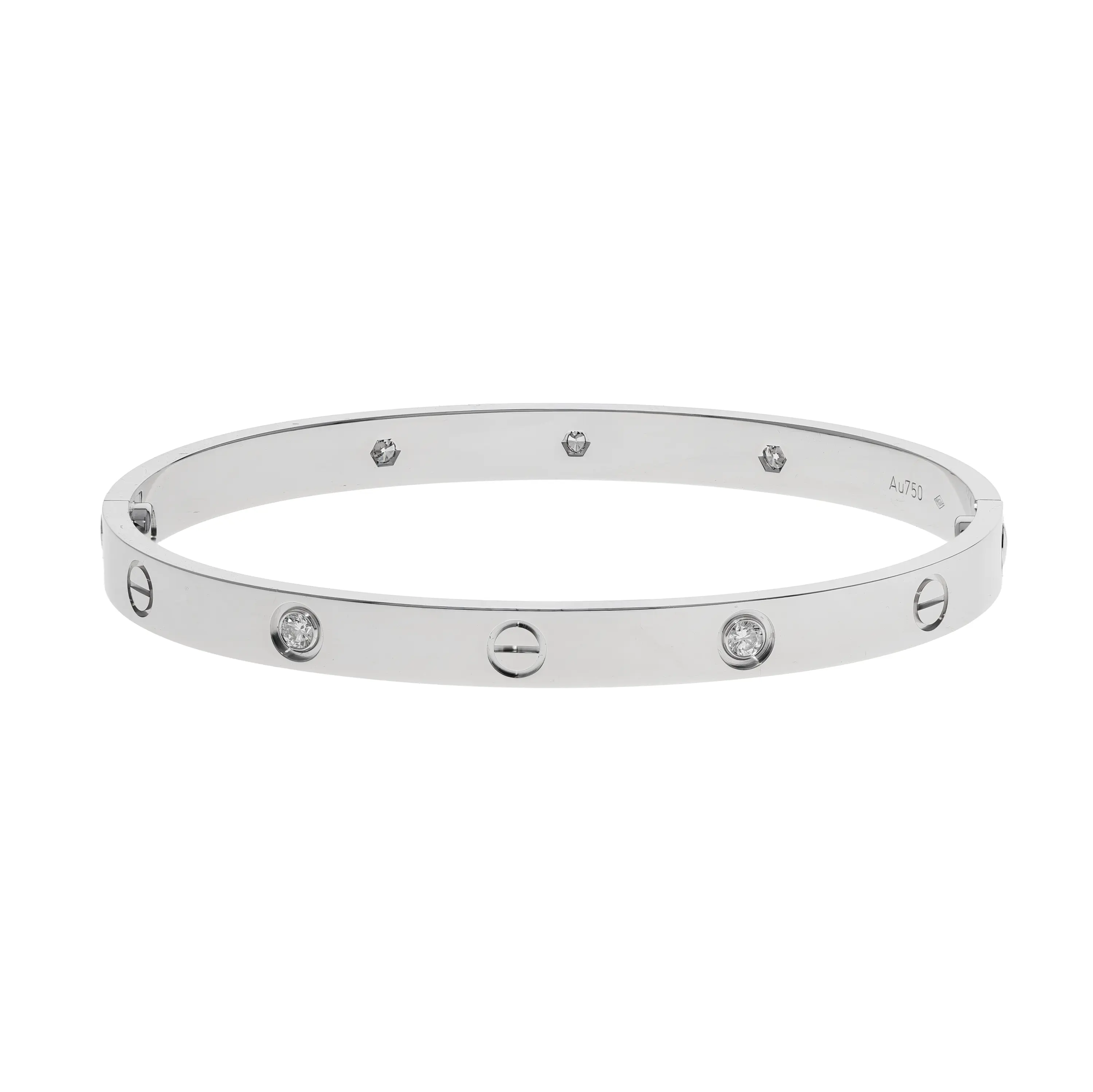Pre-owned Cartier 18k white gold bangle bracelet from the Love collection. This bracelet features round brilliant-cut diamonds bezel set and evenly spaced around the bracelet. The diamonds are alternating with the signature screw design. This piece bangle is in a size 20 and comes with the original box and papers.