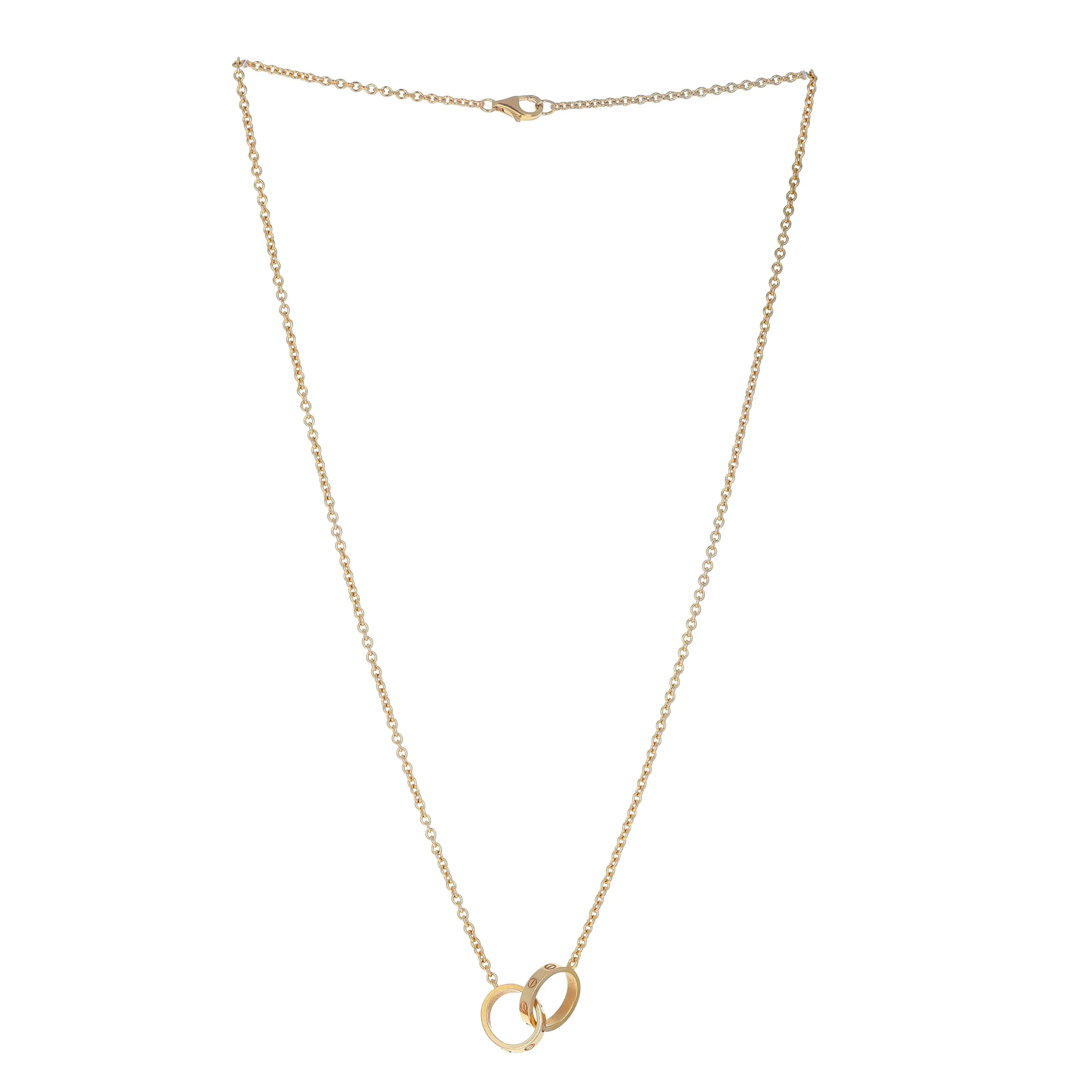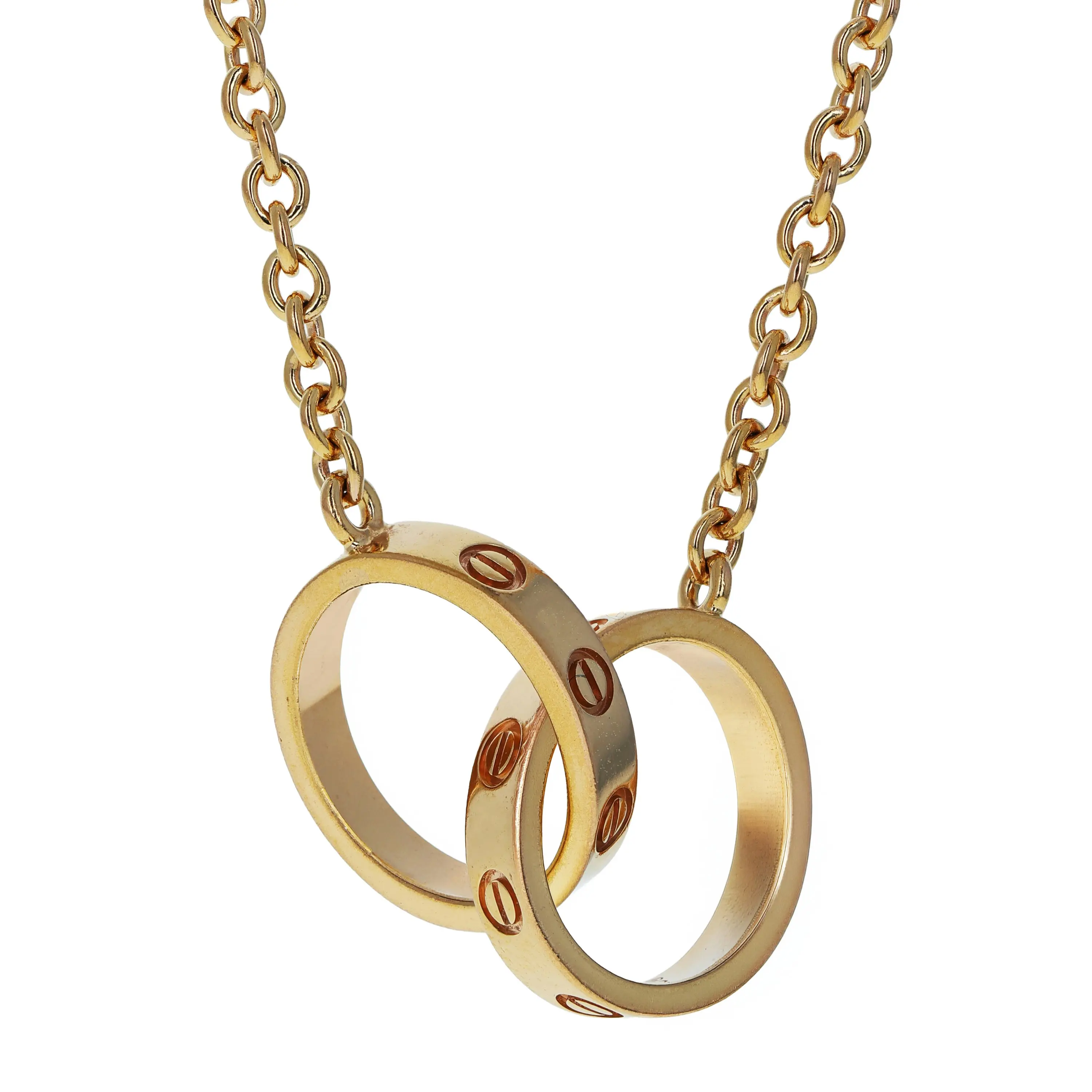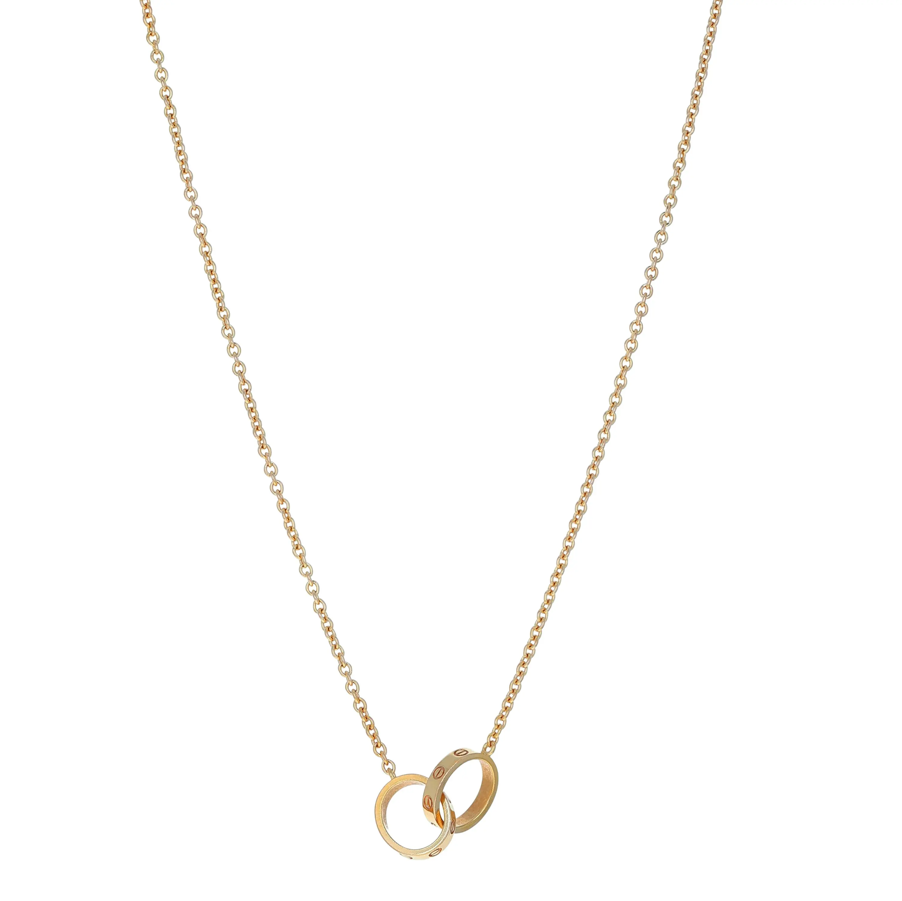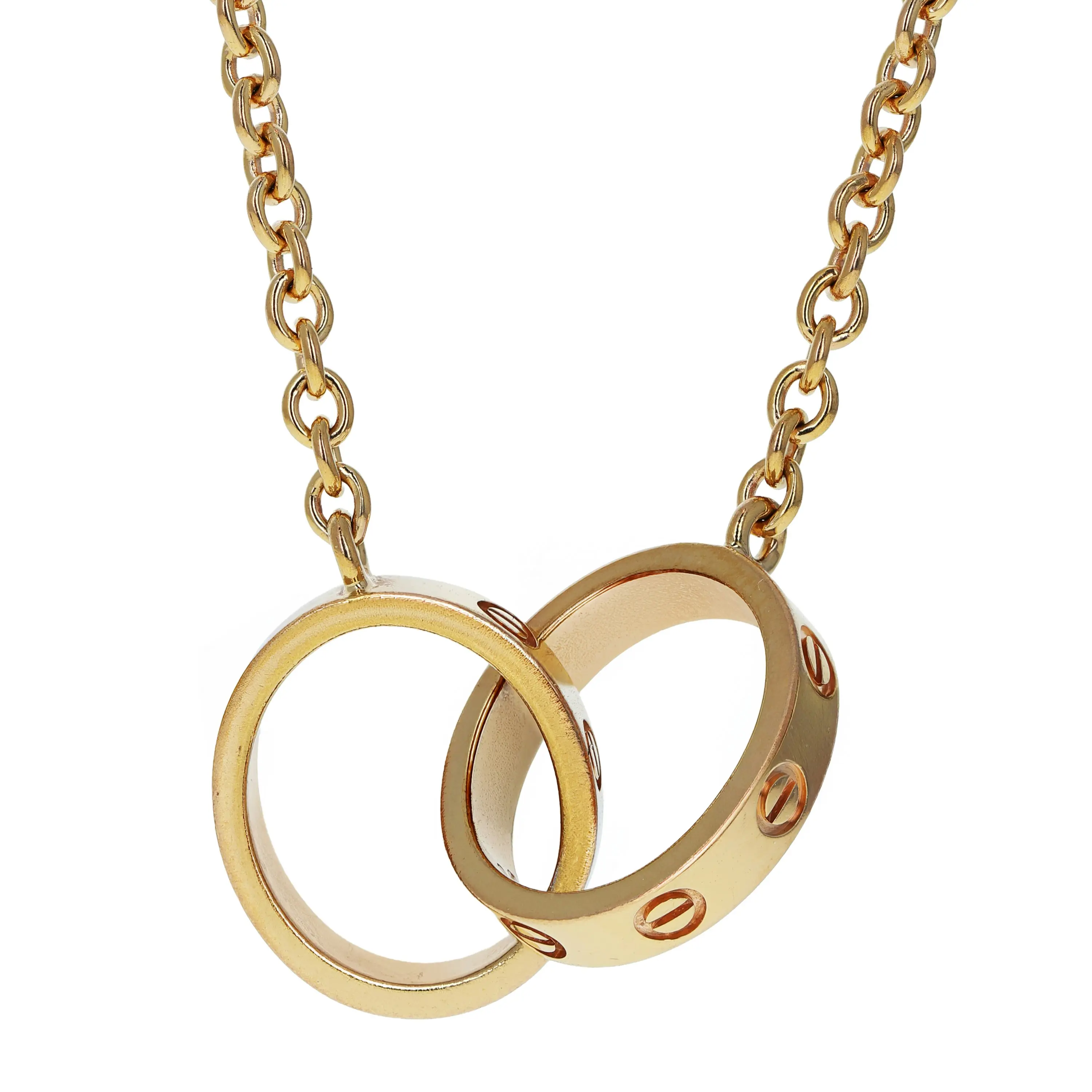 Pre-owned Cartier 18k rose gold pendant necklace from the Love collection. The neckace features two rings that are linked together and each feature the signature screw design. The pendants are stationed at the center of an 18k rose gold cable-link chain that measures 17 inches in length and is secured with a lobster clasp.