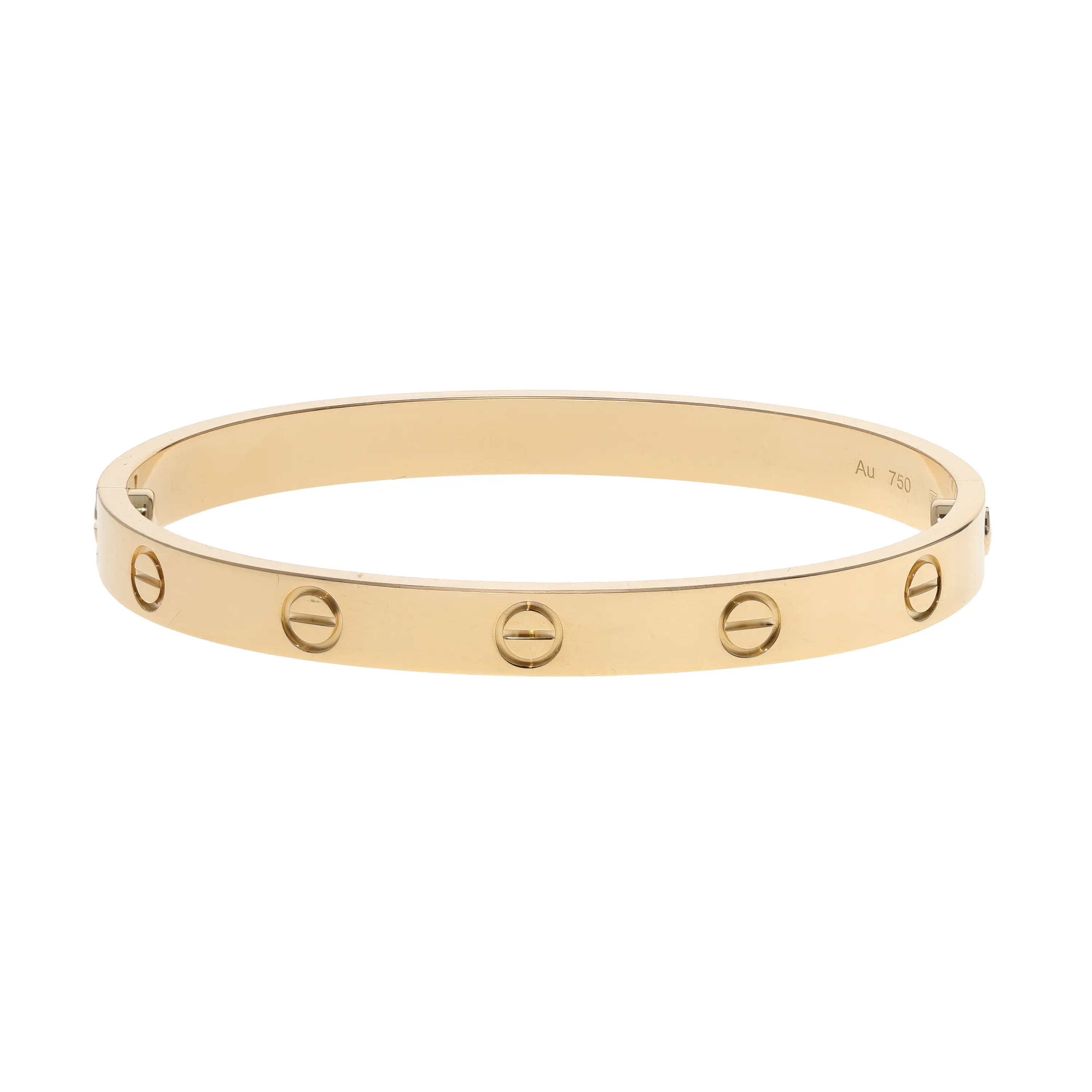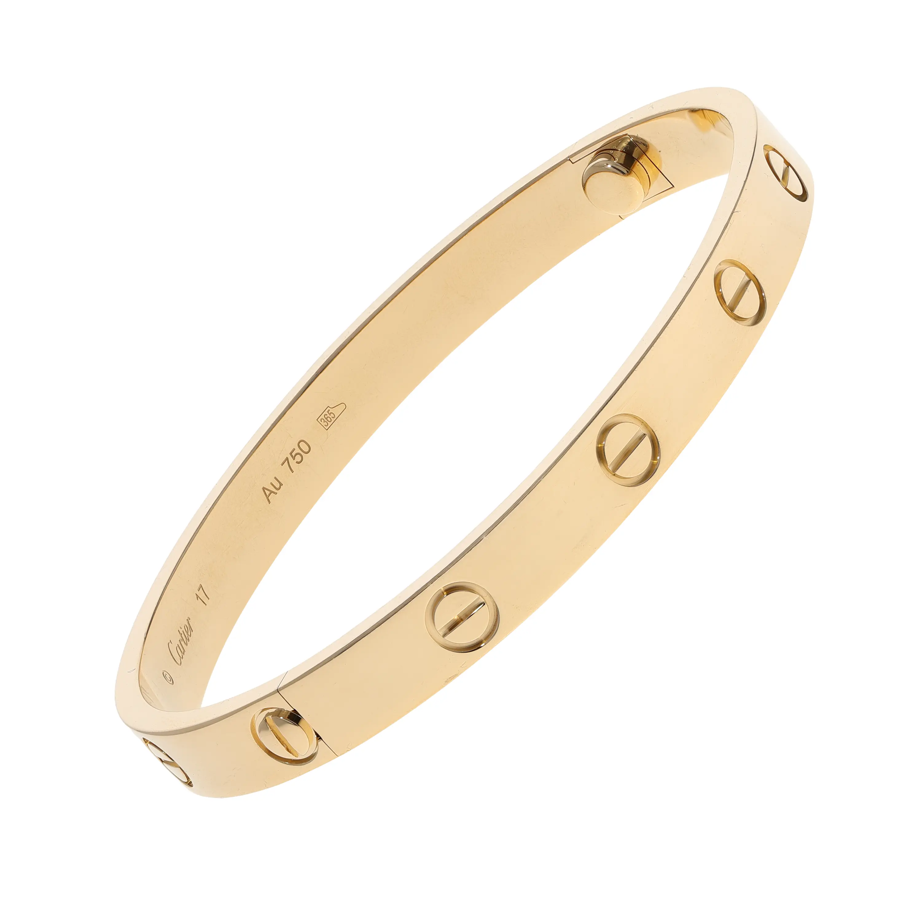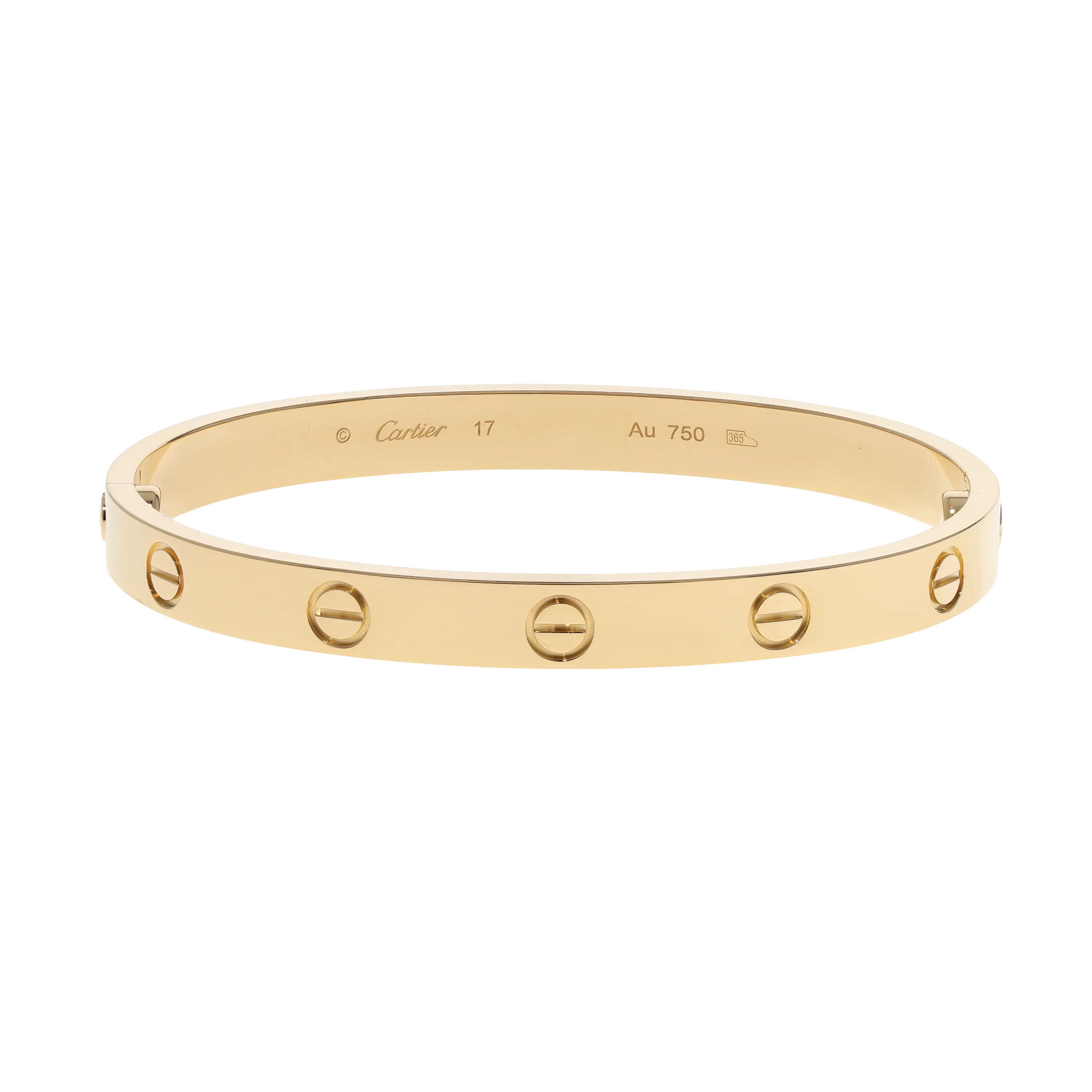 Pre-owned Cartier 18k yellow gold bangle bracelet from the Love collection. This bracelet features the signature screw design evenly spaced along the outside of the bangle. This piece is in a size 17 and comes with the original papers.