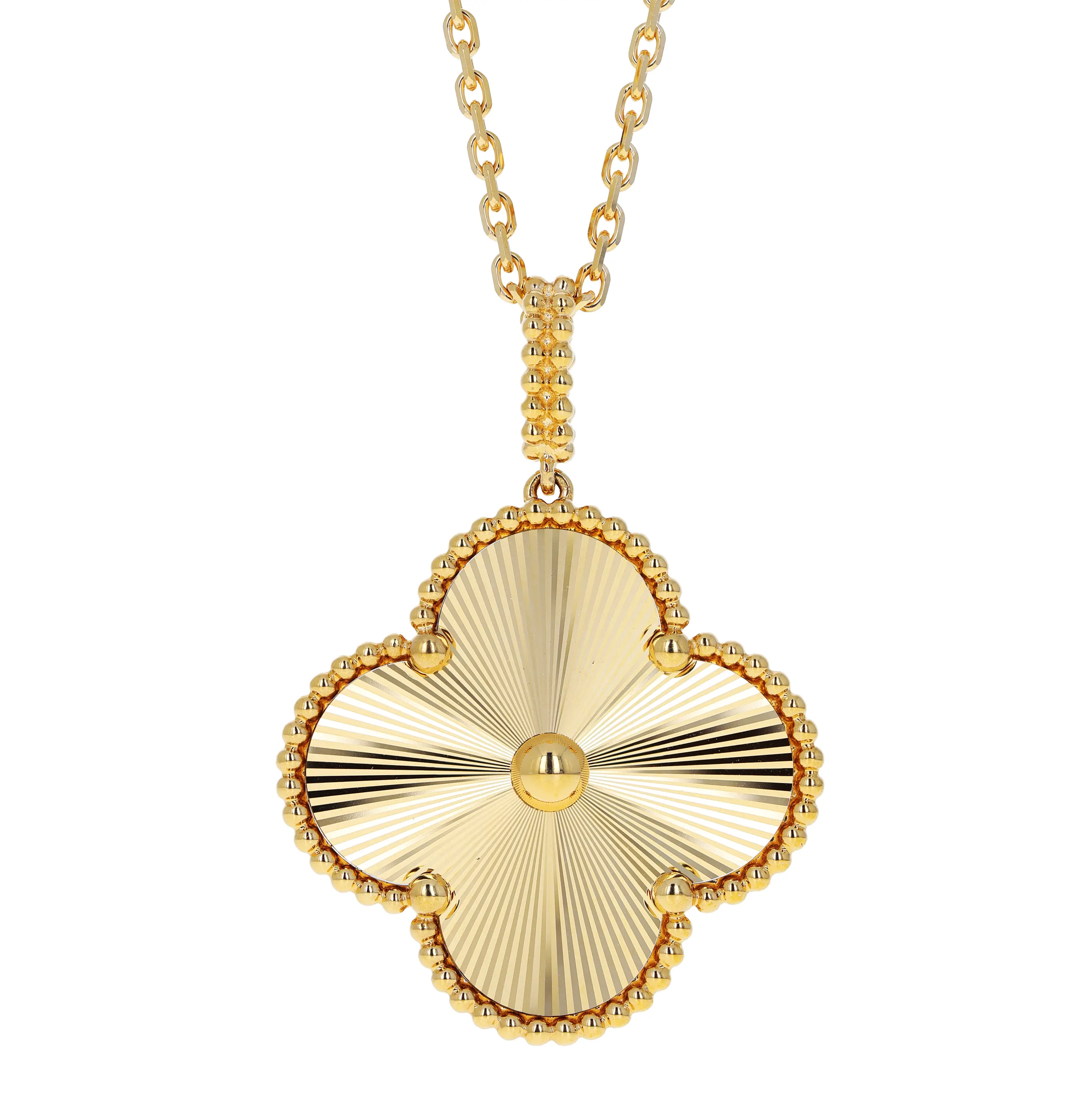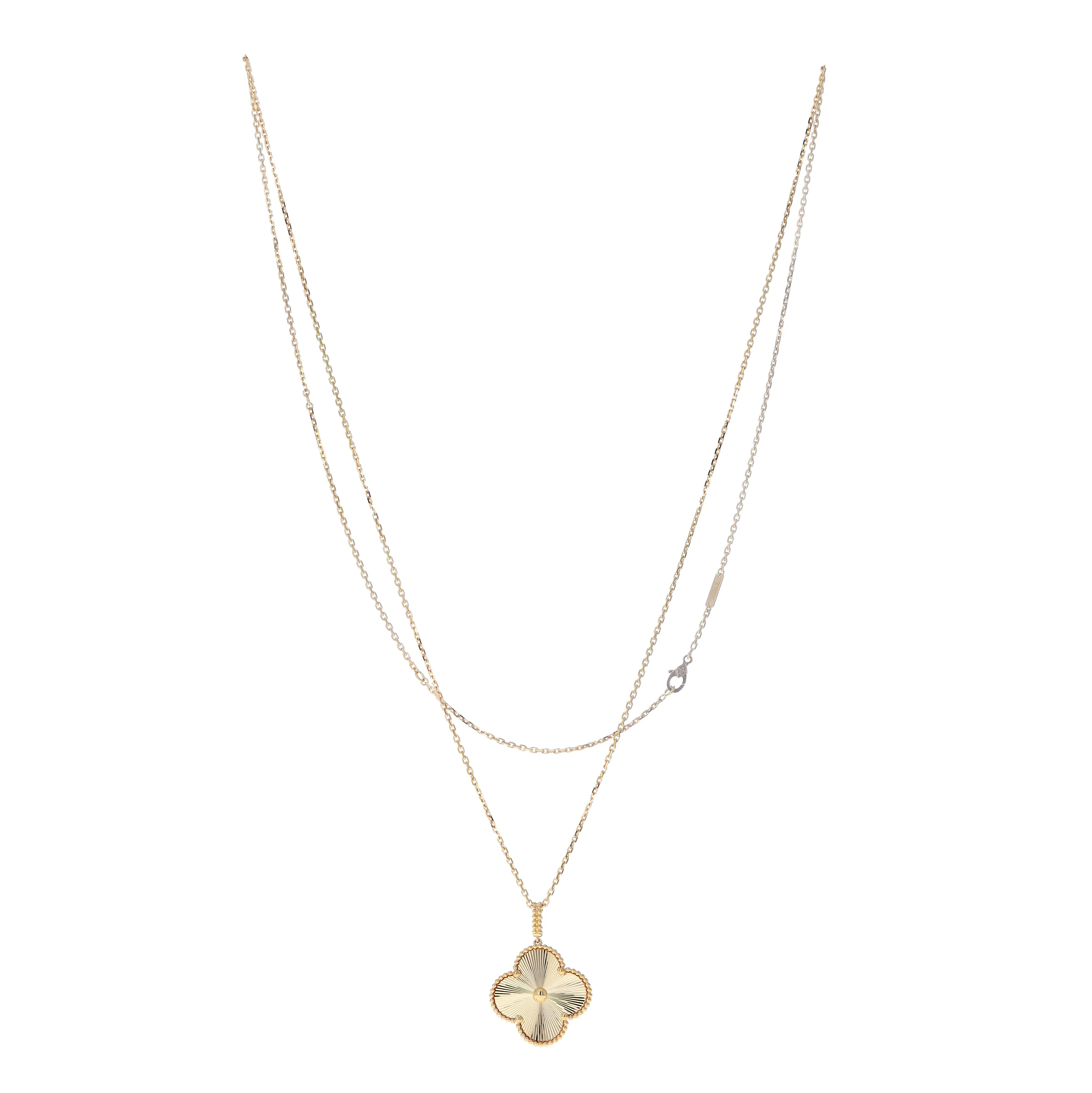Pre-Owned Van Cleef & Arpels 18k yellow gold guilloché pendant necklace from the Magic Alhambra collection. This necklace features a single large signature four petal motif pendant with a guilloché texture that slides on an 18k yellow gold oval link chain. This chain measures 36 inches in length and is finished with a lobster clasp. This piece comes with the original papers.