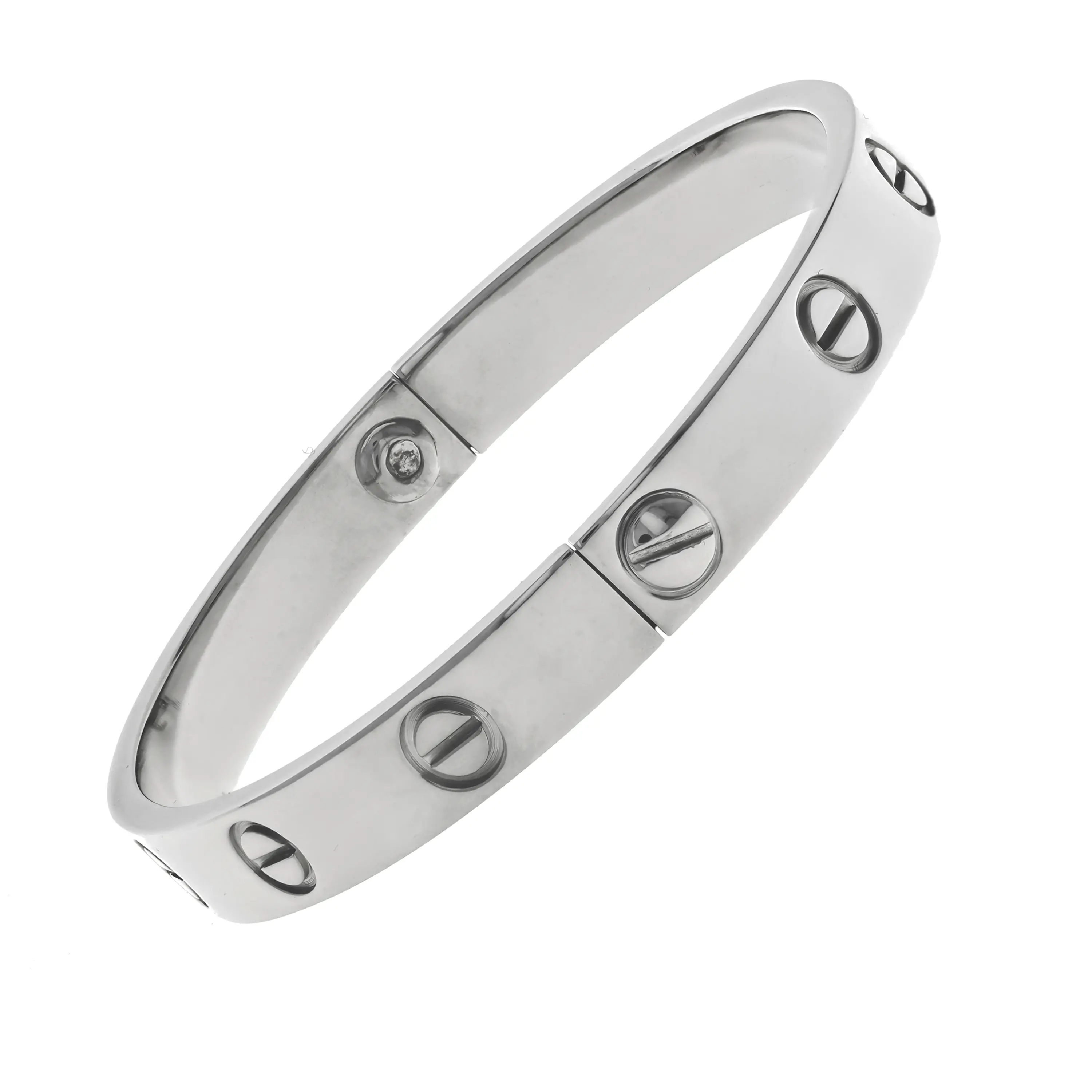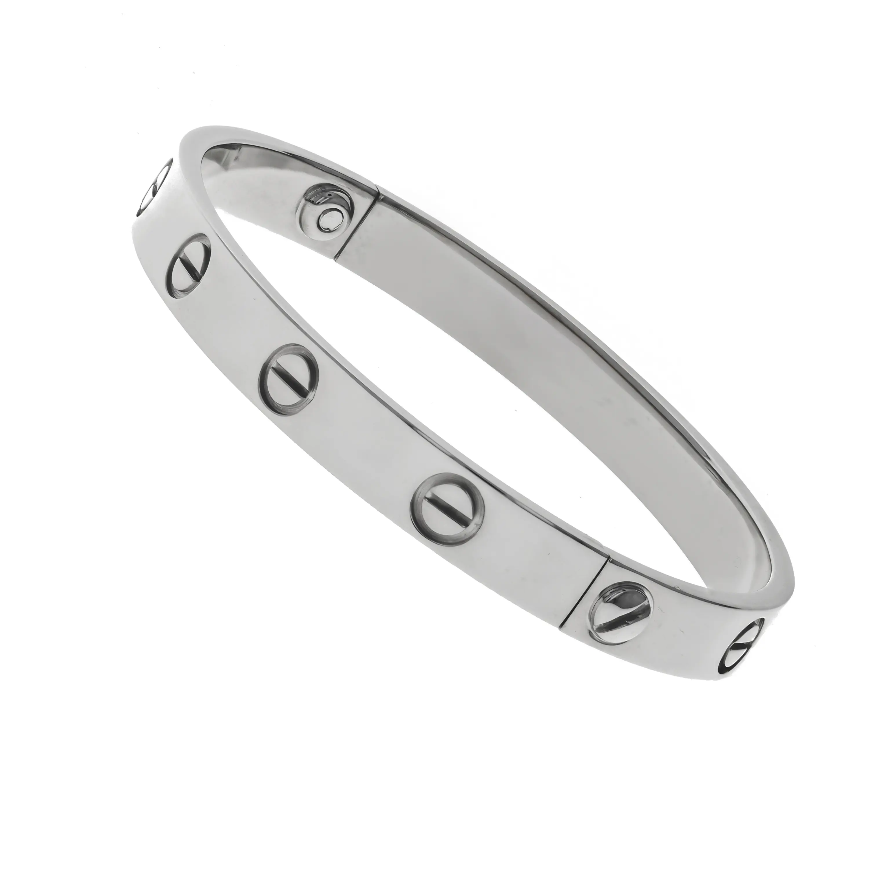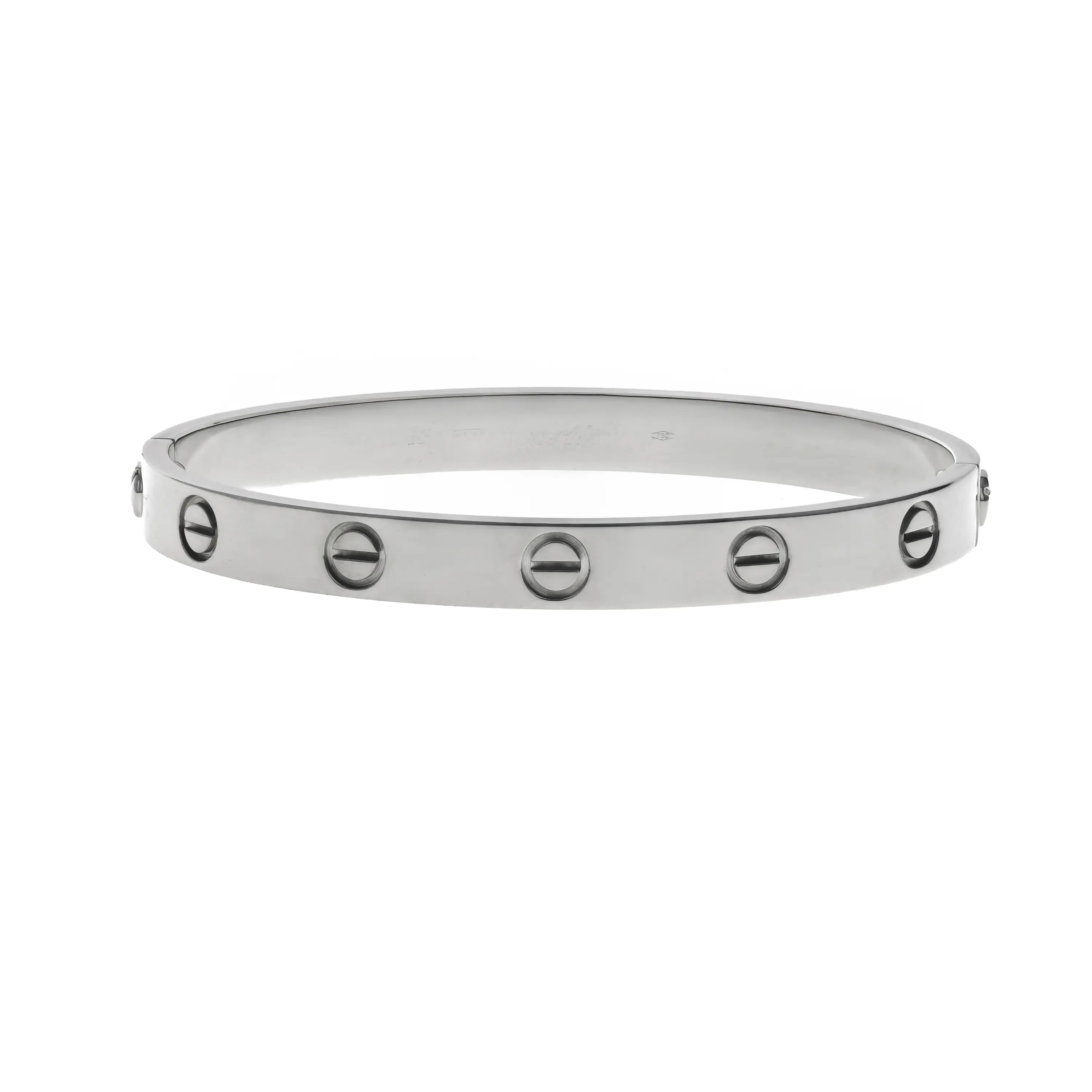 A pre-owned Cartier Love bracelet in 18 karat white gold. This bracelet features the removeable screw design and is a size 16.