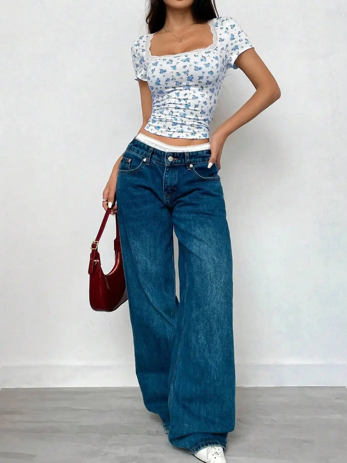 Summer Casual Floral Lace-Trimmed T-Shirt Pattern Women's Top, Slim Fit Cropped T-Shirt, Suitable for Daily Casual Outings, blue floral short sleeve