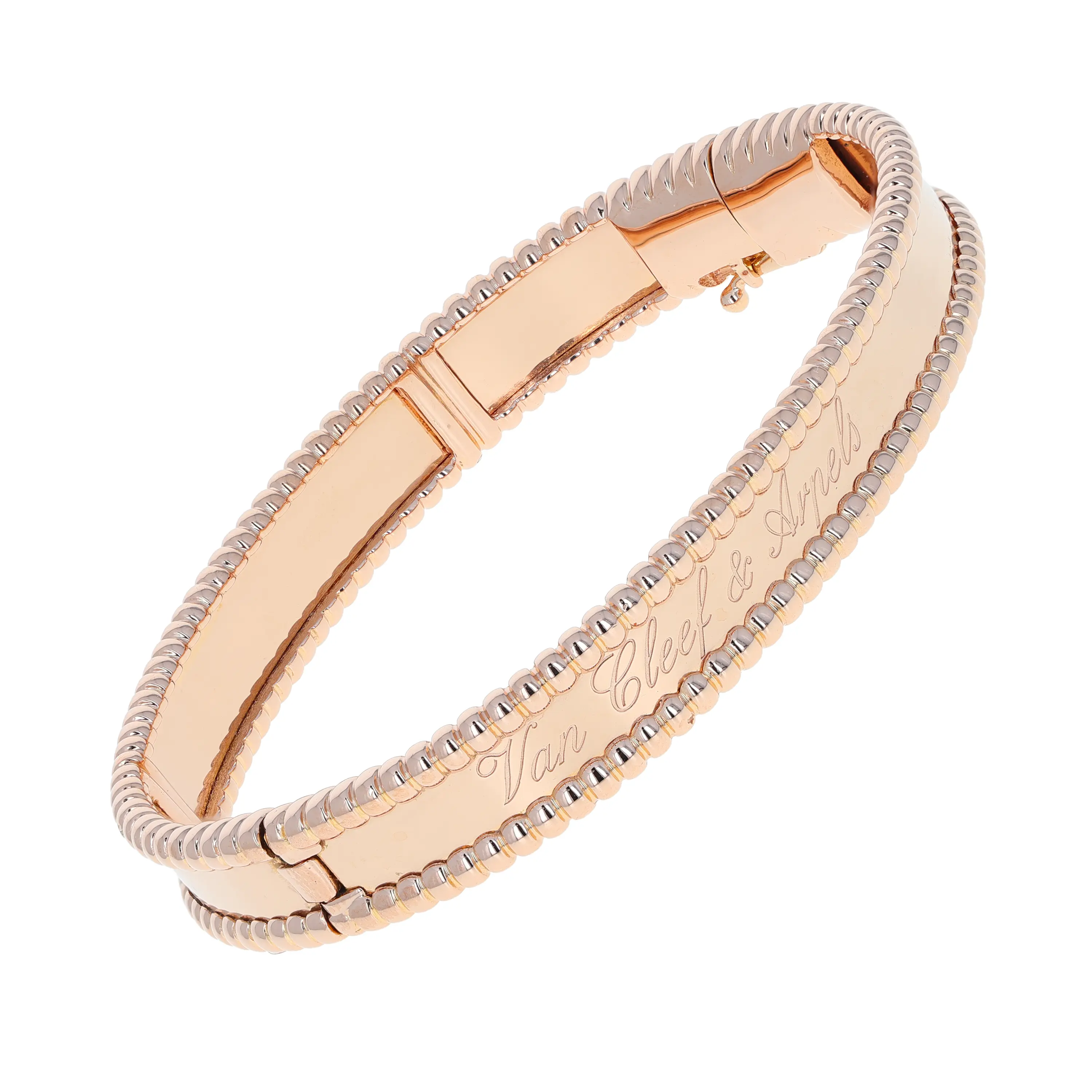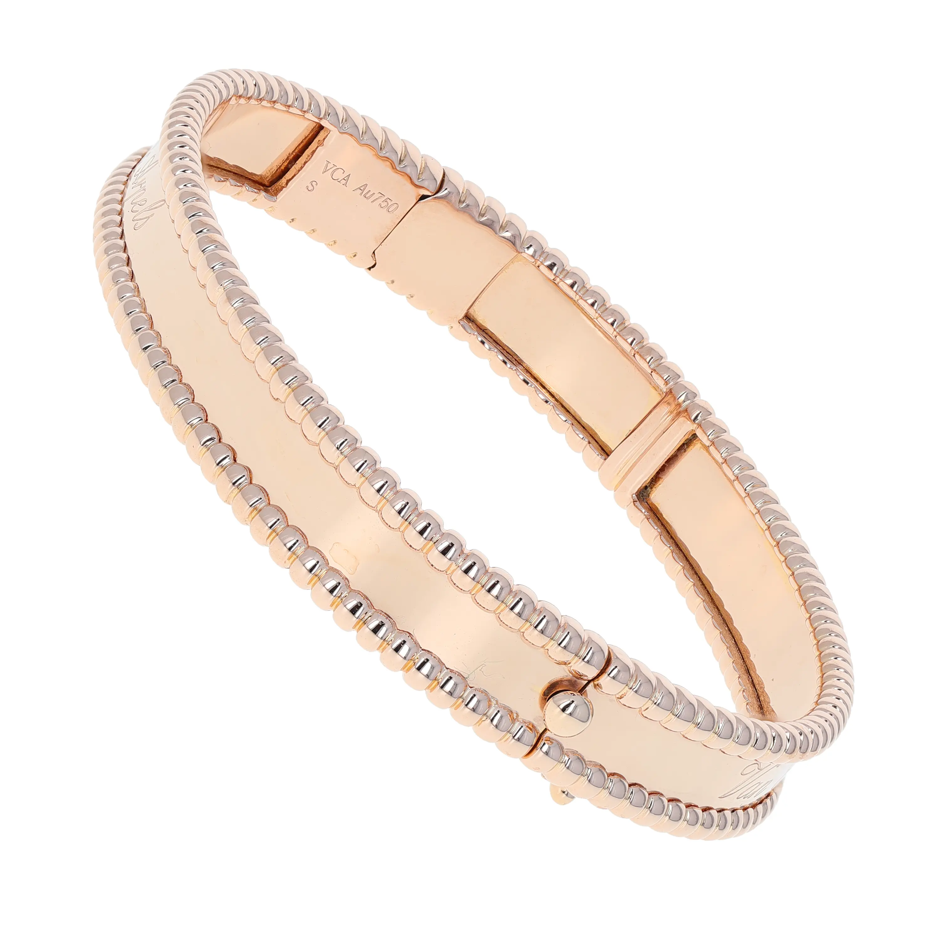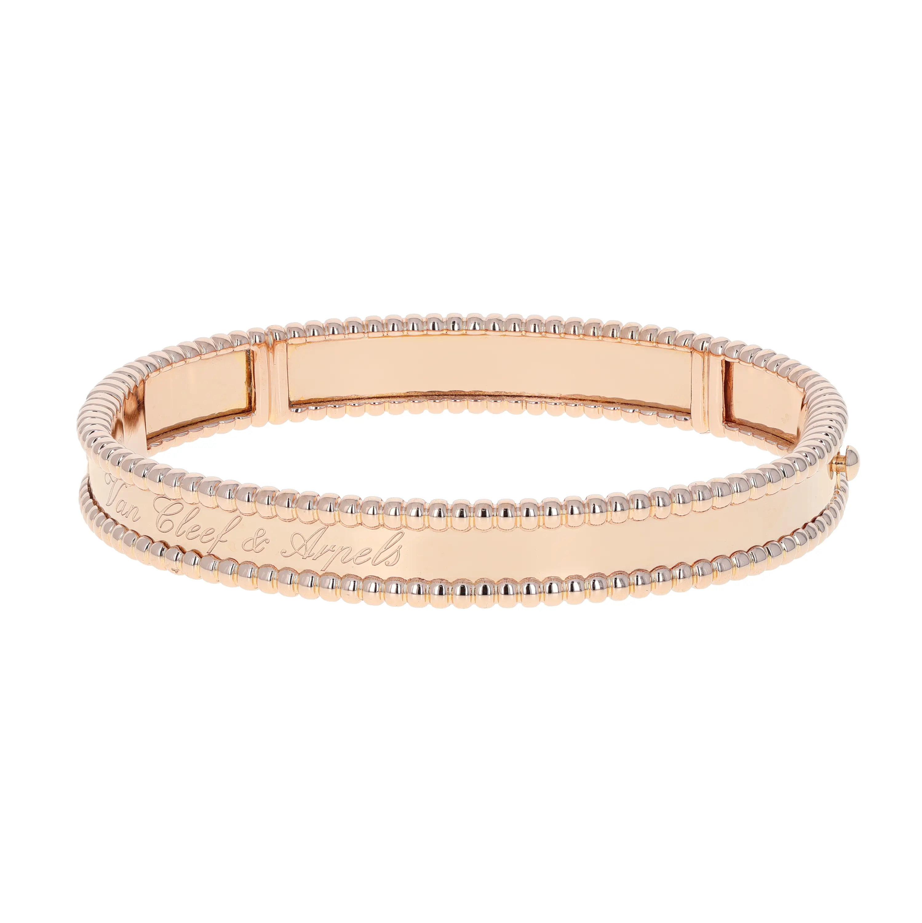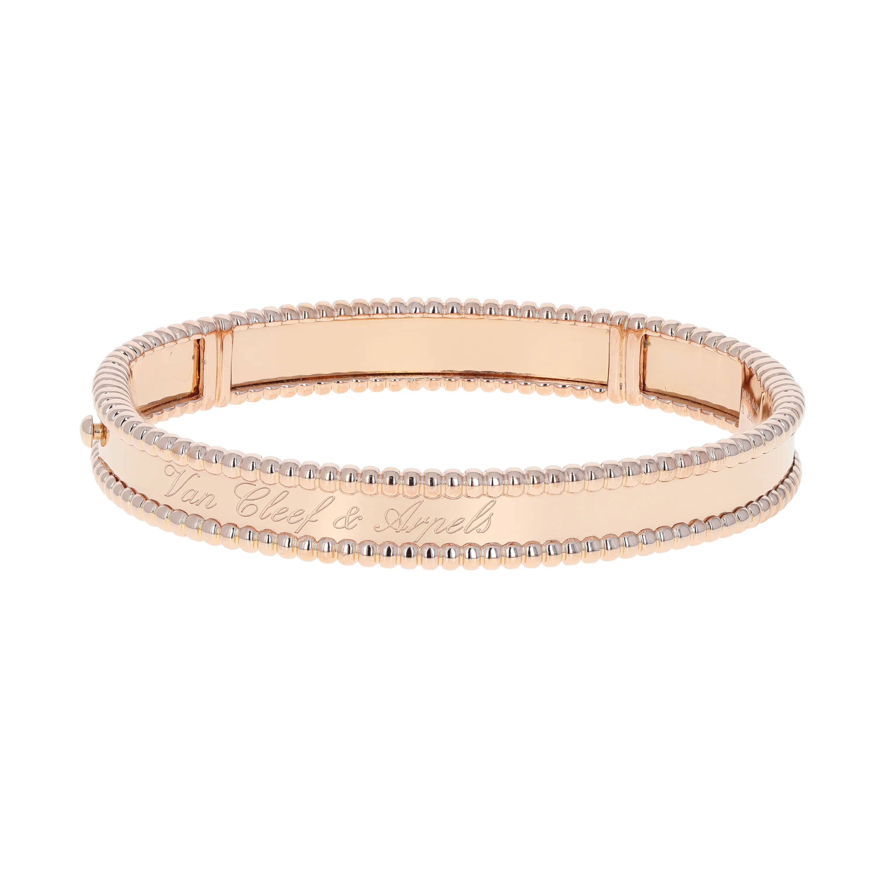 Pre-owned Van Cleef & Arpels 18k rose gold bangle bracelet from the Perlee collection. This bracelet features a polished center band, framed by the signature beaded edging that encircles the full bangle. The interior center is delicately engraved in script with "Van Cleef & Arpels". This bangle is secured with a hinged, hidden box clasp and comes with the original VCA papers.