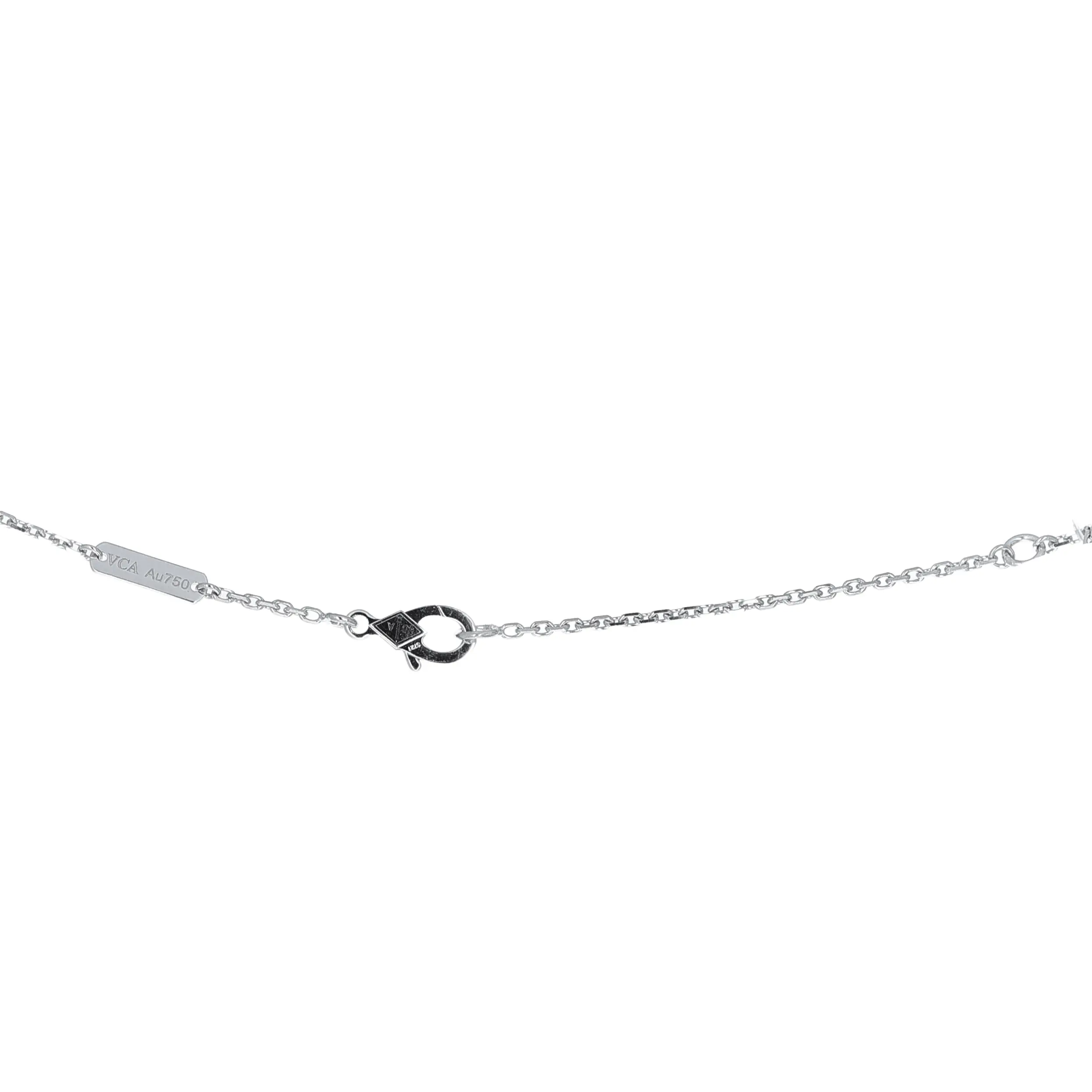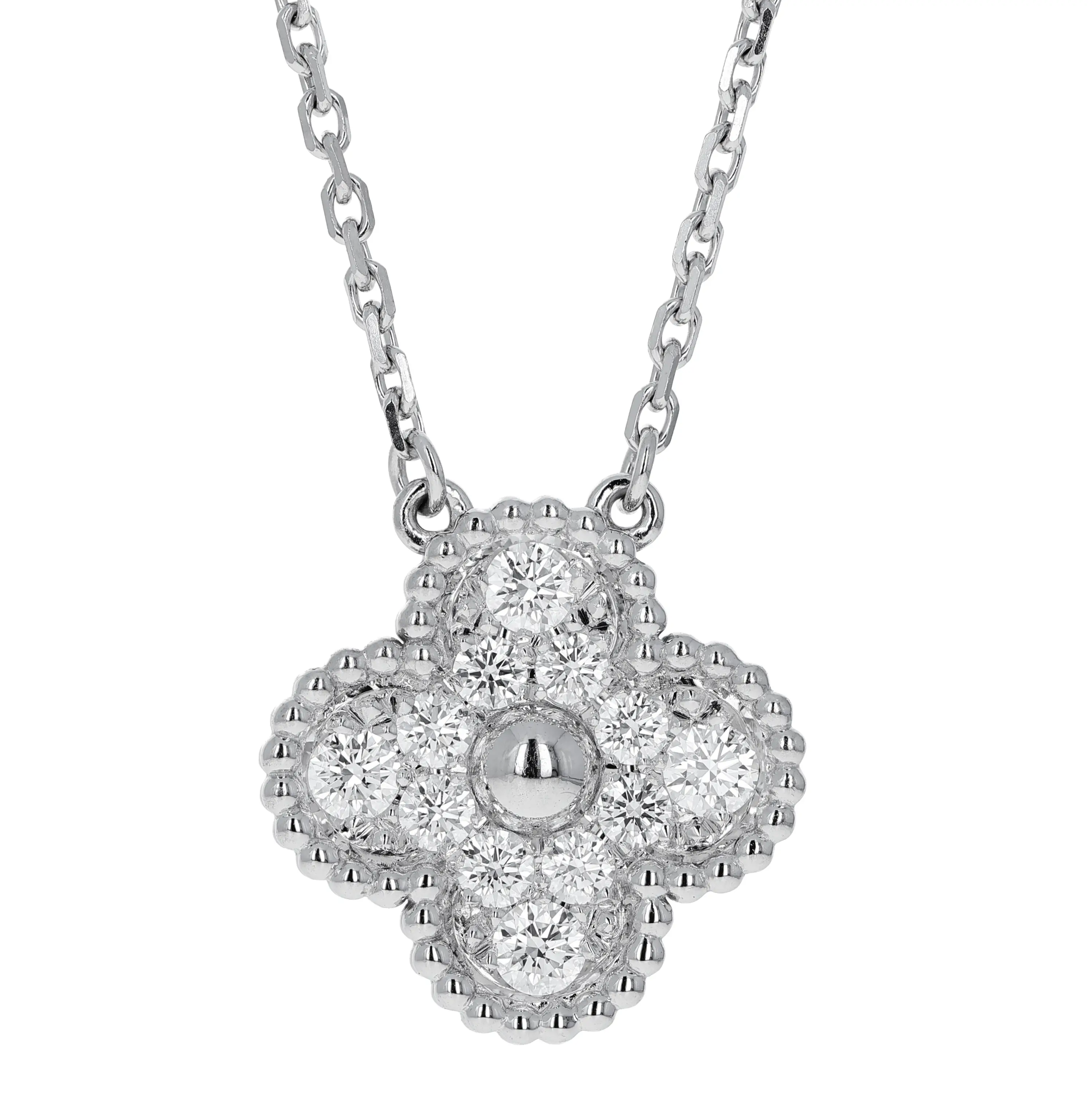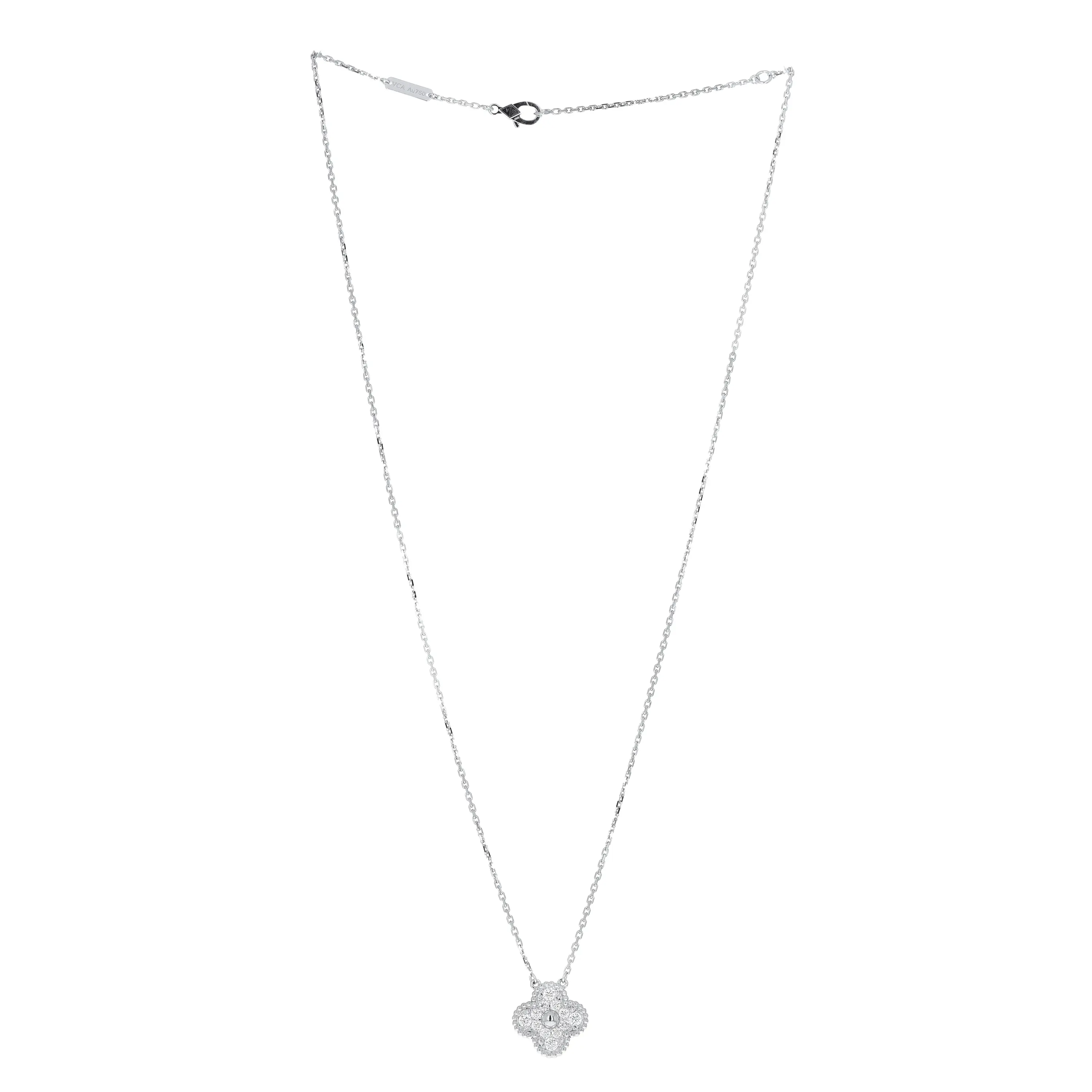 Pre-owned Van Cleef & Arpels 18k white gold and diamond pendant necklace from the Vintage Alhambra collection. This necklace features a single signature four petal motif with pave-set round brilliant diamonds. The pendant is stationed at the center of an 18k white gold cable-link chain that is secured with a lobster clasp. This piece comes with the original papers.