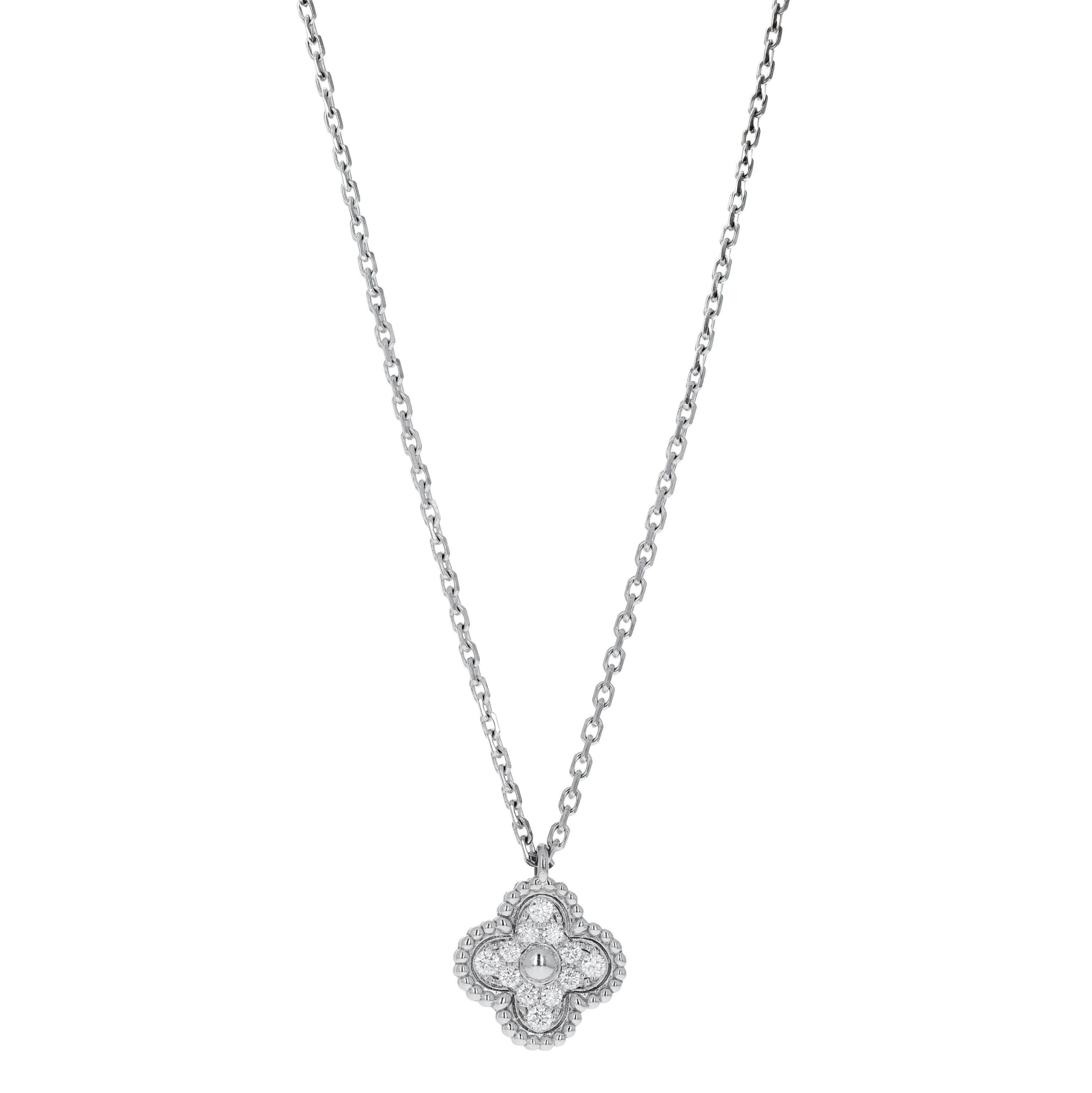Pre-owned Van Cleef & Arpels 18k white gold and diamond pendant necklace from the Sweet Alhambra collection. This necklace features a single signature four petal motif pendant that is pave-set with round brilliant diamonds. The pendant is sliding on an 18k white gold cable-link chain that measures 15.75 inches in length and is secured with a lobster clasp.