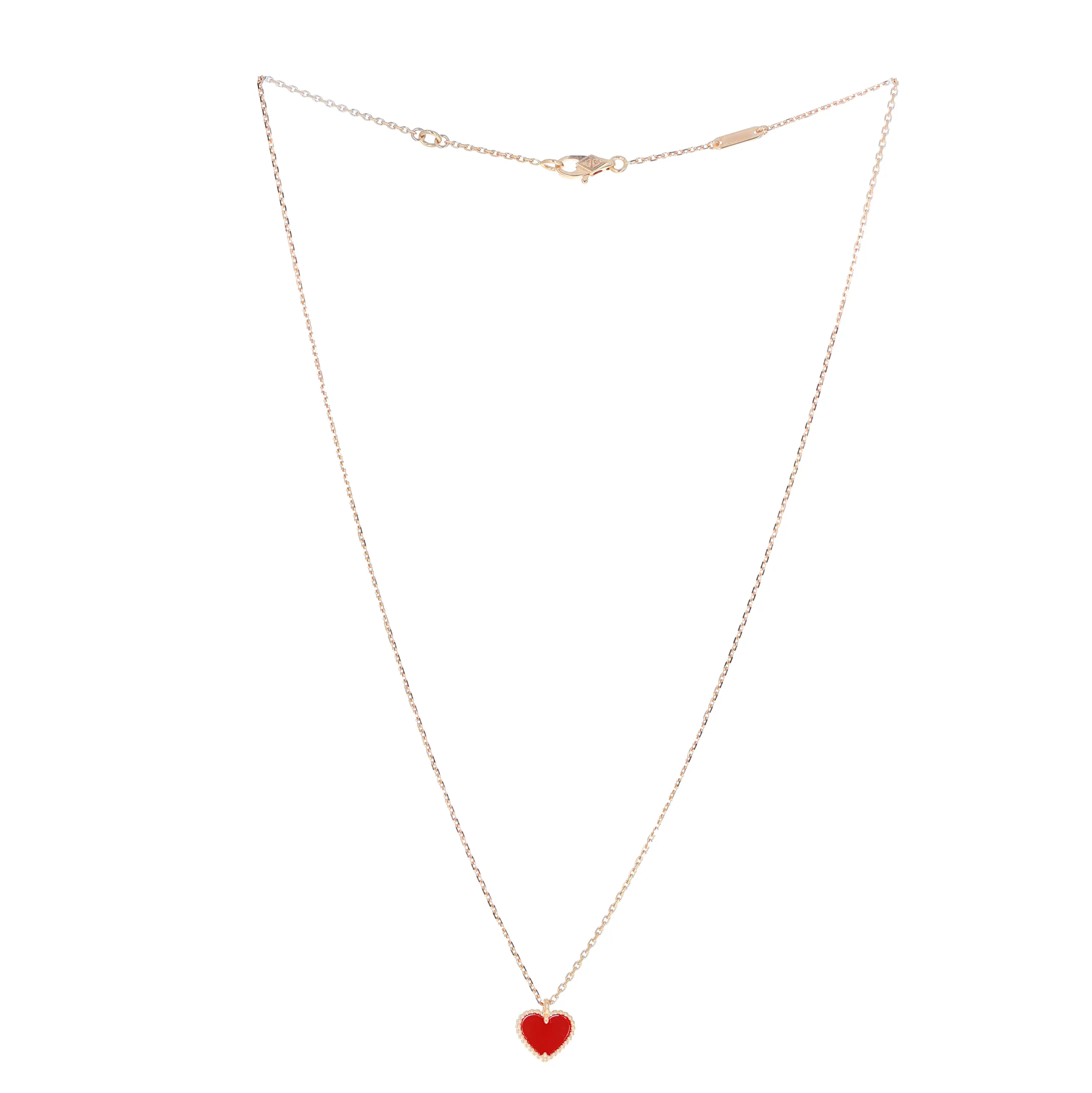 Pre-owned Van Cleef & Arpels 18kt rose gold and carnelian pendant necklace from the Sweet Alhambra collection. This necklace features a single heart-shaped motif set with a carnelian stone. The heart pendant is sliding on a cable link chain that is 16 inches in length and is secured with a lobster clasp.