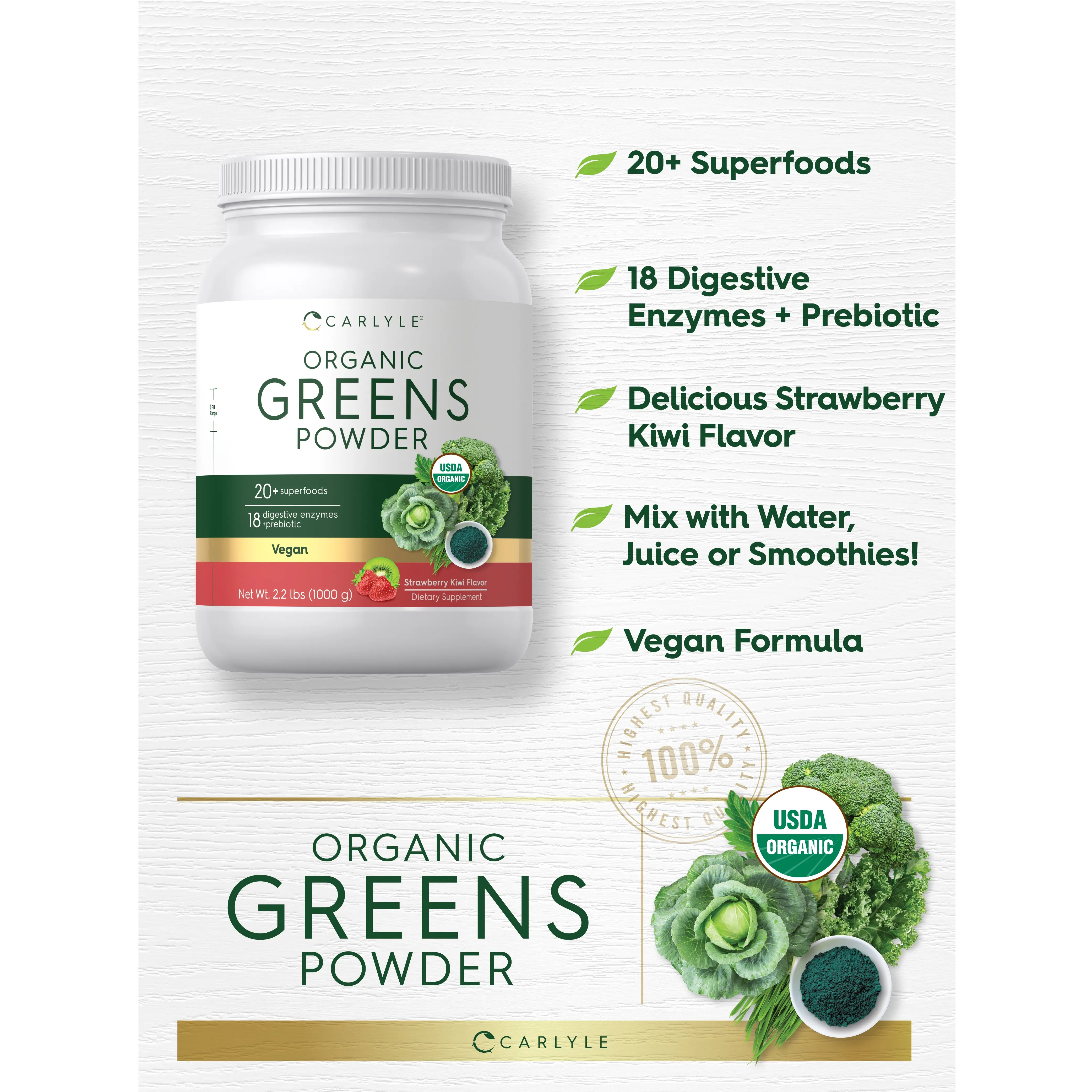 Our expertise in sourcing the purest ingredients combined with advanced technologies makes us proud to deliver premium, honest supplements at the best value. Carlyle Organic Greens Powder is a testament to our commitment to excellence, made with powerful ingredients rooted in wellness. Thanks for choosing us in your pursuit of living healthy.