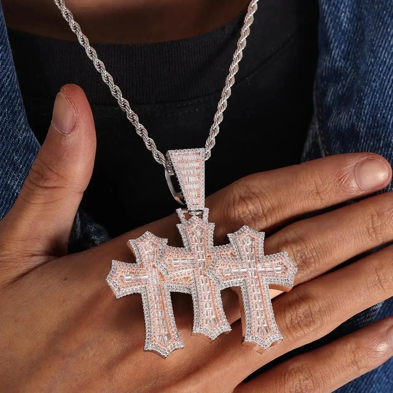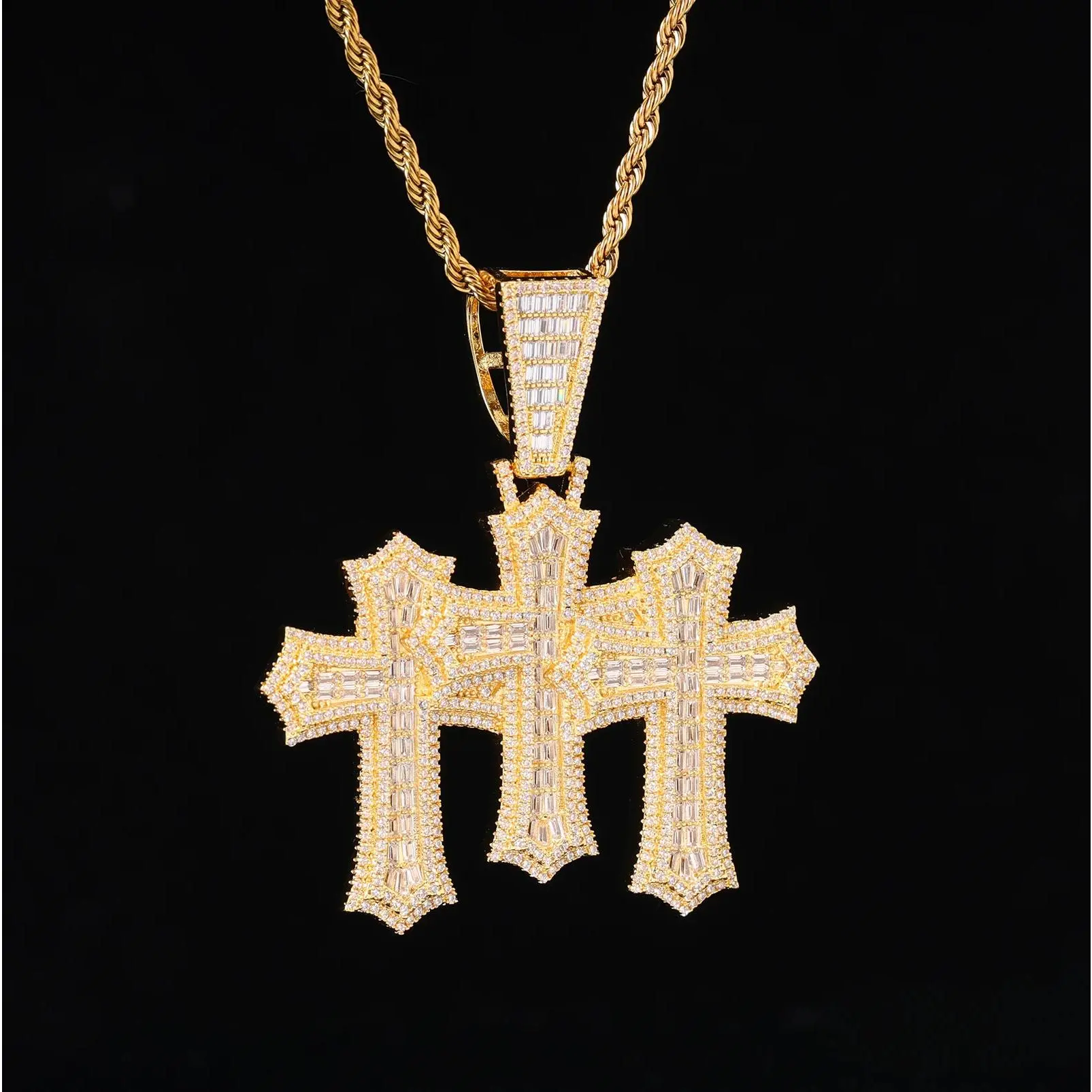 Iced Out New Fashion Baguette Triple Cross Clustered Pendant High Quality Triple Micro Pave Bling CZ Charm Pendant Necklace for Men