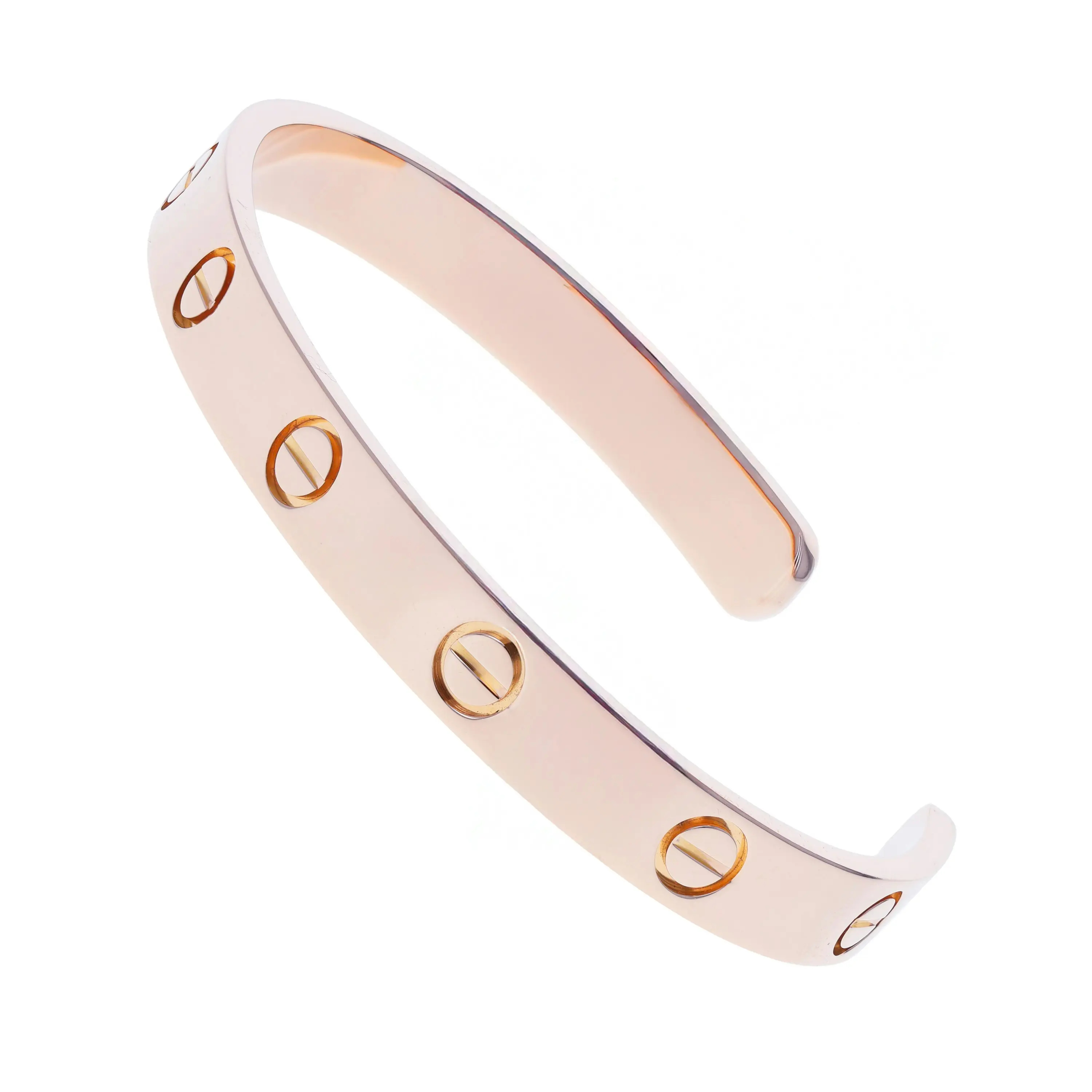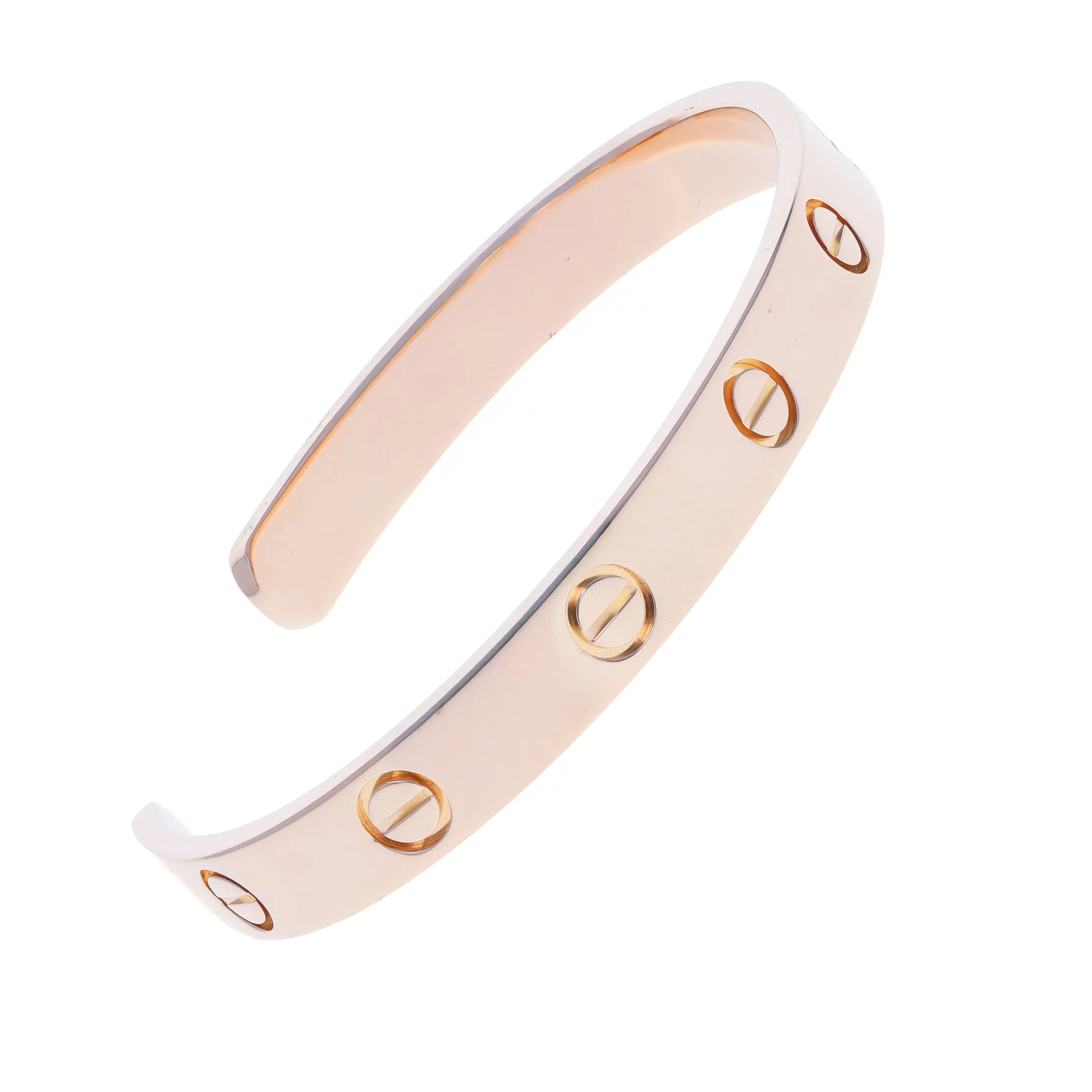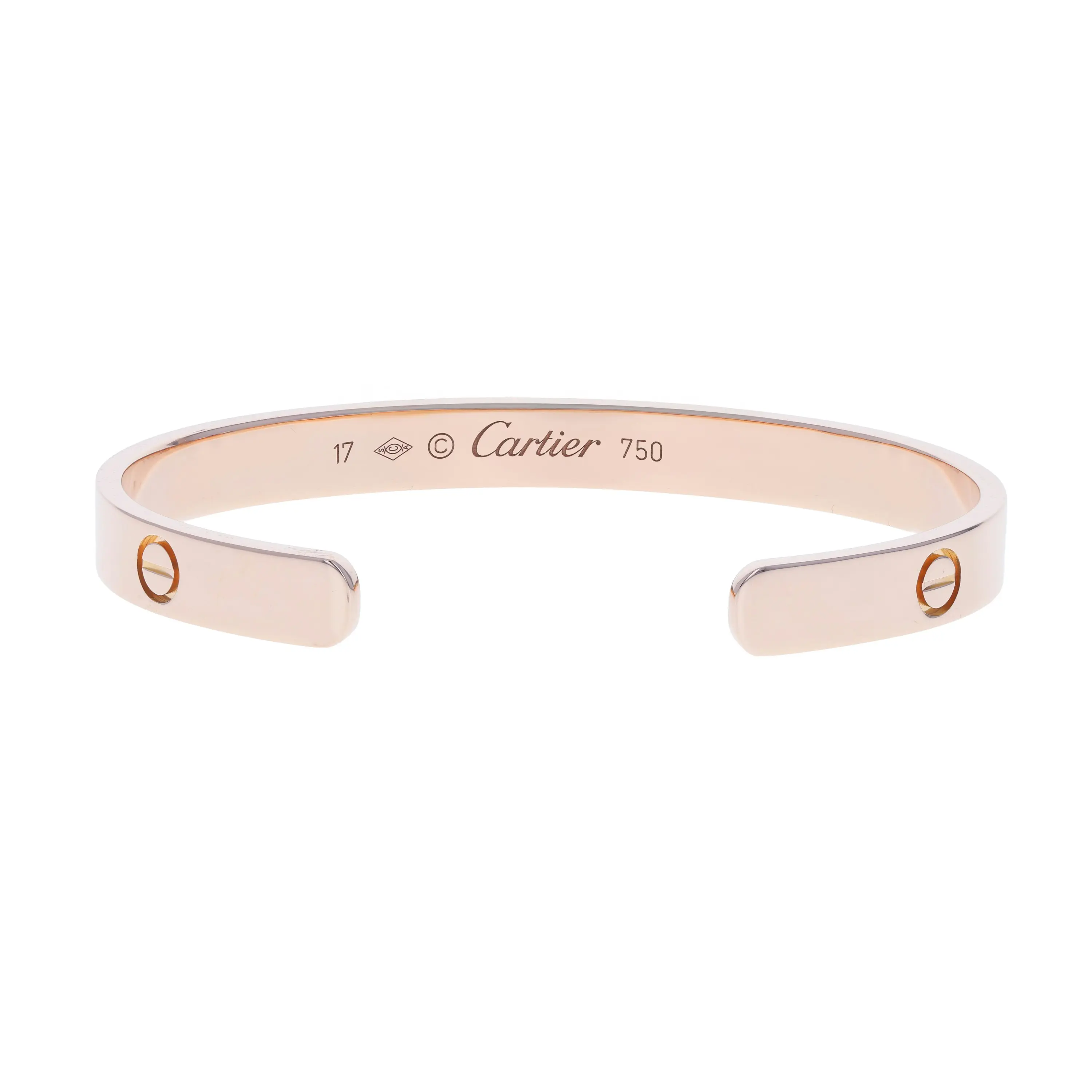 Pre-owned Cartier 18k rose gold cuff bracelet from the Love collection. The bracelet features the signature screw design evenly spaced around the outside of the cuff. This piece is in a size 17.