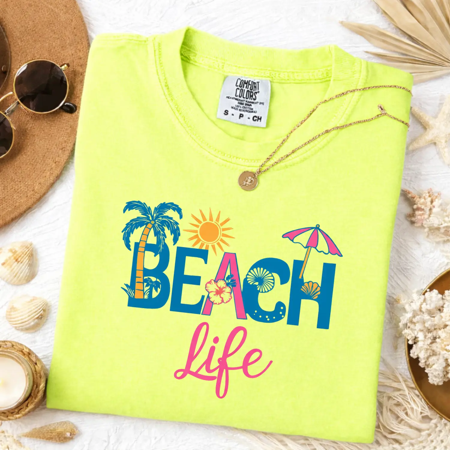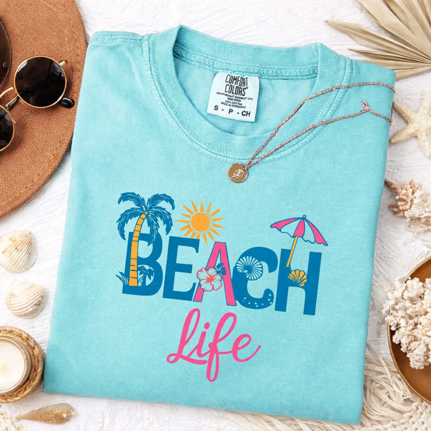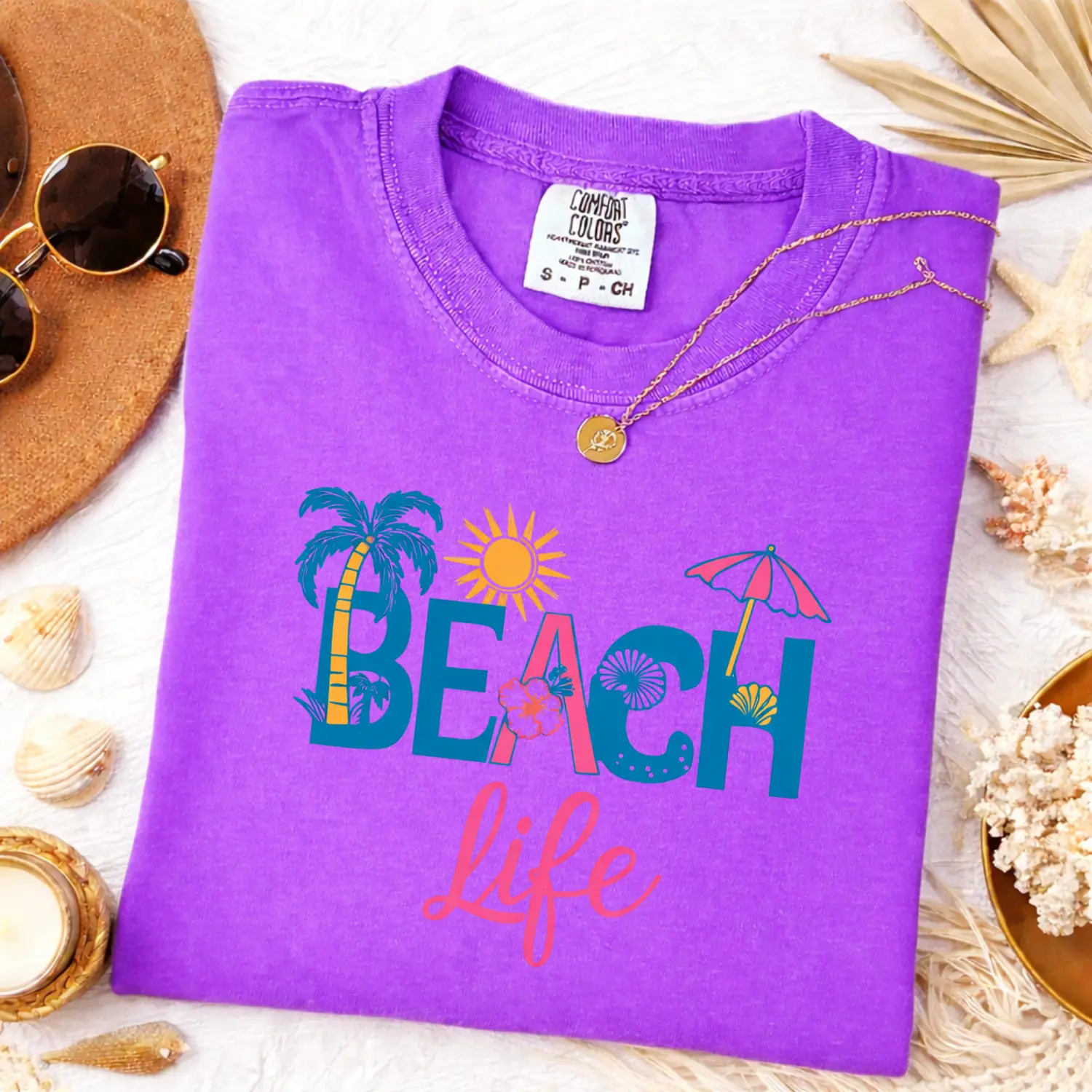 This Comfort Colors tee features bold “BEACH LIFE” lettering with tropical icons like palm trees, sunshine, seashells, and umbrellas — giving fun, carefree summer vibes that instantly stand out.