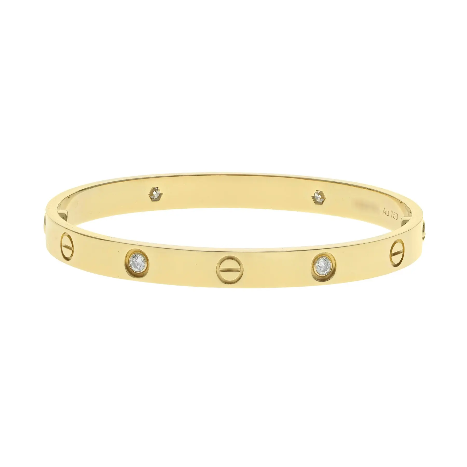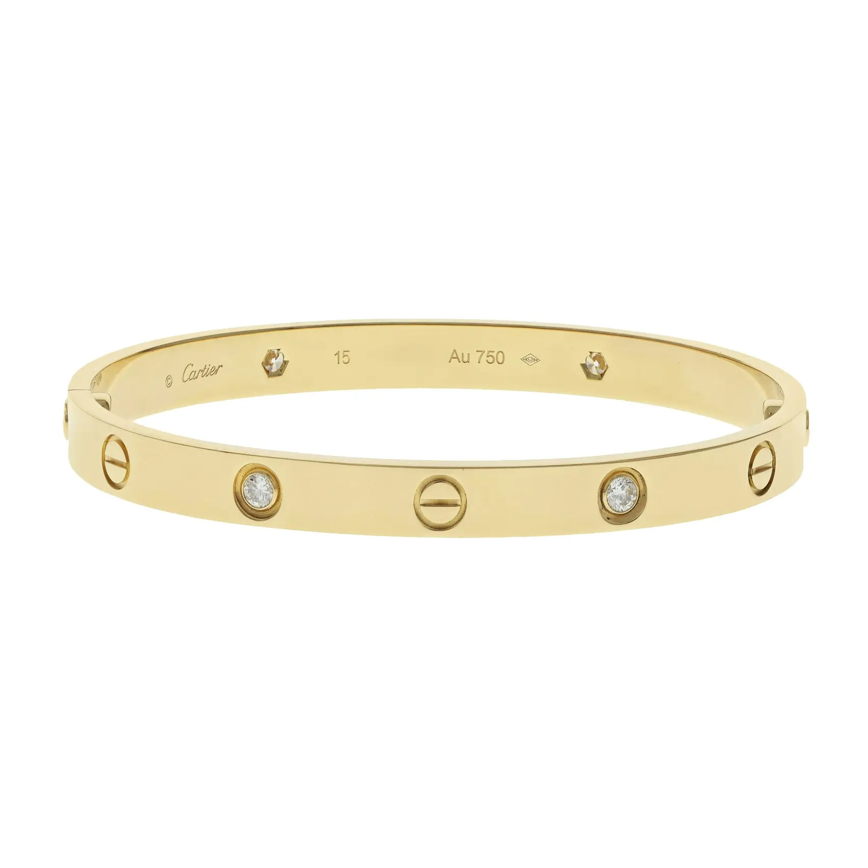 A pre-owned Cartier 4 diamond Love bracelet in 18 karat yellow gold. This bracelet features four round brilliant cut diamonds and is a size 15. The bracelet comes with box and copy of paperwork.
