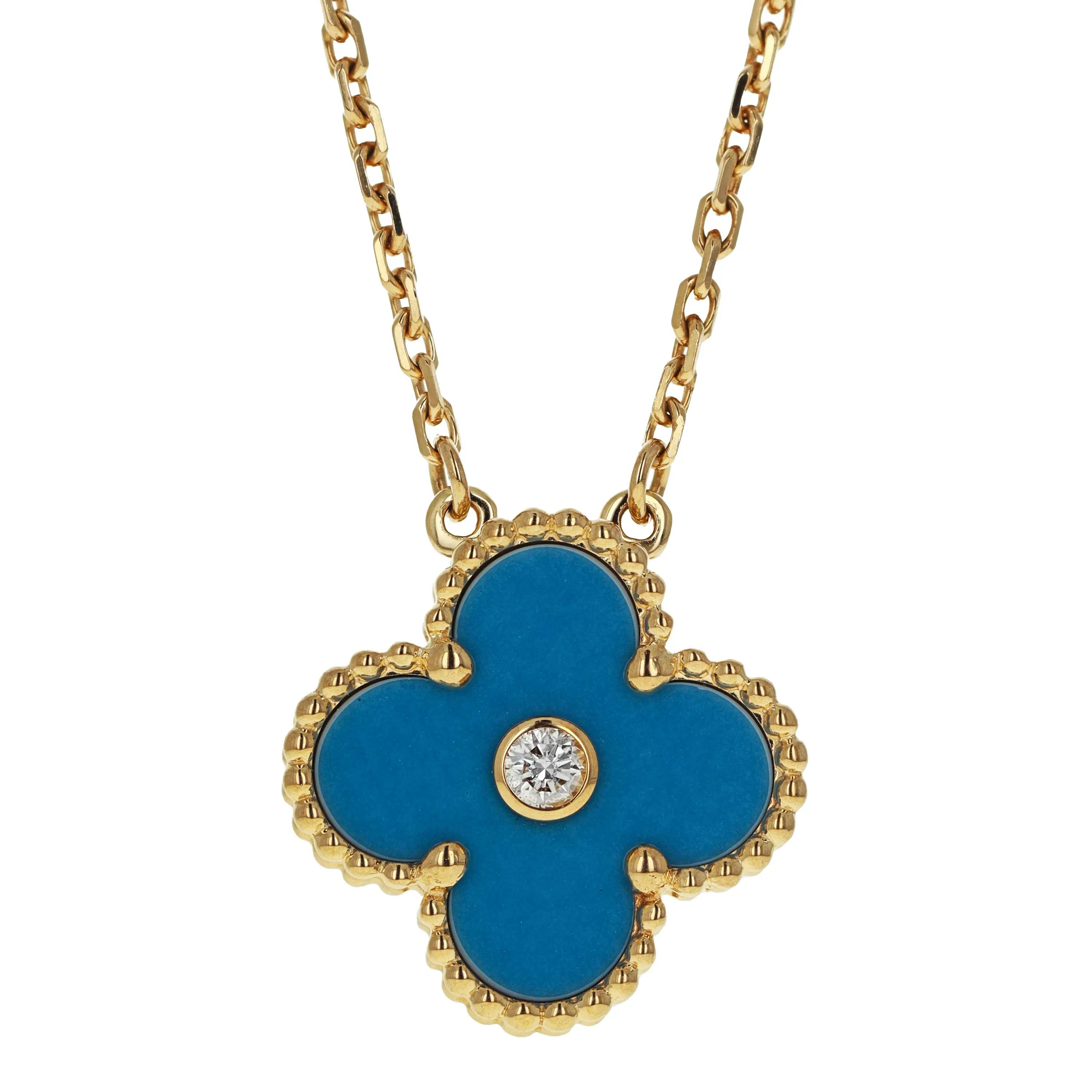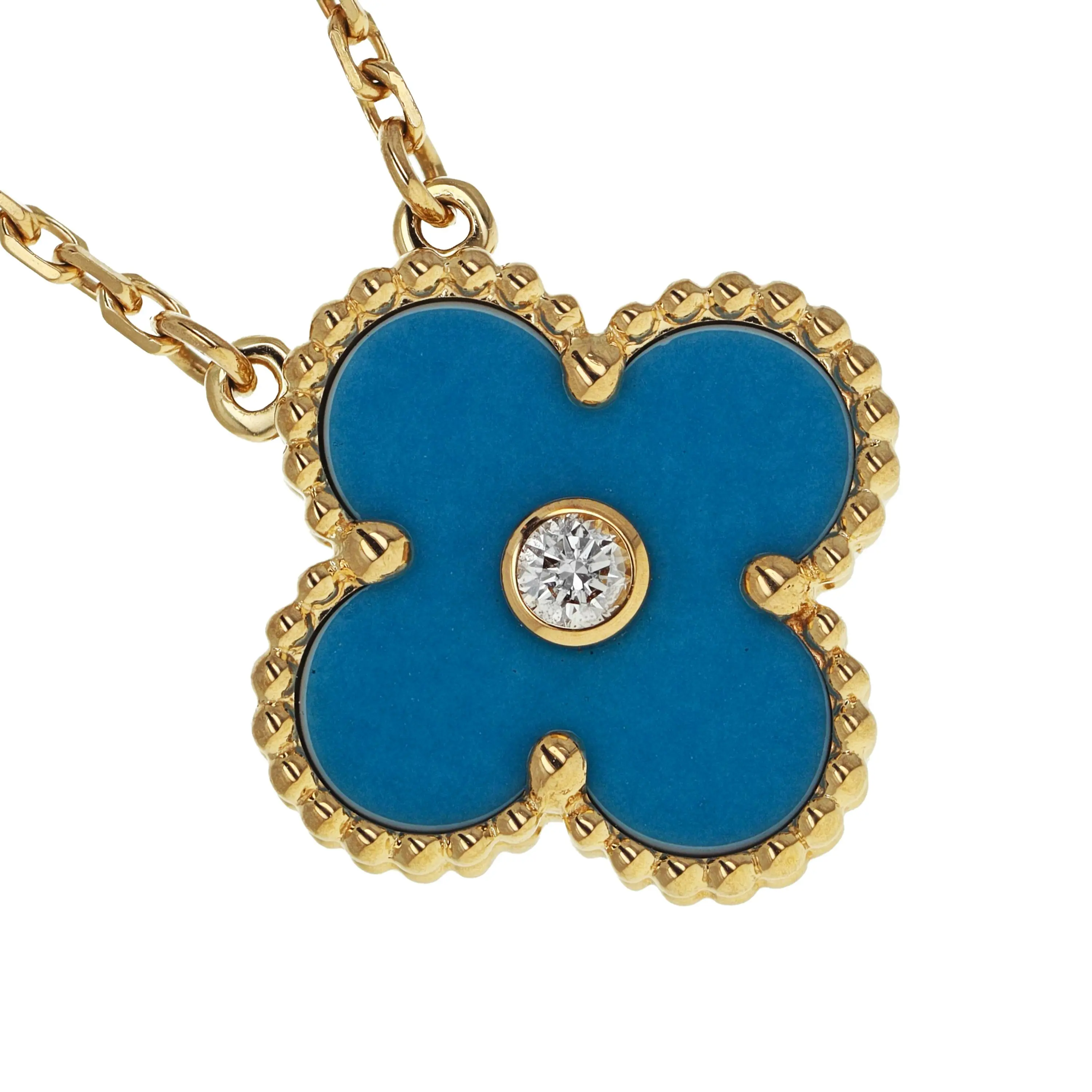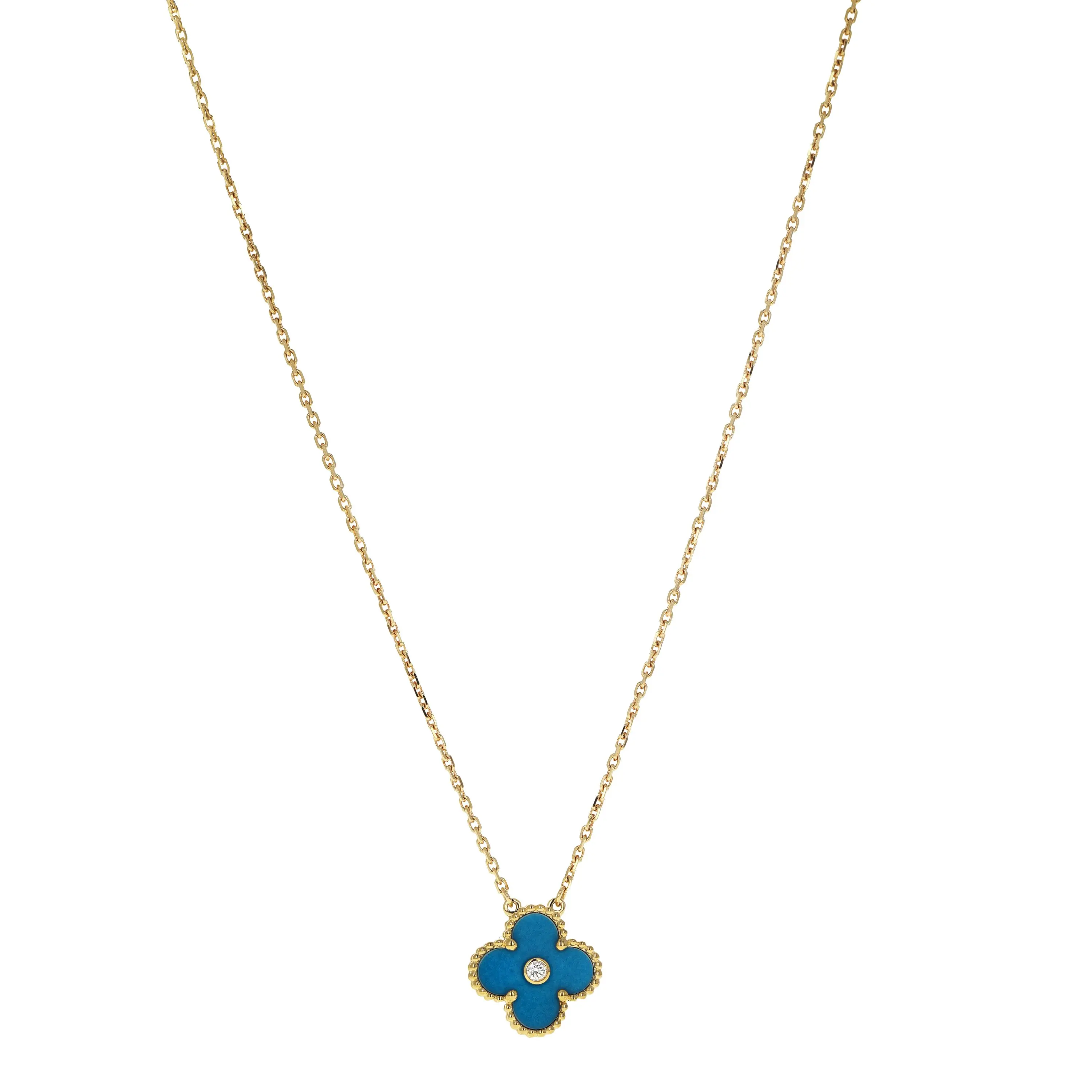 A pre-owned Van Cleef & Arpels 18kt yellow gold, diamond, and blue sable Limited Edition Holiday 2019 pendant necklace from the Vintage Alhambra Collection. The necklace features a 16.25 inch long cable chain with a lobster clasp and a stationary signature four petal motif pendant at the center of the chain. The pendant features a blue sable stone in a milgrain-edge with a single, bezel-set round brilliant-cut diamond in the center. The necklace comes with the original paperwork.