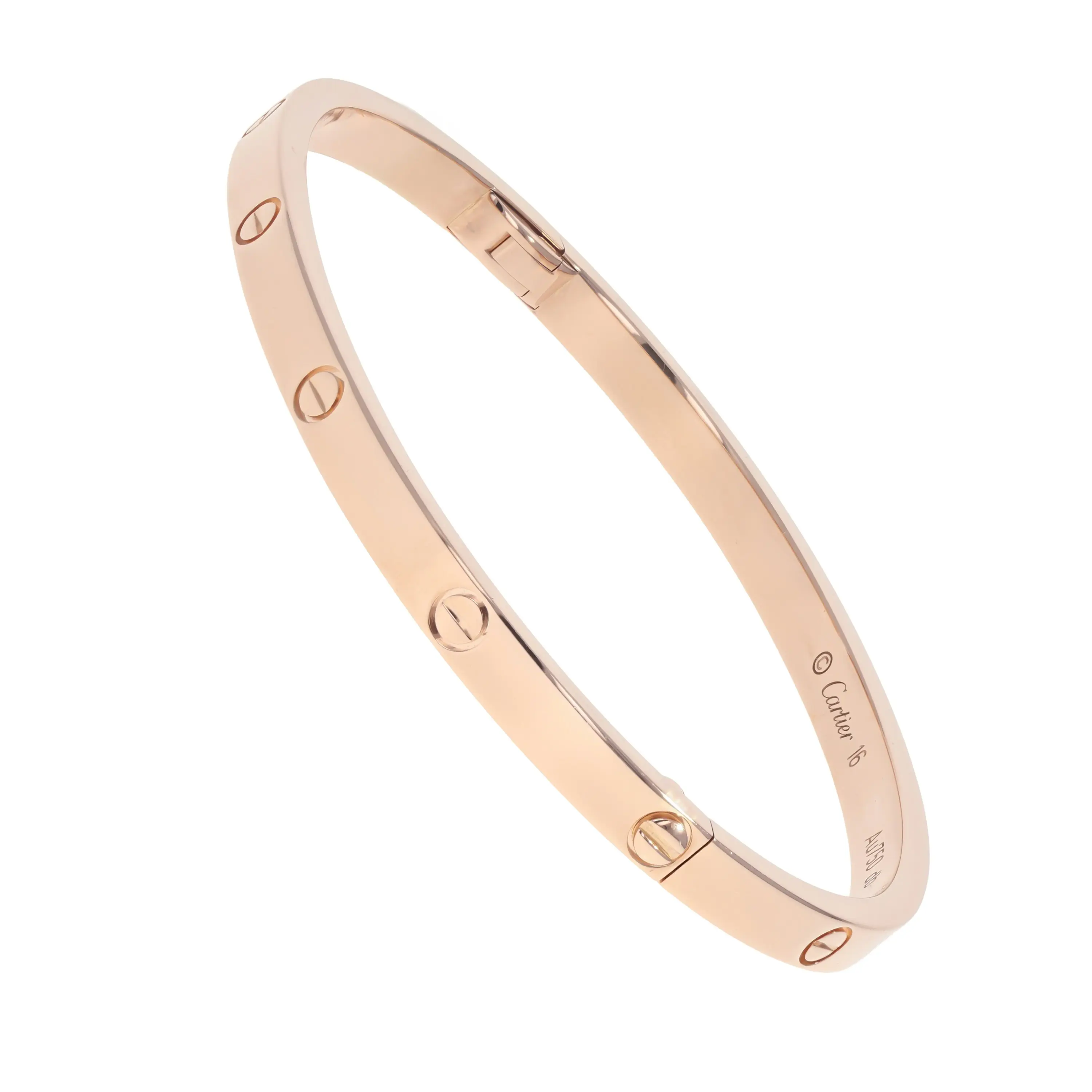 A pre-owned Cartier Love bracelet in 18kt rose gold. The bangle features a high polished finish with signature screw design evenly spaced all the way around the bracelet. The bracelet is a size 16.
