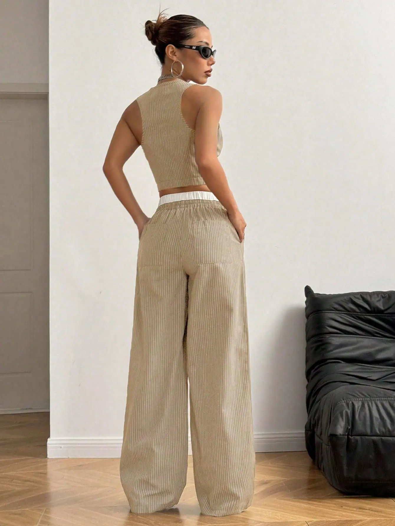 2pcs Women's Casual Striped Single-Breasted Vest And Pants Set,Ladies Casual Button Front,Pocket,Rib-Knit Sleeveless Slim Fit Grey Women Two-Piece Outfits,Spring/Summer,Casual Daily Wear