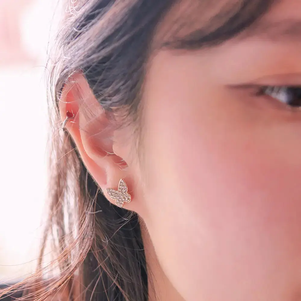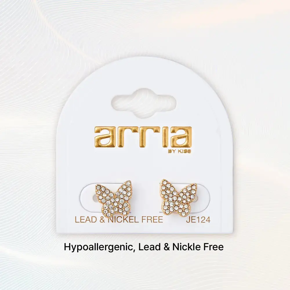 Shine effortlessly with these gold-tone butterfly stud earrings featuring sparkling glass stones. Hypoallergenic, lead & nickel free, and comfortable for all-day wear — perfect for a timeless, feminine look.