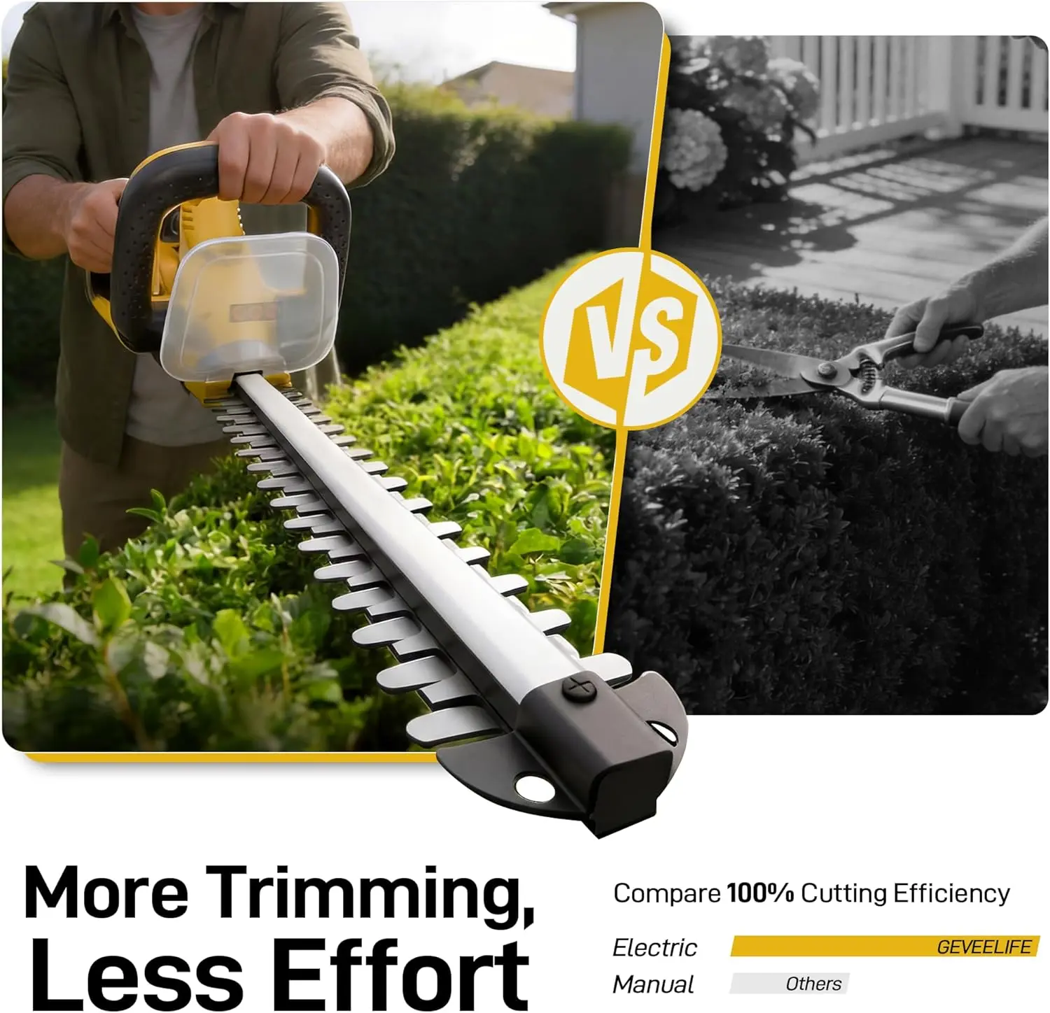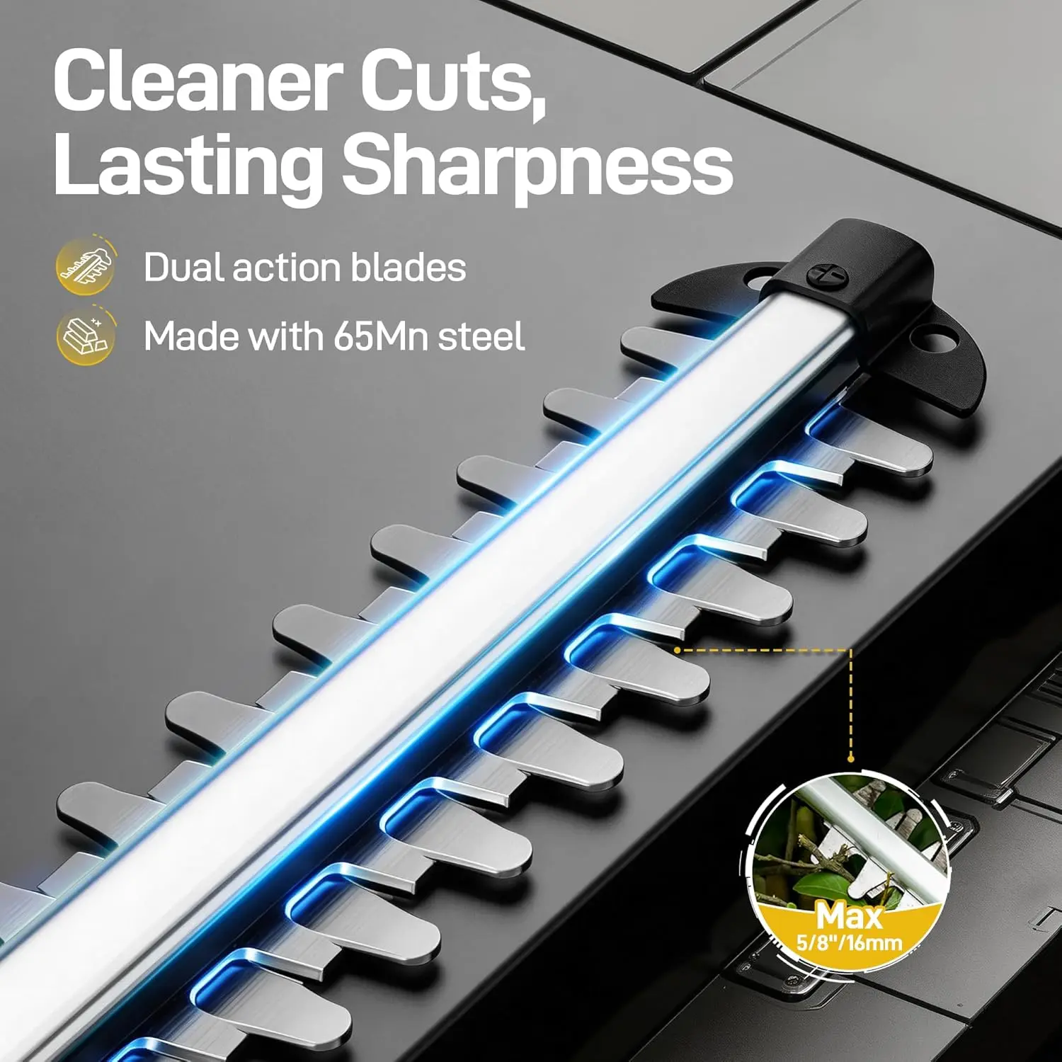 ·【Fast, Clean Trimming】The GEVEELIFE hedge trimmer features a durable 20-inch 65Mn steel blade that cuts branches up to 5/8" thick for clean, efficient trimming. Its dual-action blade reduces vibration by up to 50% compared with standard blades, giving you better control and less fatigue for both heavy trimming and detail shaping.
