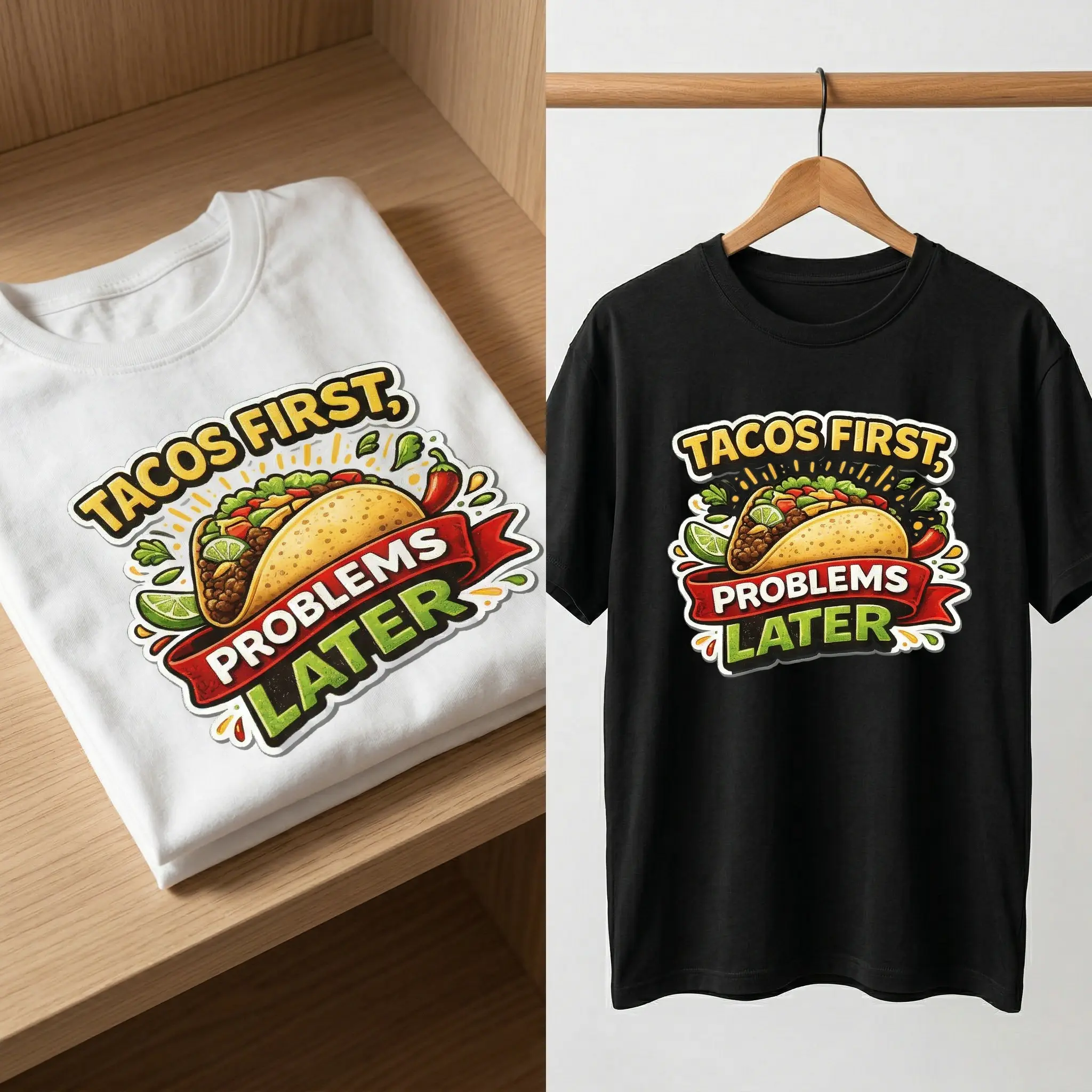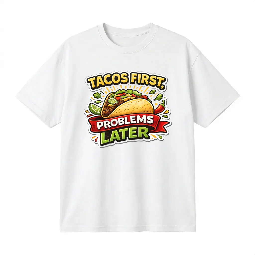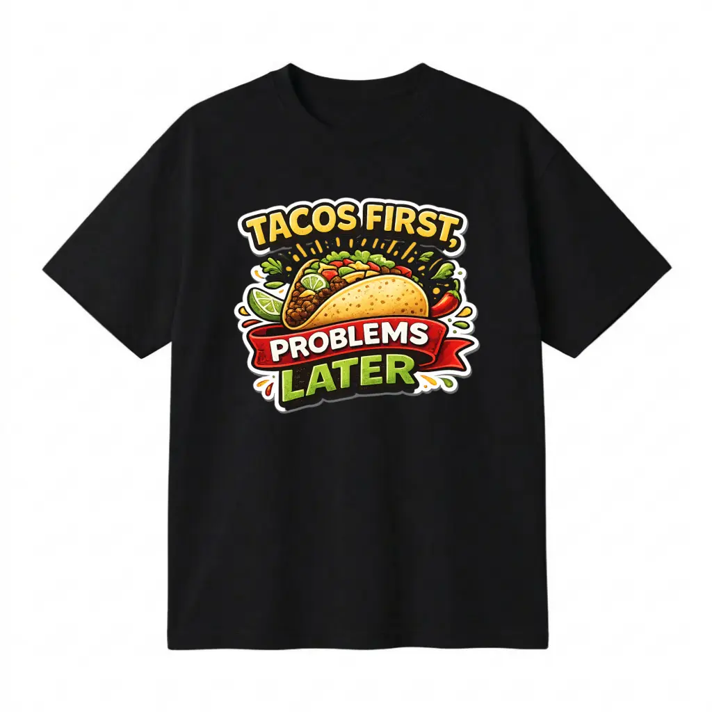 ·Funny Meme Design: This unisex t-shirt features a humorous graphic print: "Tacos First, Problems Later." Perfect for food lovers and meme enthusiasts. 🍕