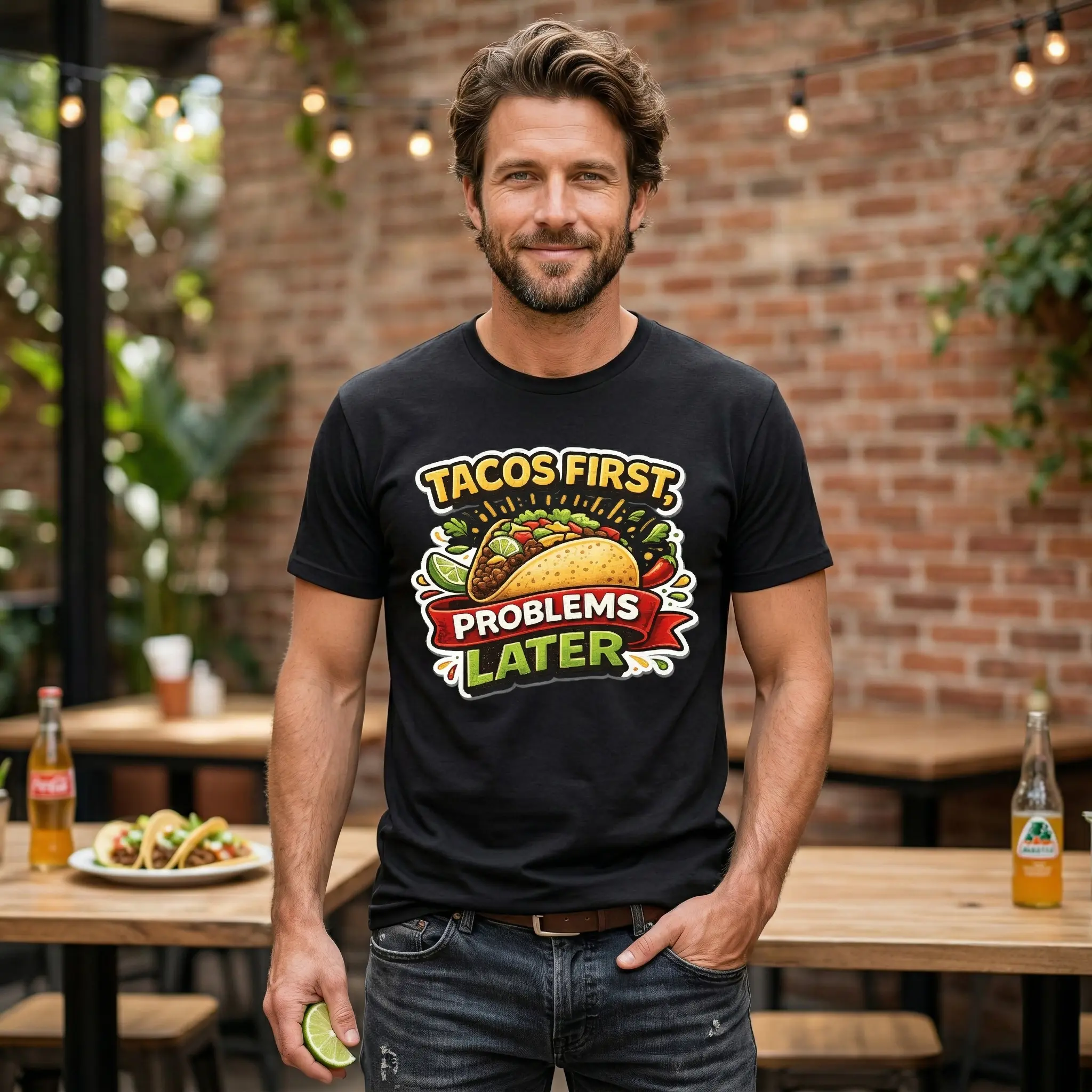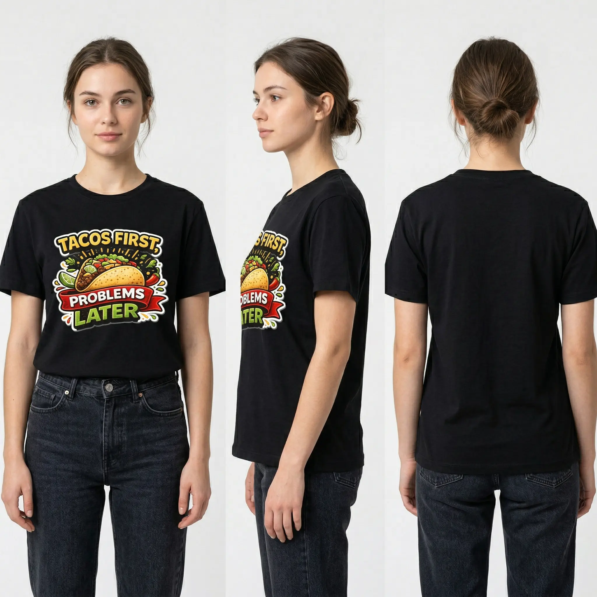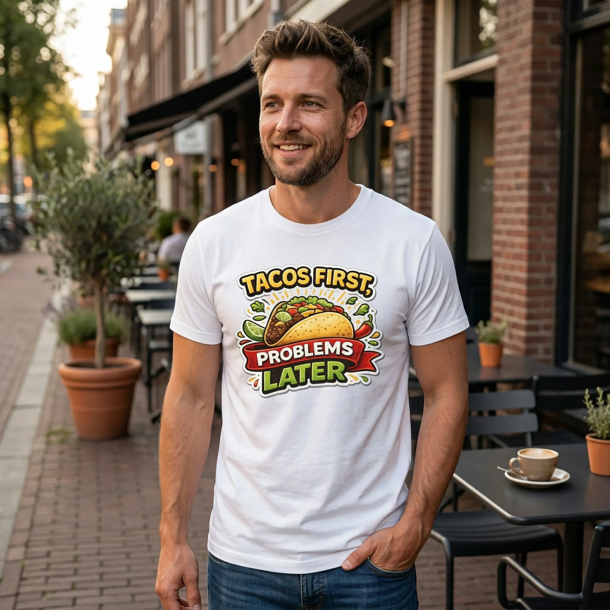 ·Funny Meme Design: This unisex t-shirt features a humorous graphic print: "Tacos First, Problems Later." Perfect for food lovers and meme enthusiasts. 🍕