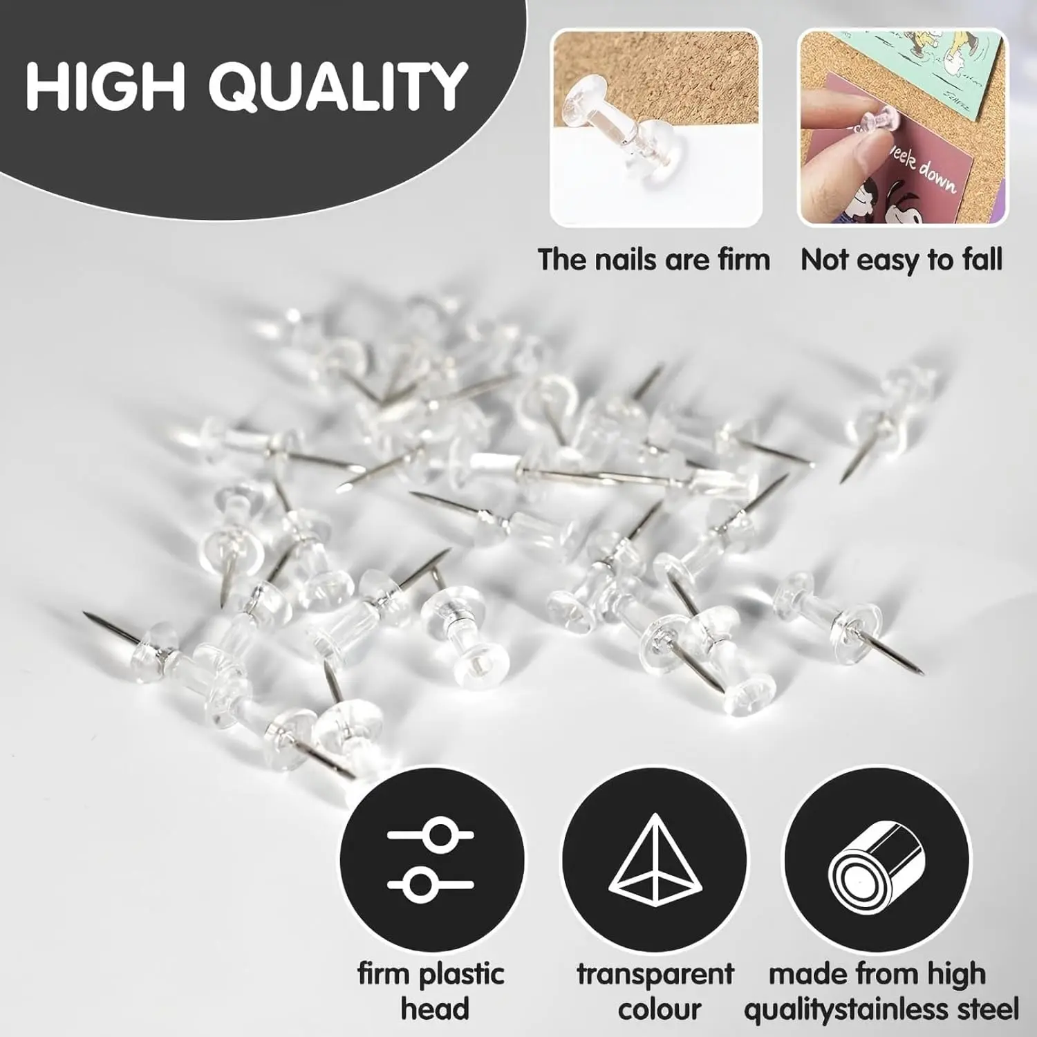 The transparent design blends neatly with any background, keeping your focus on photos, reminders, or documents rather than the pins themselves. The smooth plastic tip provides a comfortable grip, allowing quick placement and removal without hassle. Ideal for securing papers, memos, calendars, or decorations at home, in the office, or in classrooms.