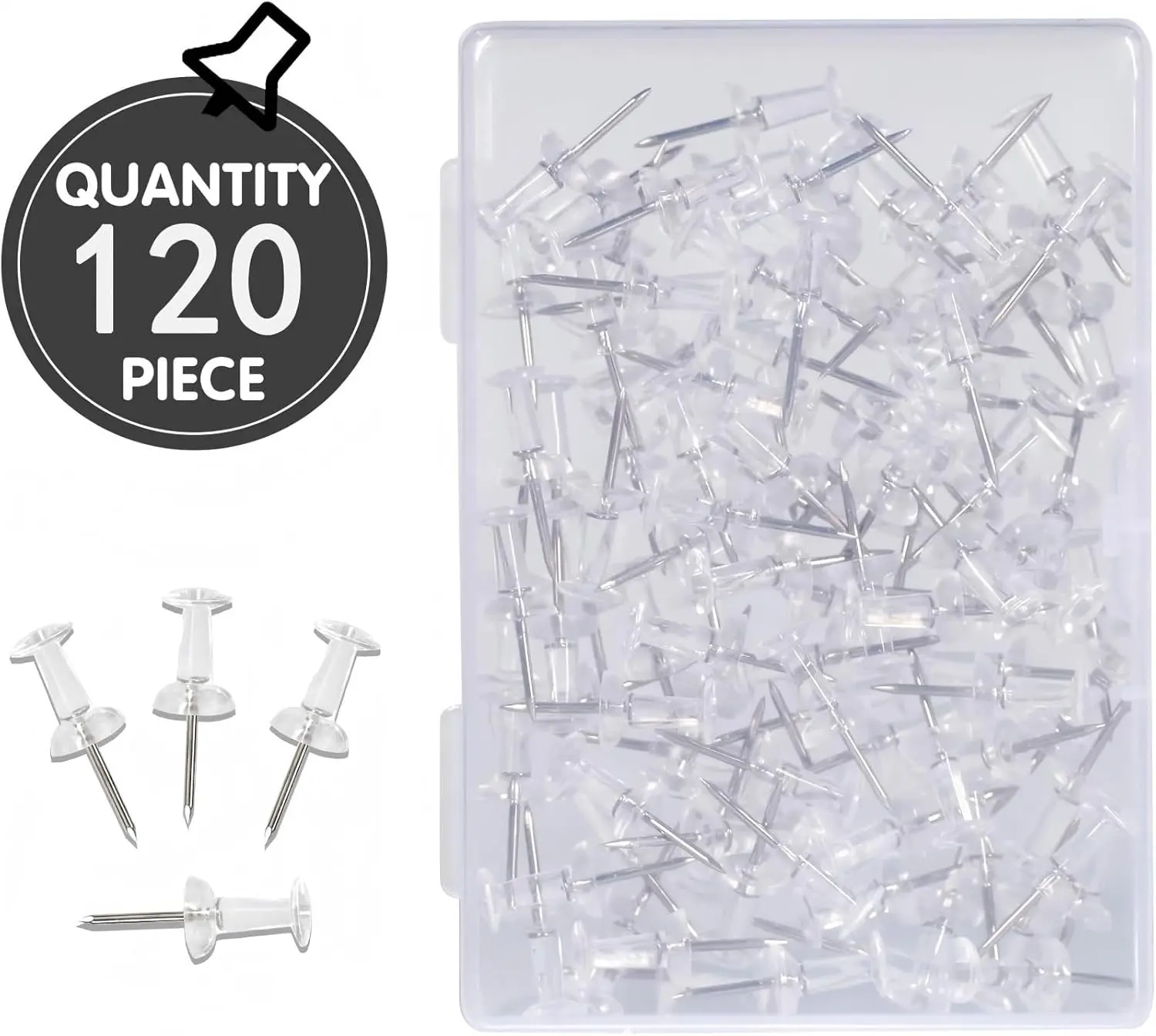 Stay organized and keep important notes visible with this 120-pack of push pins designed for everyday use. Each pin features a clear plastic head combined with a sharp steel tip, making it easy to insert into cork boards, bulletin boards, or soft surfaces without bending or breaking.
