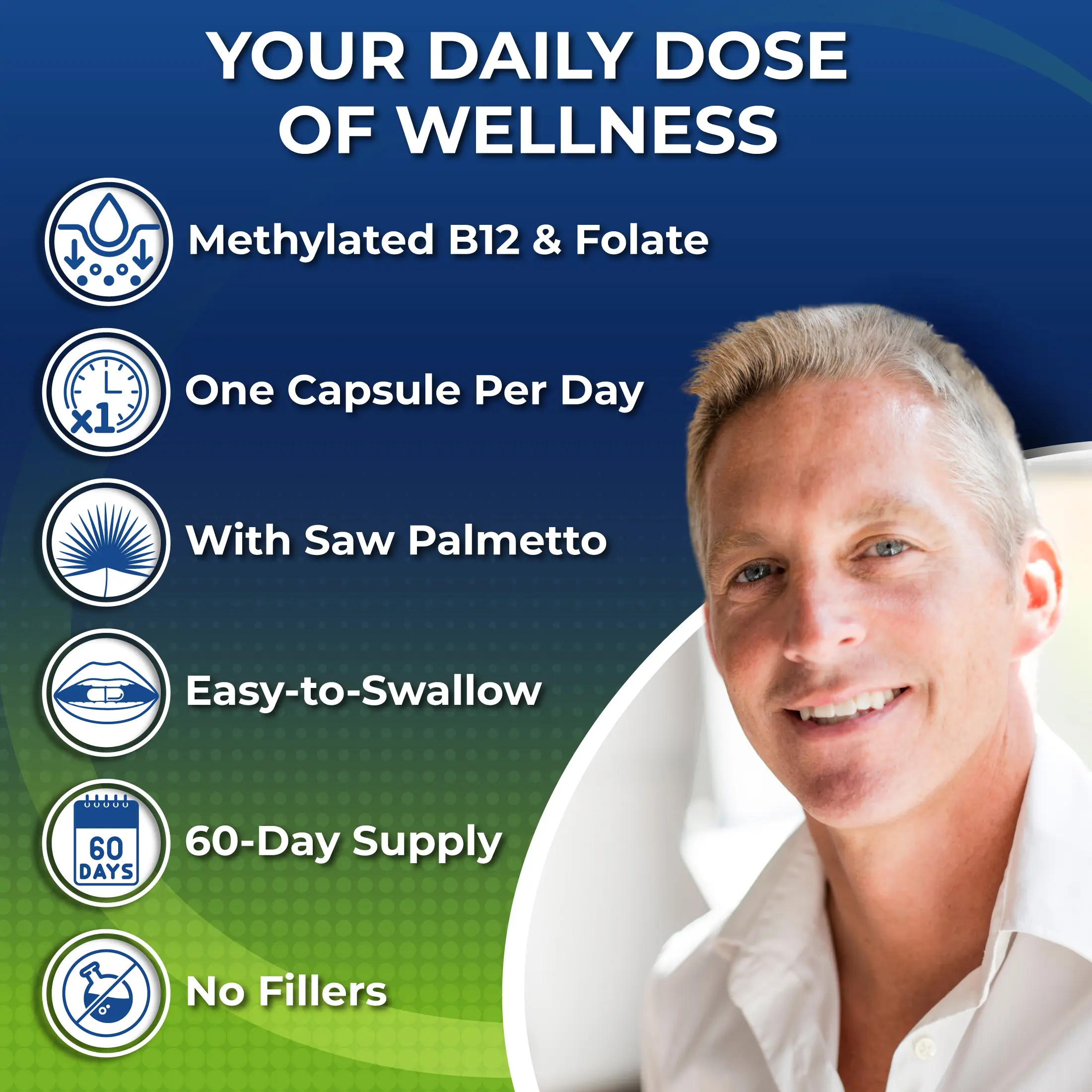 Easy to Swallow, Once Daily – A vegan multivitamin for men 50+ designed to support daily energy and overall wellness in one convenient capsule.