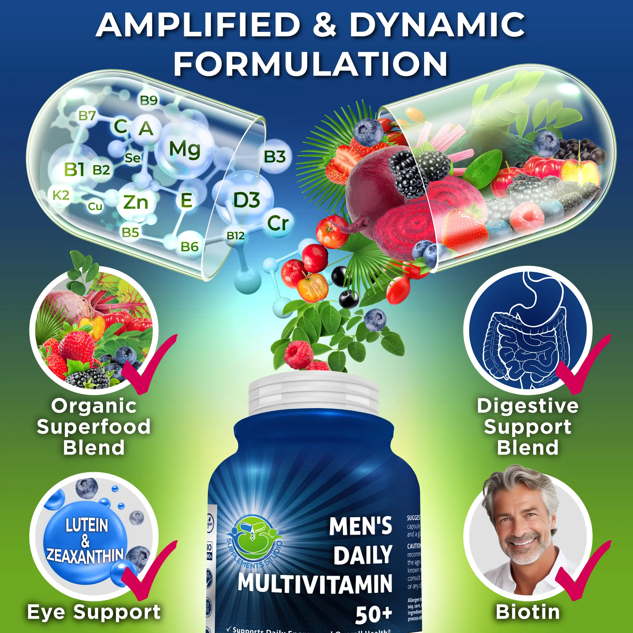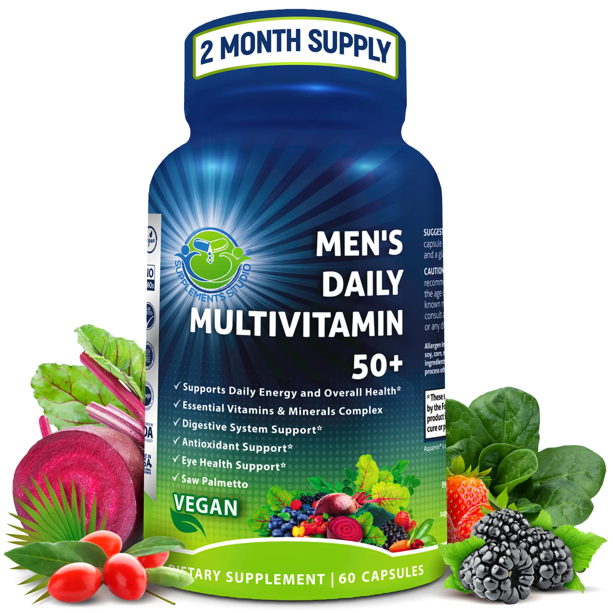 ·Easy to Swallow, Once Daily – A vegan multivitamin for men 50+ designed to support daily energy and overall wellness in one convenient capsule. Includes saw palmetto and an eye support blend with lutein, zeaxanthin, and bilberry.