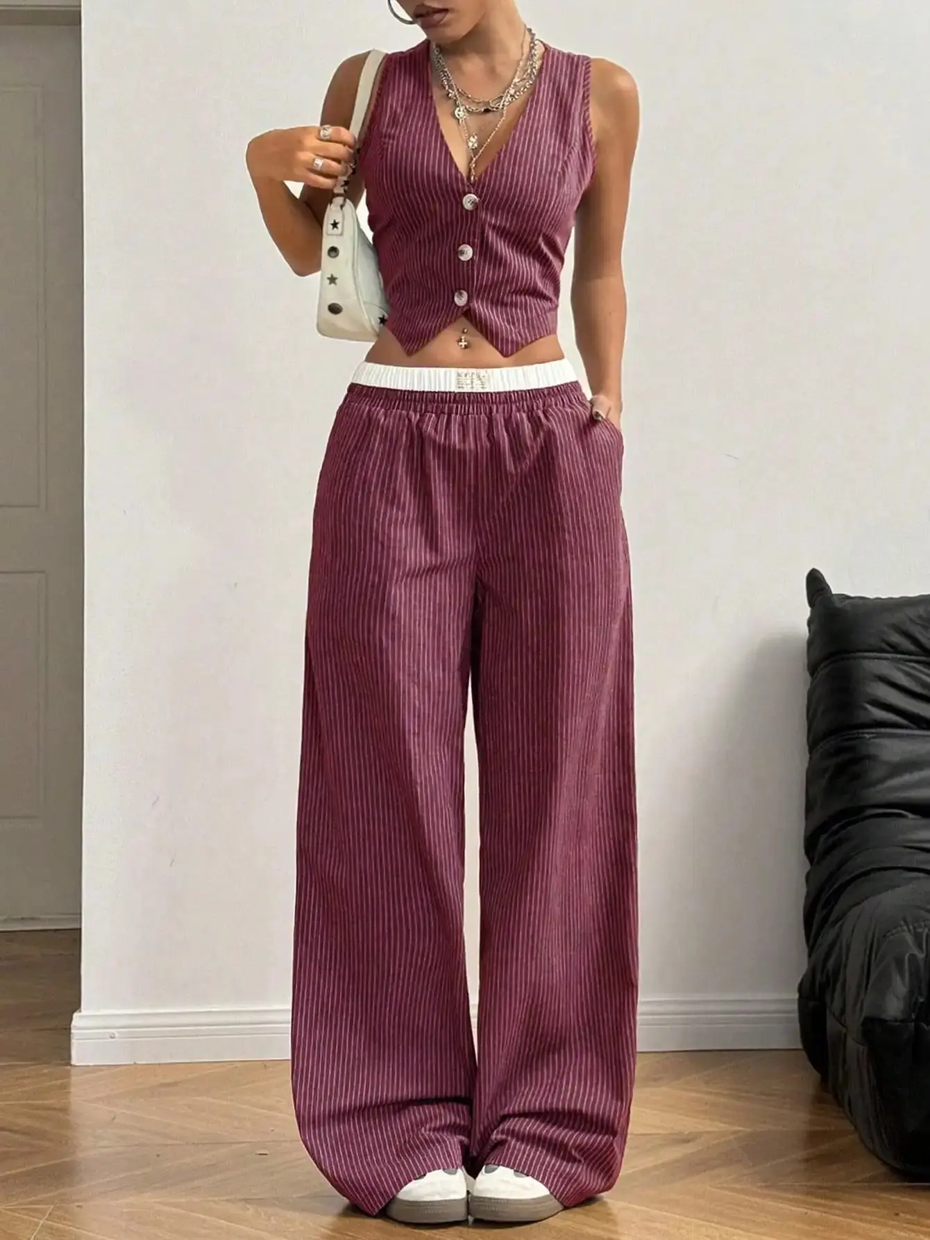 2pcs Women's Casual Striped Single-Breasted Vest And Pants Set, Ladies Casual Button Front, Pocket, Rib-Knit Sleeveless Slim Fit Grey Women Two-Piece Outfits, Spring/Summer, Casual Daily Wear, Fashion Commuting, Khaki Color, Wine Red