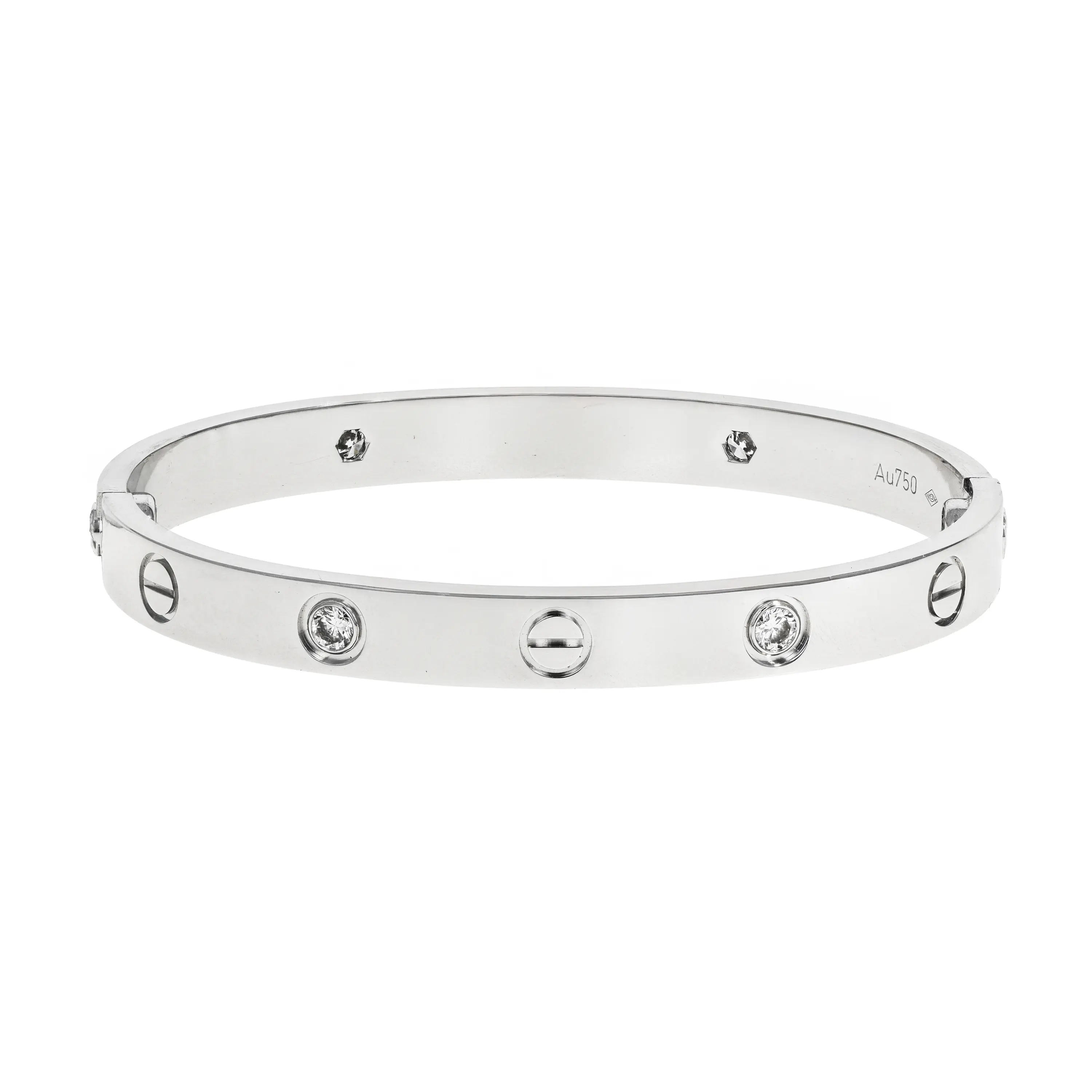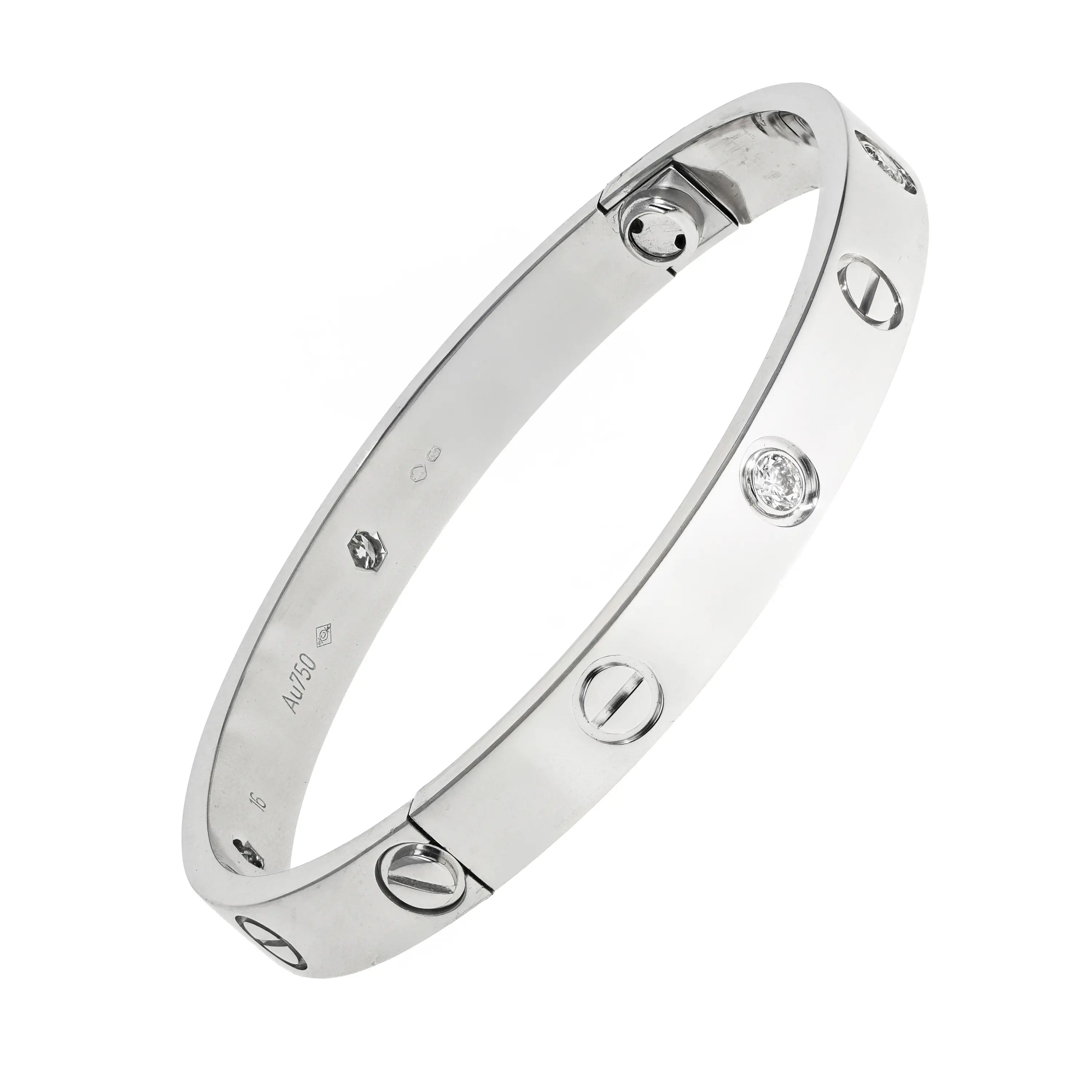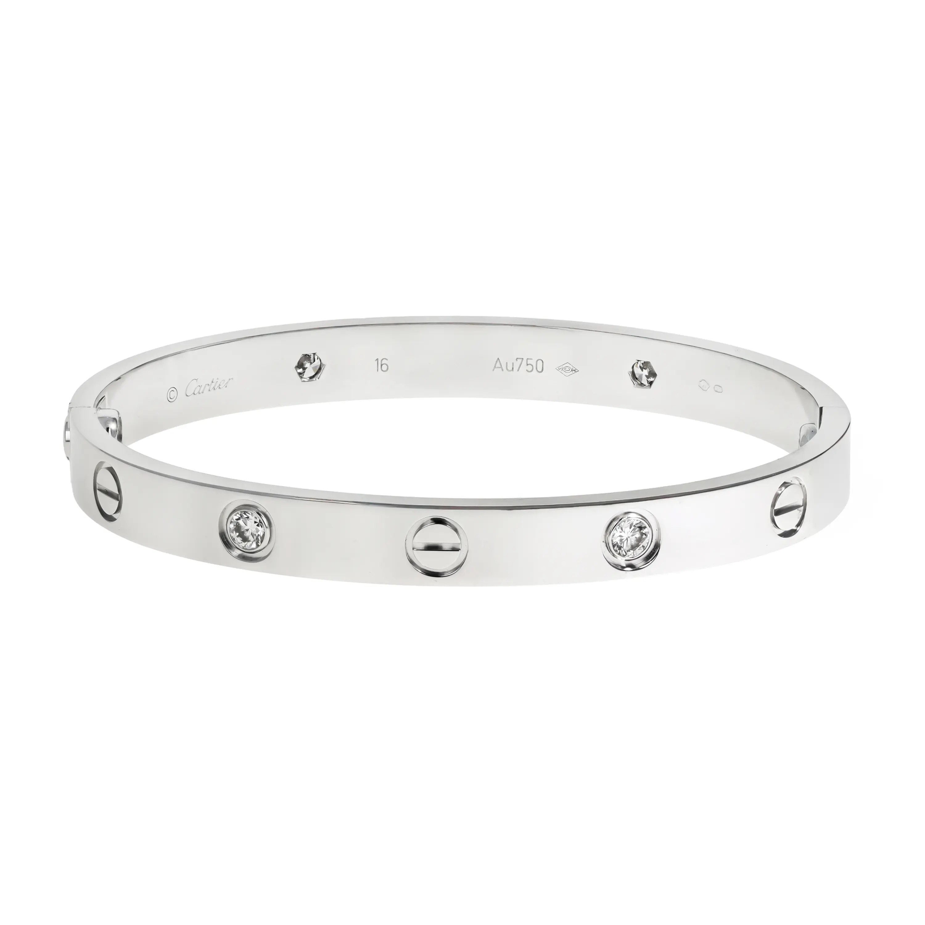 A pre-owned Cartier Love bracelet in 18kt white gold and diamond. The bracelet is a size 16 and features a high polished finish with the signature screw design all the way around and alternating with four (4) bezel-set, round brilliant-cut diamonds. The diamonds have a combined carat weight of approximately 0.42cts. The bracelet comes with a Cartier box and screwdriver.