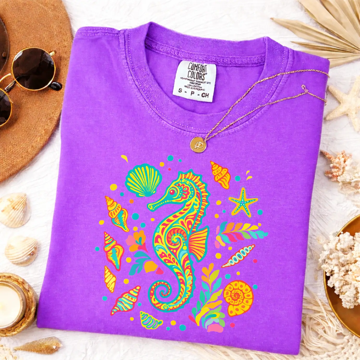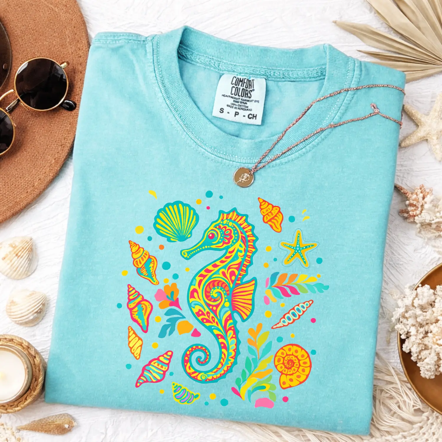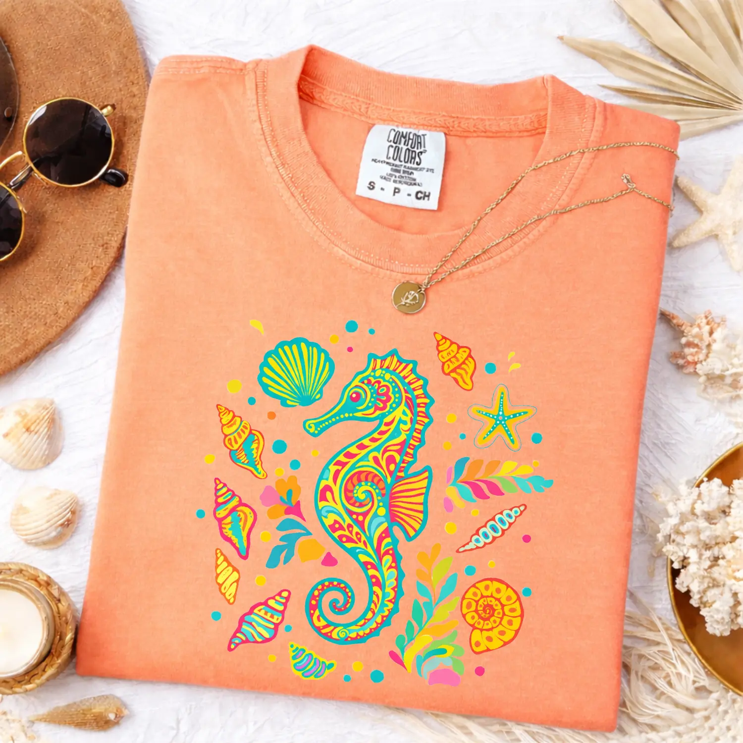 This Comfort Colors tee features a vibrant seahorse surrounded by seashells and ocean elements — blending tropical boho vibes + bright dopamine colors for a bold, eye-catching summer look.