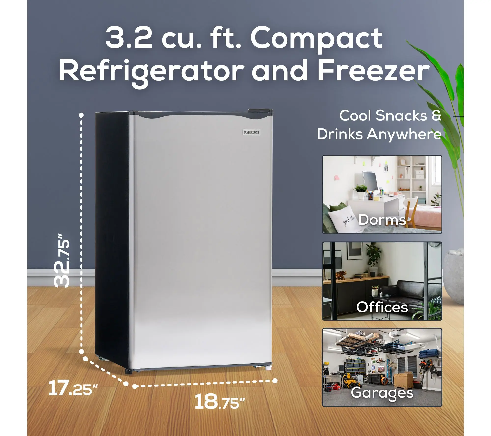 Whether you're stocking up for study sessions or keeping snacks close in your office, this refrigerator-freezer combo offers convenience and easy access wherever you need it. With ample 3.2-cu. ft. capacity, adjustable shelving, and a separate freezer compartment, enjoy the flexibility to organize drinks, meals, and treats for every occasion. From Igloo.