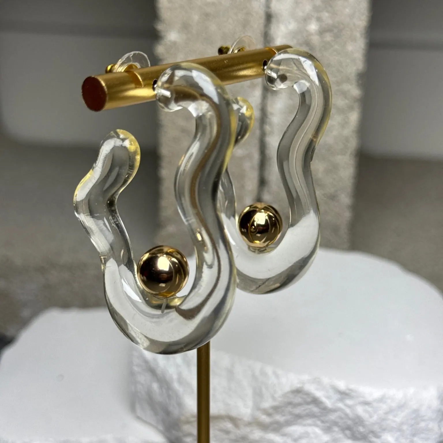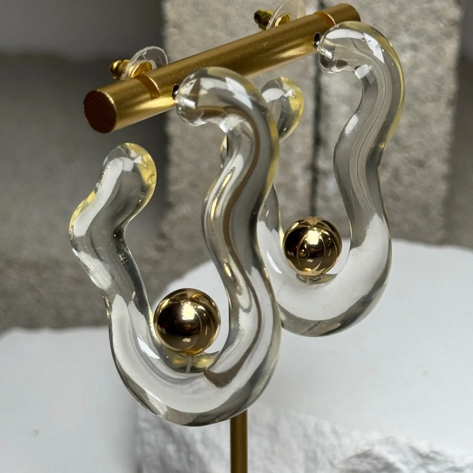 Dive into a wave of modern elegance with the Crystal Current Hoop Earrings. Sculpted from crystal-clear, lightweight material, these abstract hoops flow with a fluid, organic shape that feels both playful and sophisticated. Each curve catches the light, creating an ethereal shimmer, while the floating gold sphere at the center adds a pop of luxe intrigue—a subtle focal point that turns every movement into a moment of magic.