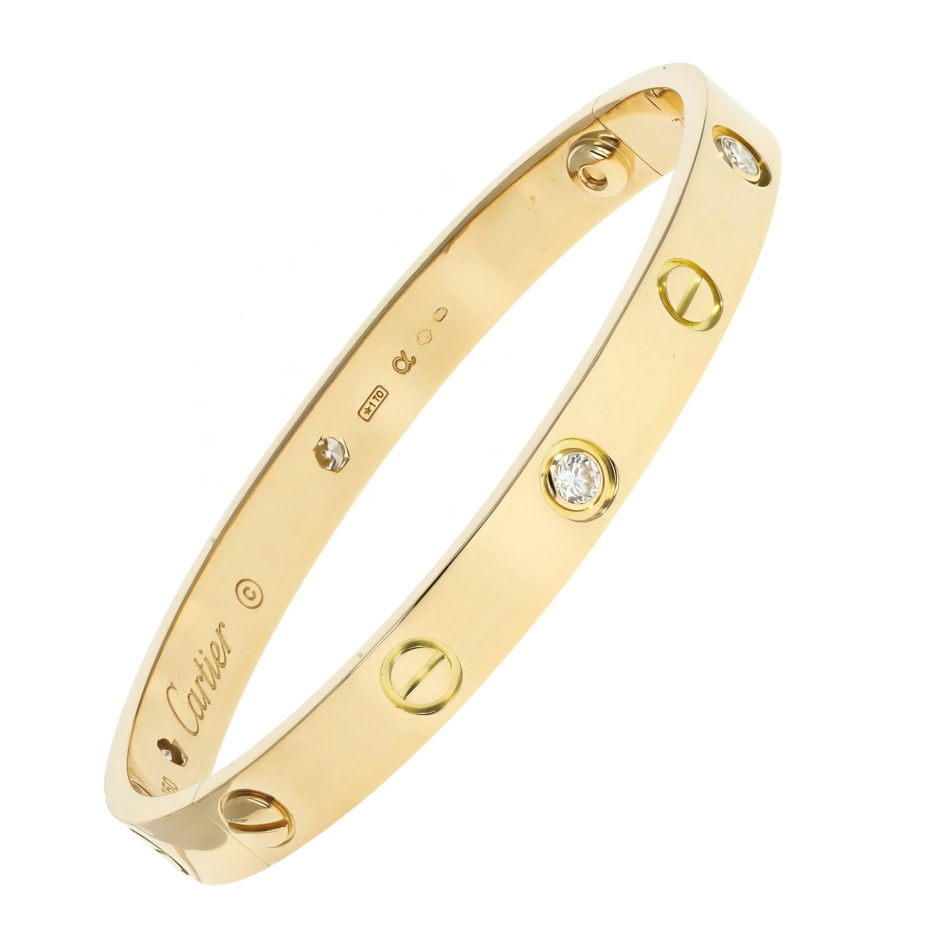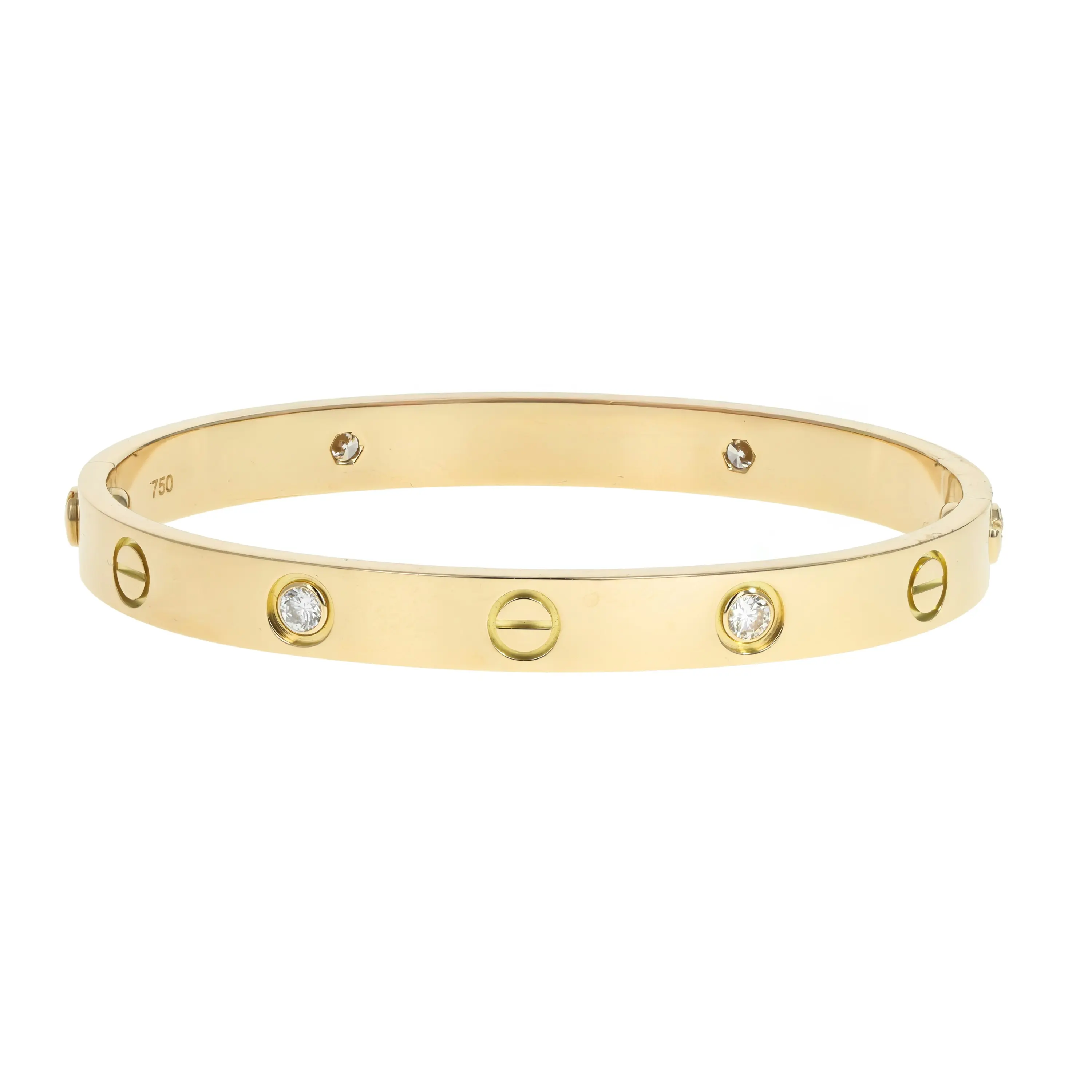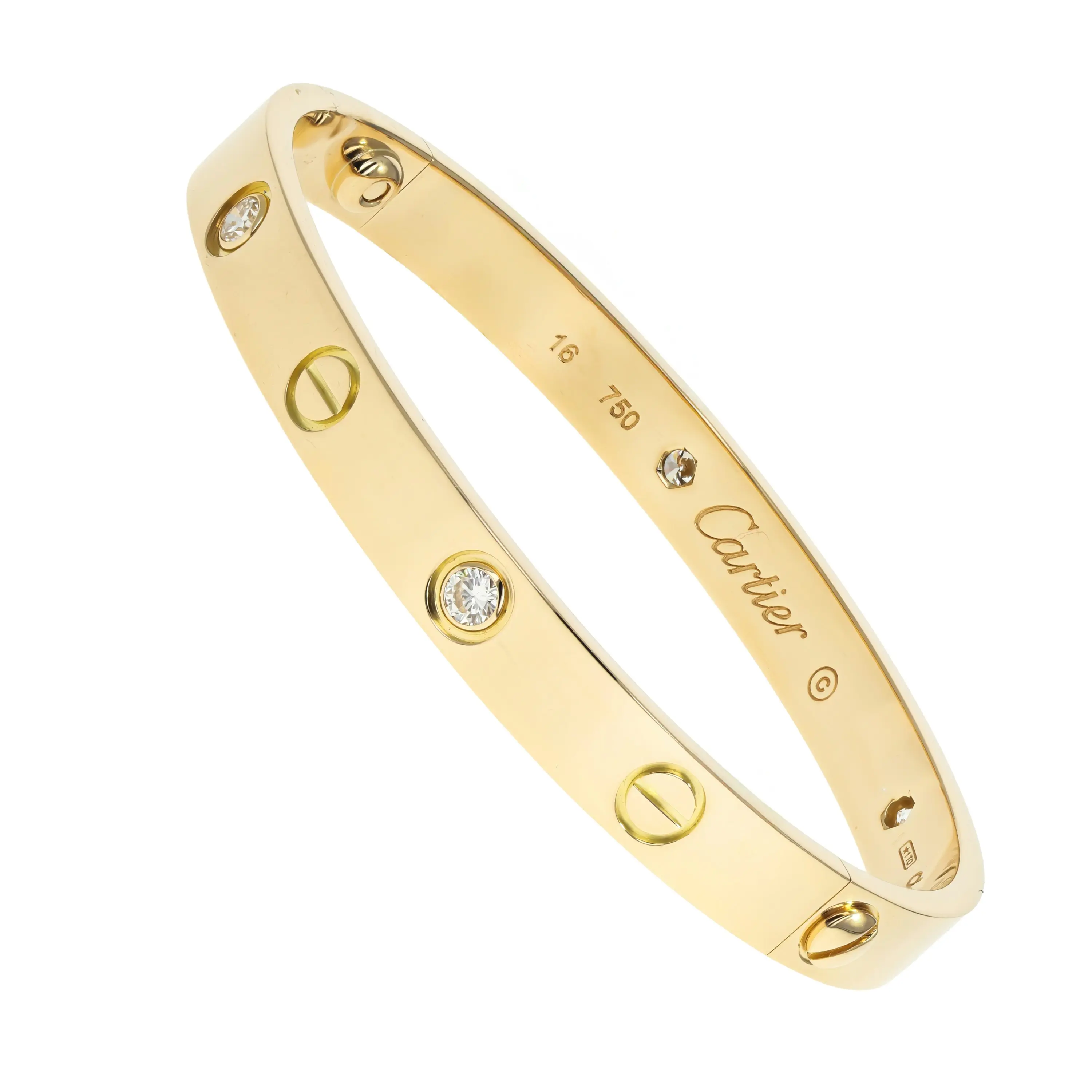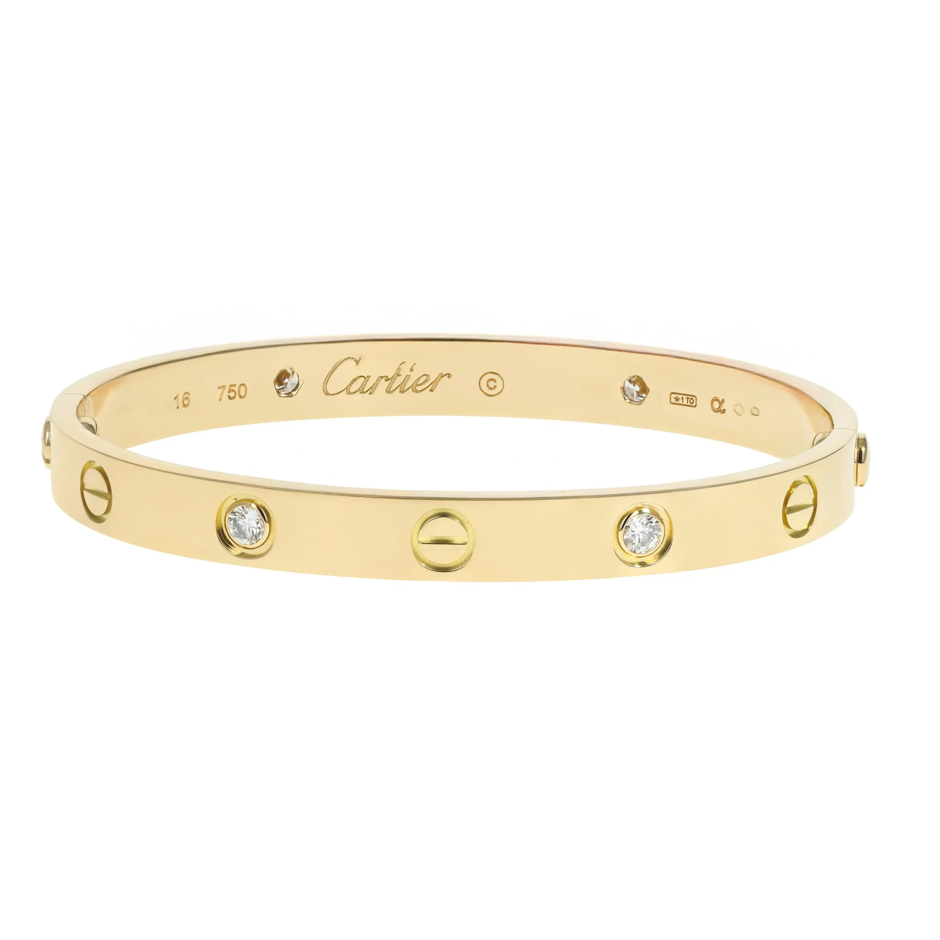 A pre-owned Cartier Love bracelet in 18kt yellow gold and diamond. The bangle features a high polished finish with four (4) round brilliant-cut diamonds bezel-set and evenly spaced all the way around the bracelet. The diamonds are alternating with the signature screw design. The bracelet is a size 16 and the diamonds have a combined carat weight of 0.42cts. The bangle comes with the original box, and a Cartier screw driver.
