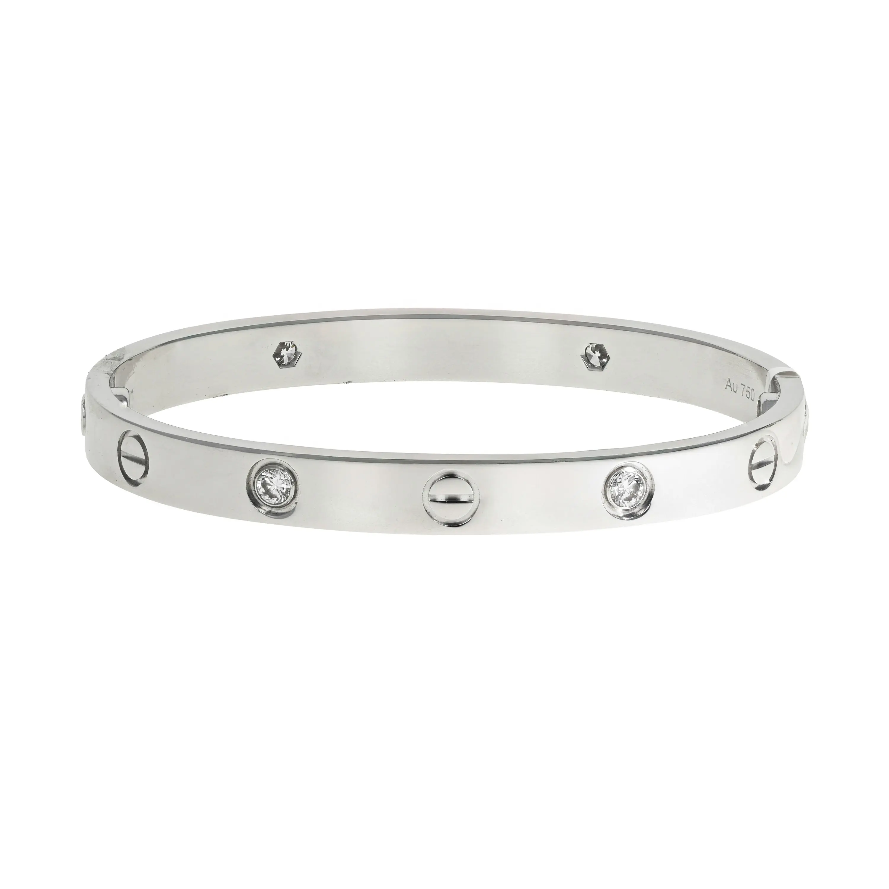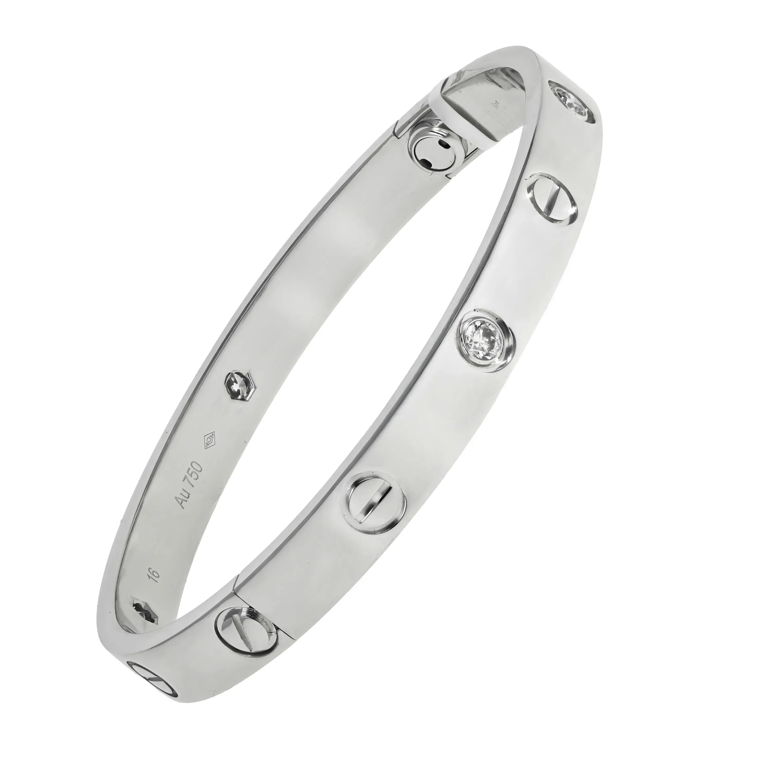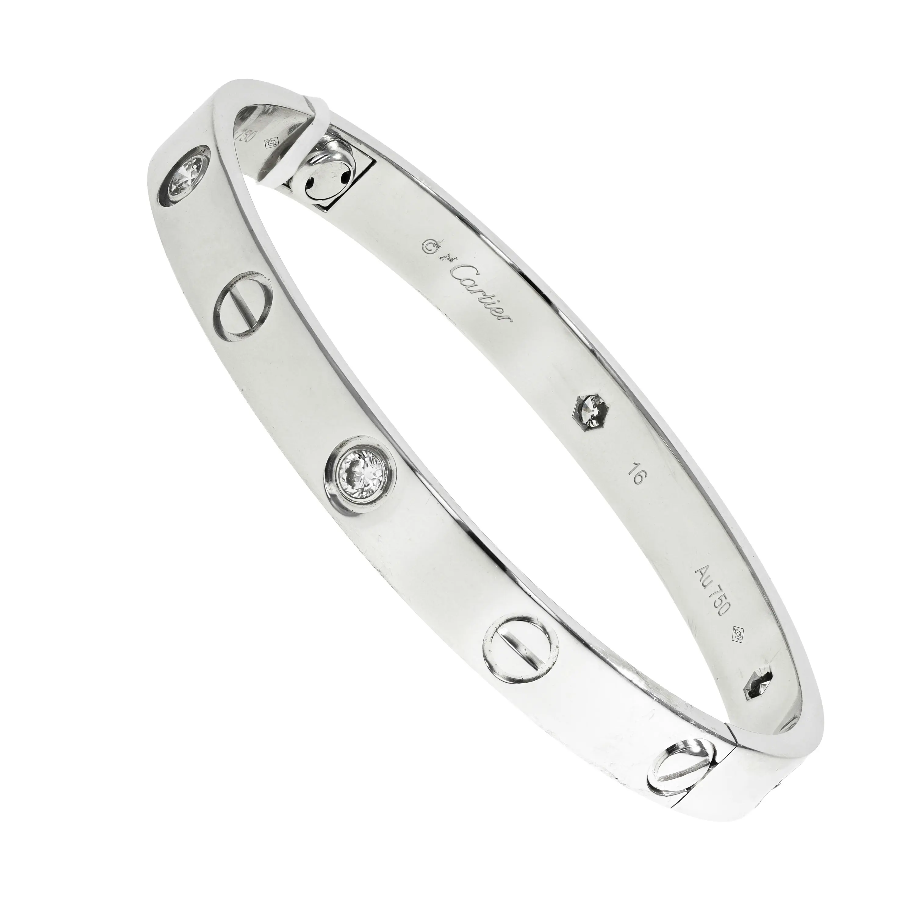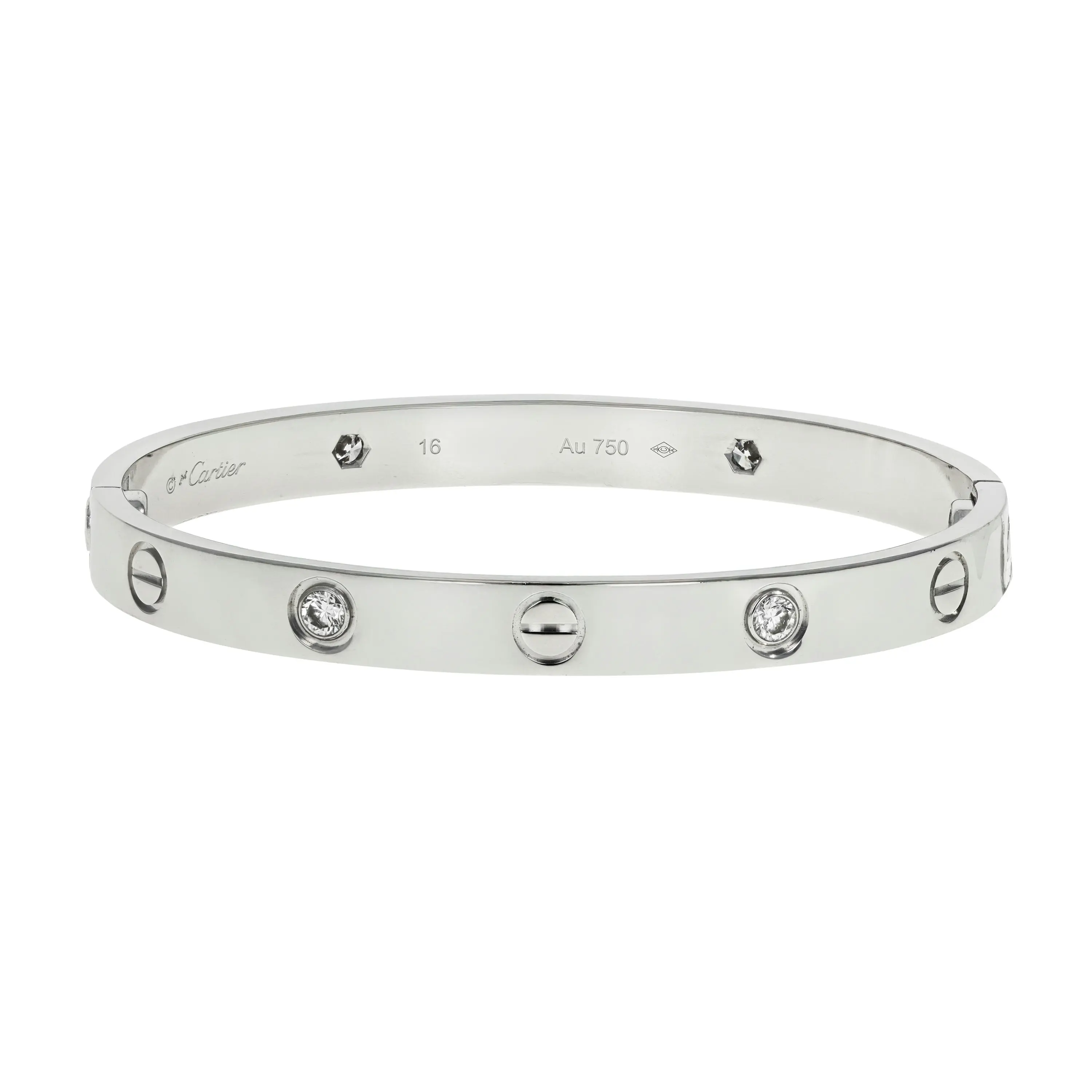 A pre-owned Cartier Love bracelet in 18kt white gold and diamond. The bracelet is a size 16 and features a high polished finish with the signature screw design all the way around and alternating with four (4) bezel-set, round brilliant-cut diamonds. The diamonds have a combined carat weight of approximately 0.42cts.