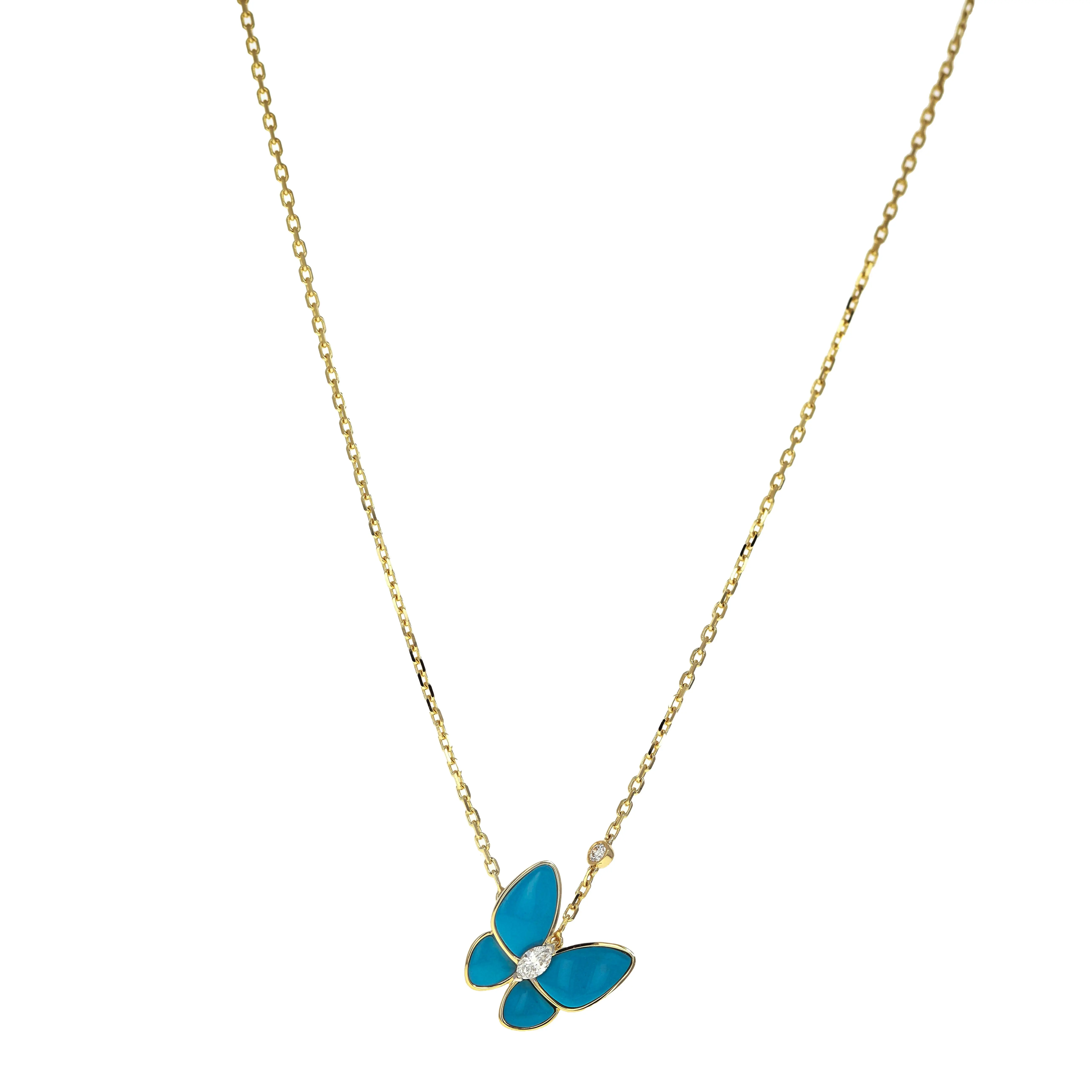 A pre-owned Van Cleef & Arpels 18kt yellow gold, diamond, and turquoise pendant necklace from the Two Butterfly Collection. The necklace features a 17 inch long, split cable chain with a lobster clasp closure and an offset butterfly pendant stationed at the front center accented by a single bezel-set round brilliant-cut diamond a quarter of an inch up the chain. The butterfly pendant features high polished, turquoise stones bezel-set into the wings and a single, v-prong set marquise diamond as the butterfly's body. The two (2) diamonds in the necklace have a combined carat weight of 0.20cts. The necklace comes with the original box, paperwork, and service paperwork.