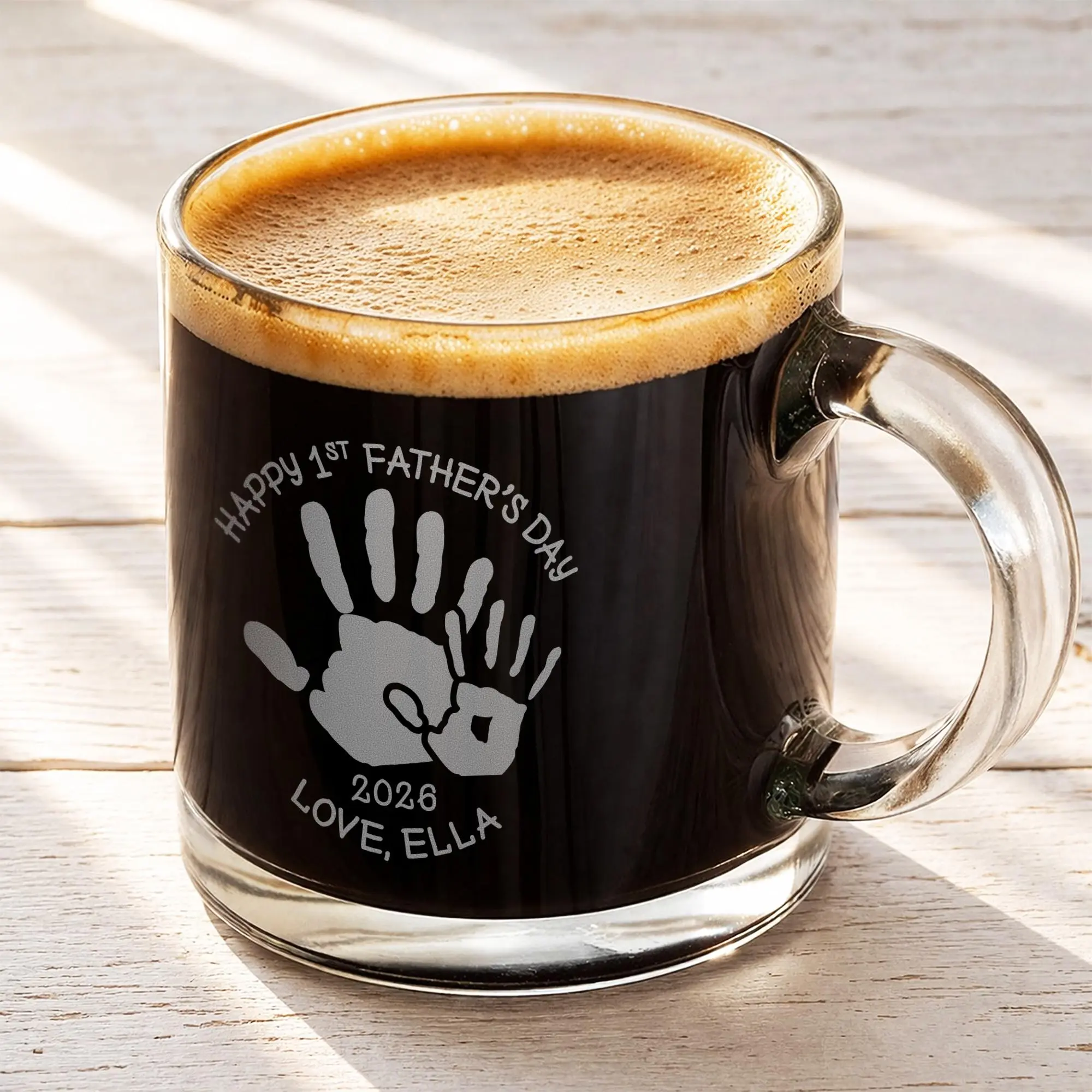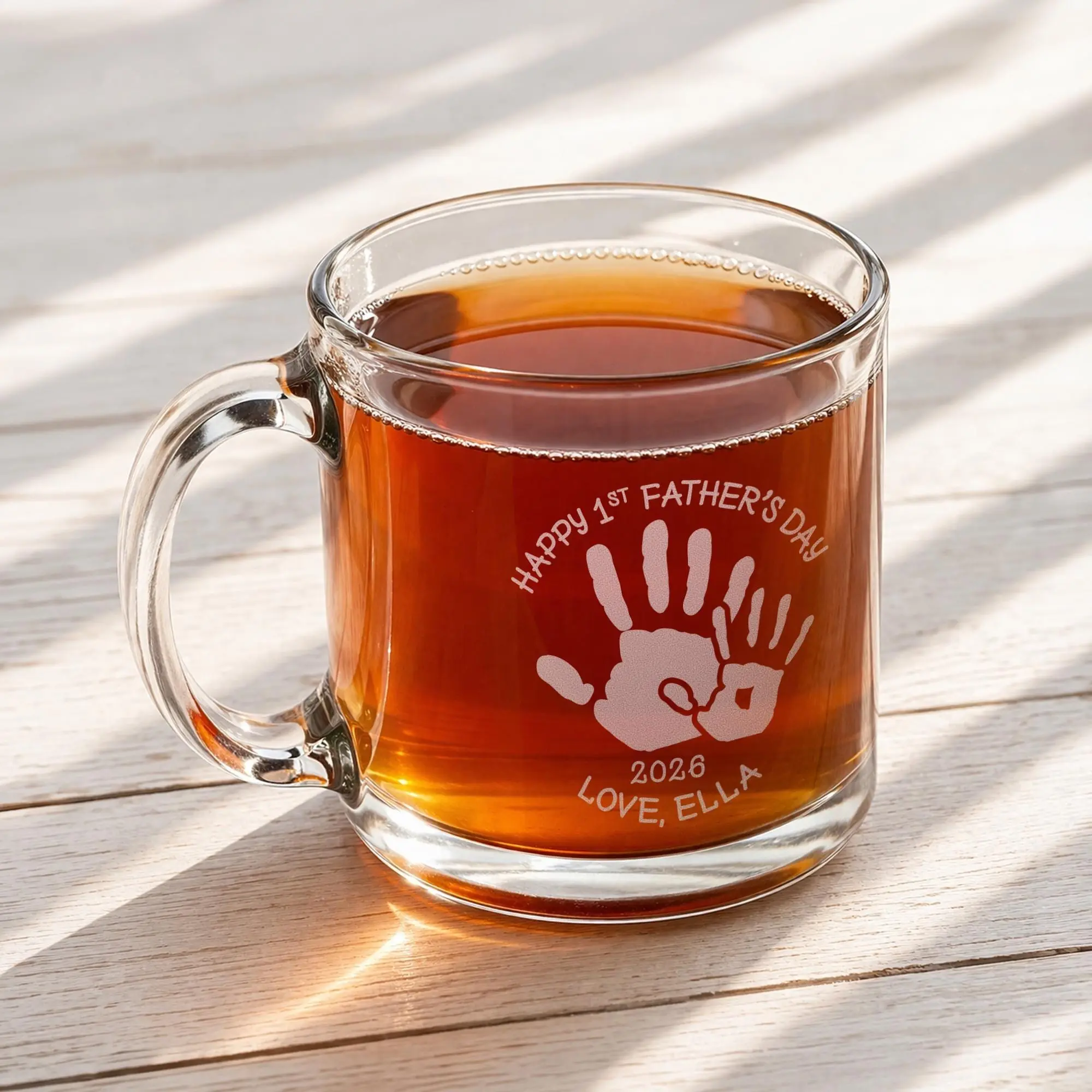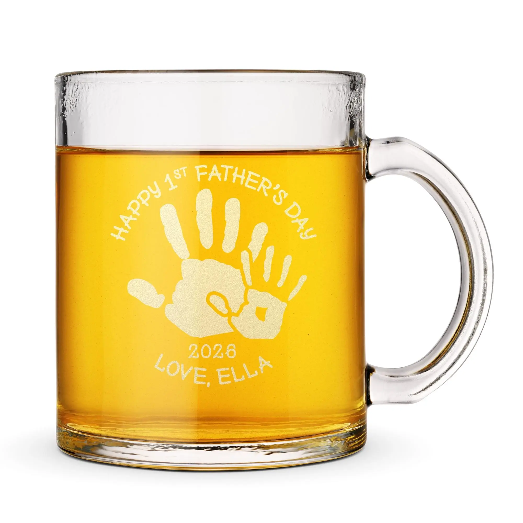 Celebrate Dad with a meaningful keepsake using this personalized glass mug featuring a heartfelt Father’s Day handprint design. Showcasing a big and small handprint along with your custom name and year, this engraved mug captures the special bond between father and child. It’s a thoughtful and personal gift that turns everyday coffee or tea into a reminder of love and connection.