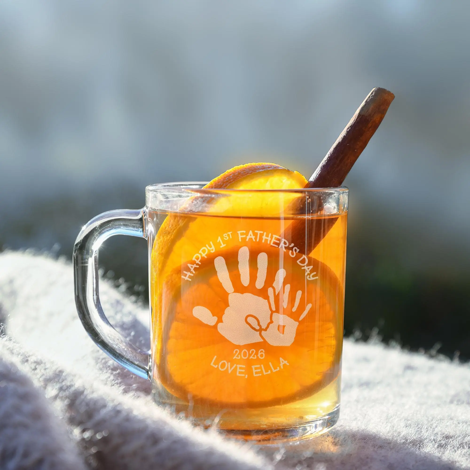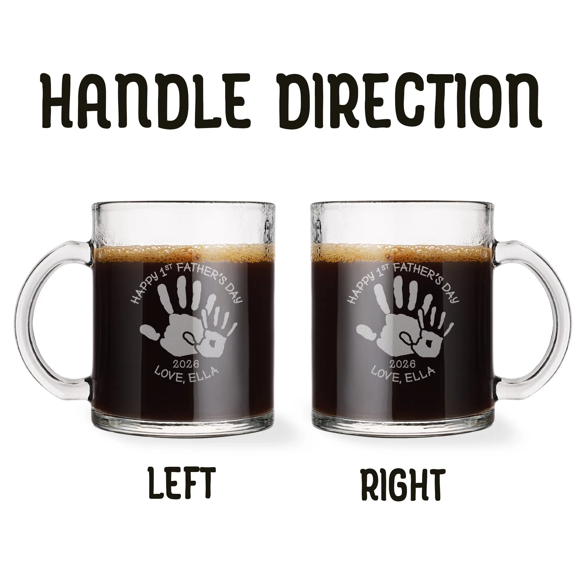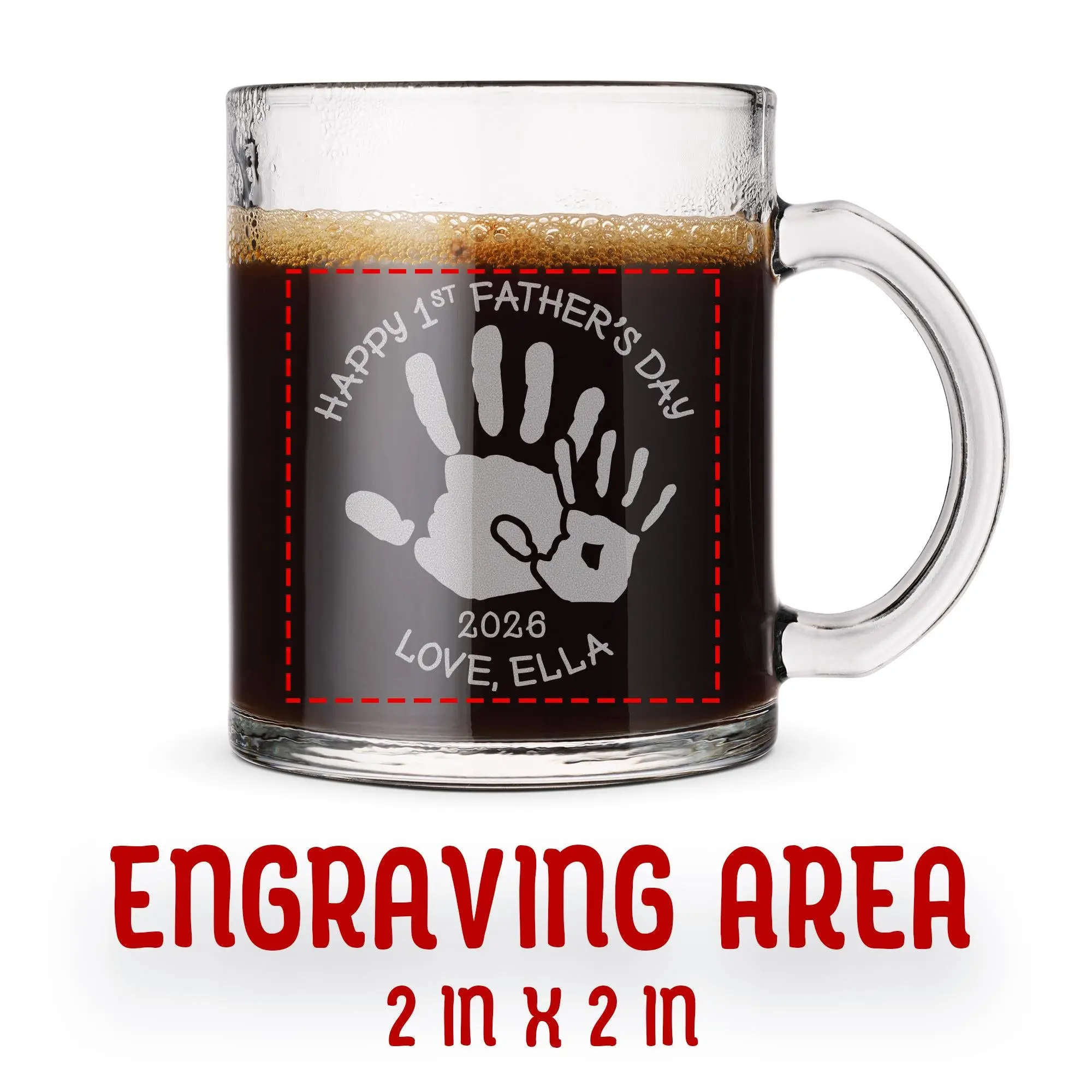 Celebrate Dad with a meaningful keepsake using this personalized glass mug featuring a heartfelt Father’s Day handprint design. Showcasing a big and small handprint along with your custom name and year, this engraved mug captures the special bond between father and child. It’s a thoughtful and personal gift that turns everyday coffee or tea into a reminder of love and connection.