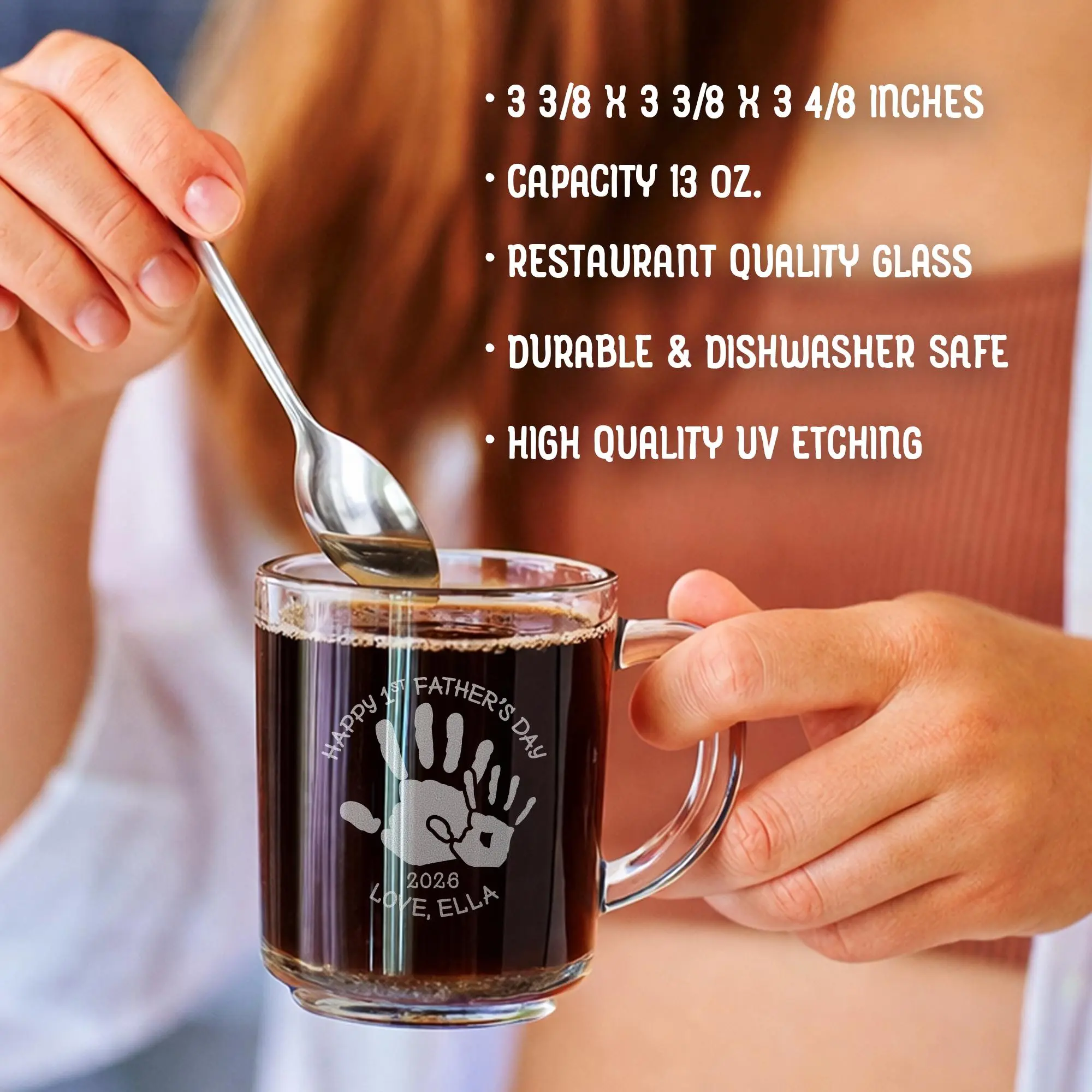 Crafted from high-quality, restaurant-grade glass and engraved using precision UV etching, this mug delivers a crisp, frosted finish that won’t fade over time. Durable and dishwasher safe, it’s perfect for daily use while still holding sentimental value. Personalize it with a name and date to create a one-of-a-kind gift that Dad will cherish for years to come.