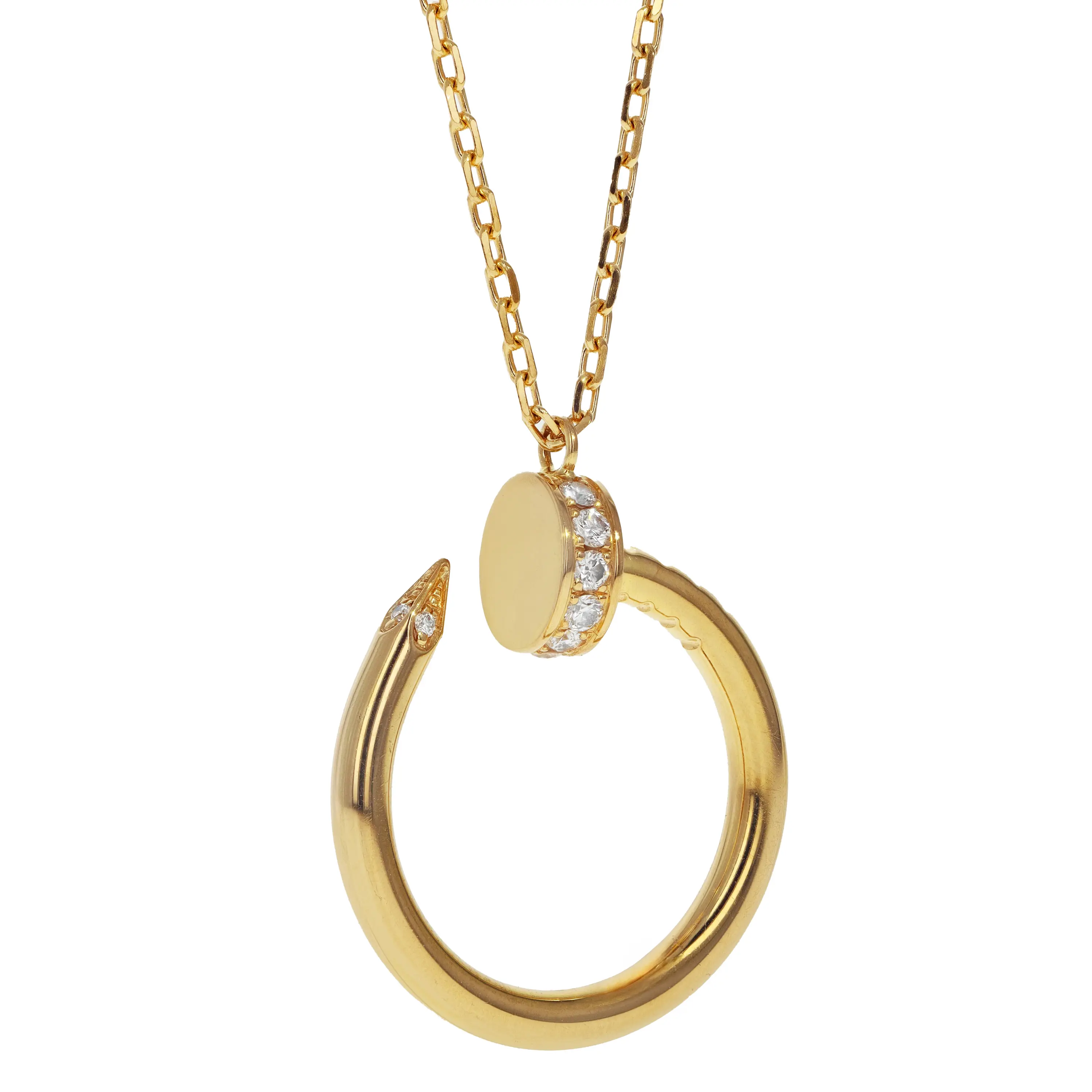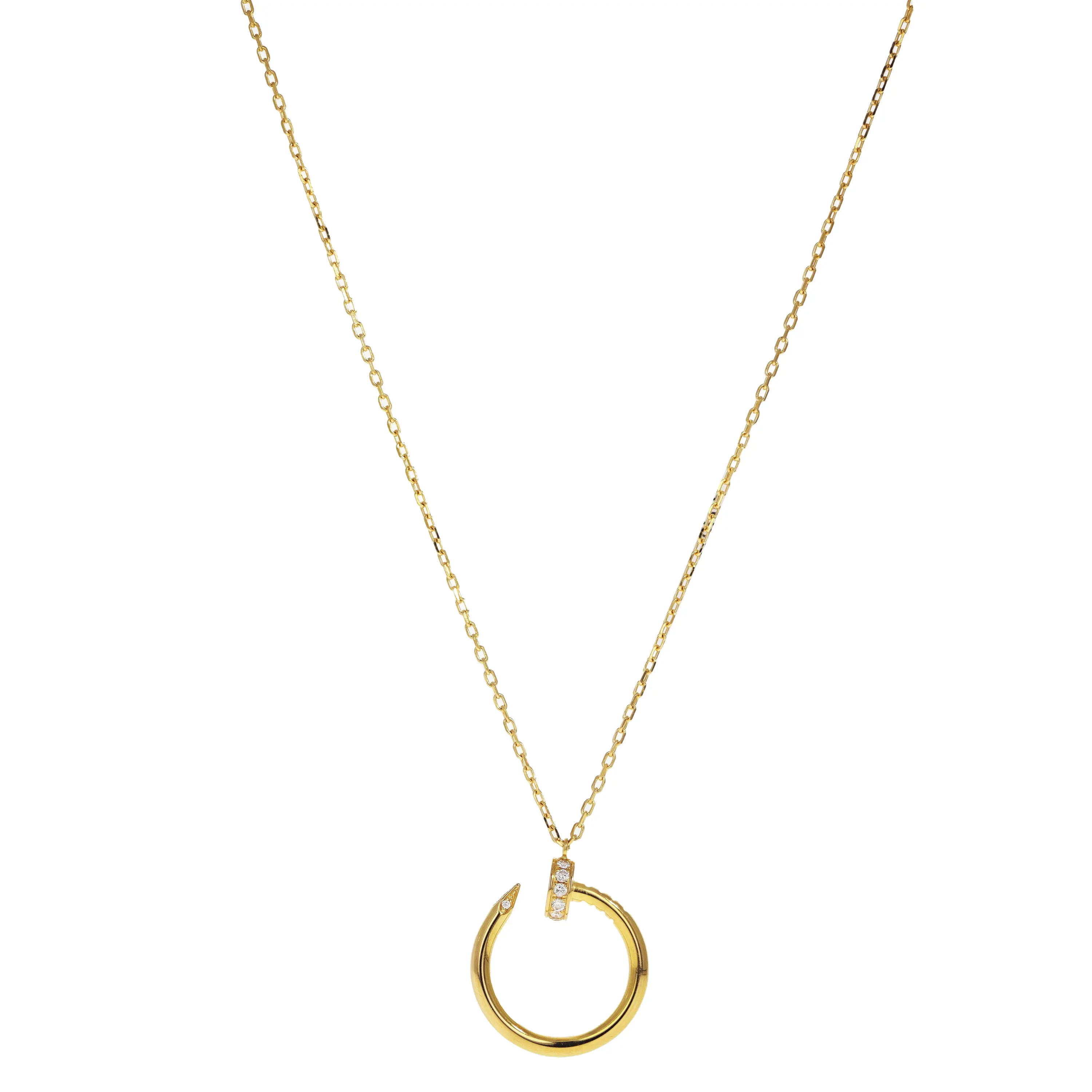 A pre-owned Cartier Juste un Clou pendant in 18kt yellow gold and diamond. The necklace features a 16 inch long cable chain with a lobster clasp and a sliding diamond nail pendant. The nail pendant is curved into a circle and features a high polished finish with diamonds along the nail head and on the pointed end of the nail. The fourteen (14) round brilliant-cut diamonds have a combined carat weight of 0.12cts. The necklace comes with the original Cartier box and paperwork.