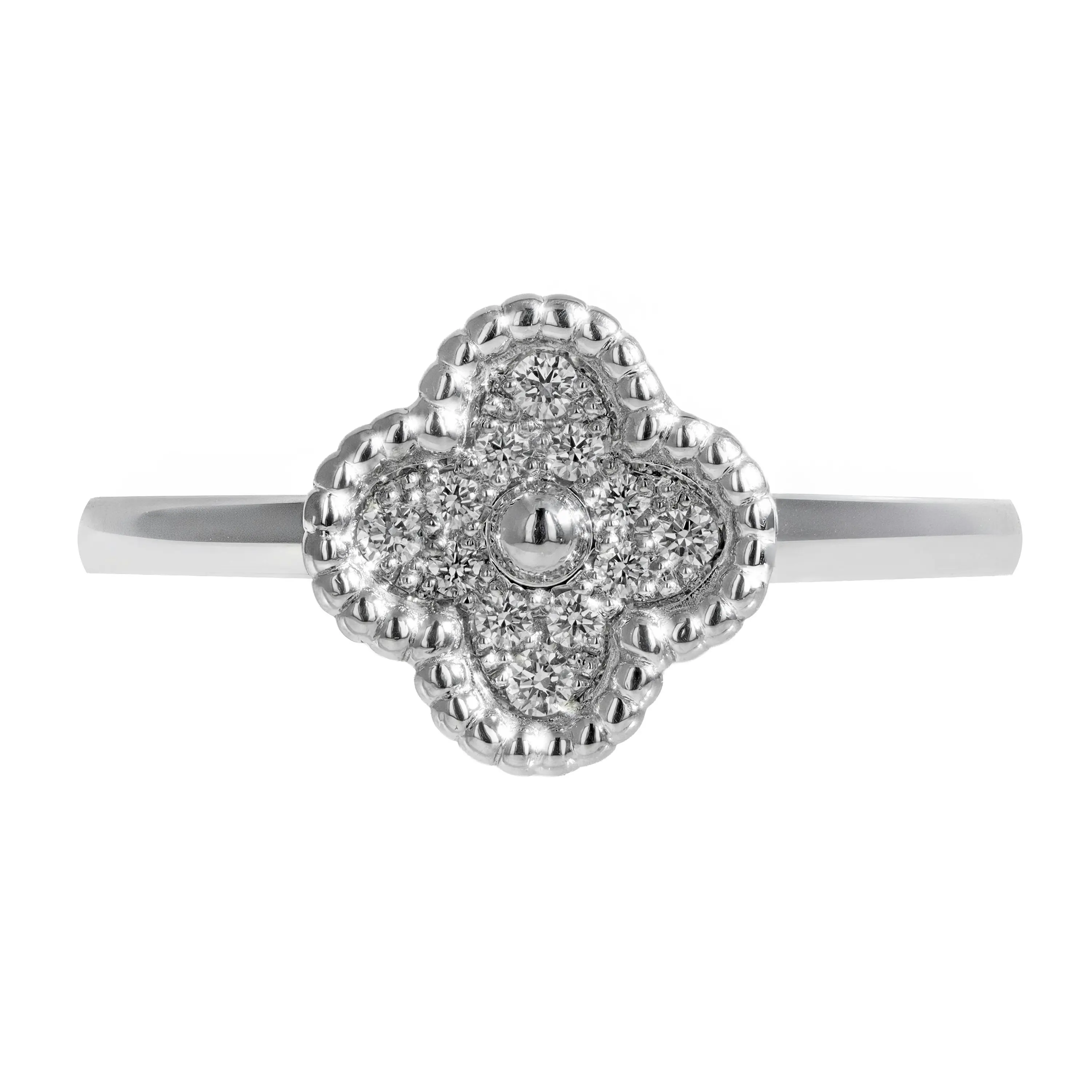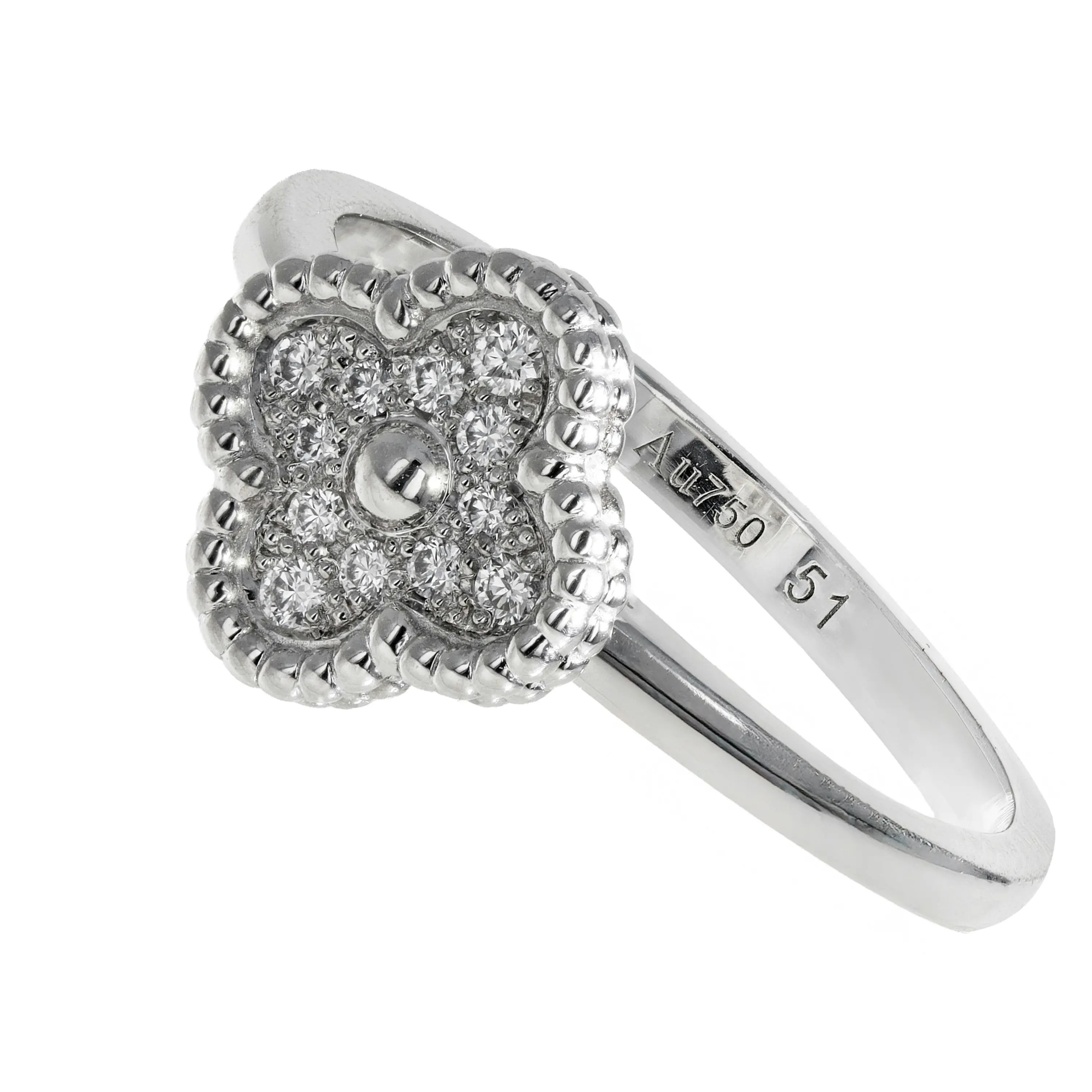 A pre-owned Van Cleef & Arpels 18kt white gold and diamond ring by from the Sweet Alhambra Collection. The ring features a singular, signature four petal motif pendant stationed at the top of the ring. The station features twelve (12) round brilliant-cut pave diamonds weighing 0.08cts in a milgrain-edge on all sides, with a single, high-polished gold bead in the center. The ring is a size 5.75. The ring comes with the original Van Cleef & Arpels box and papers.