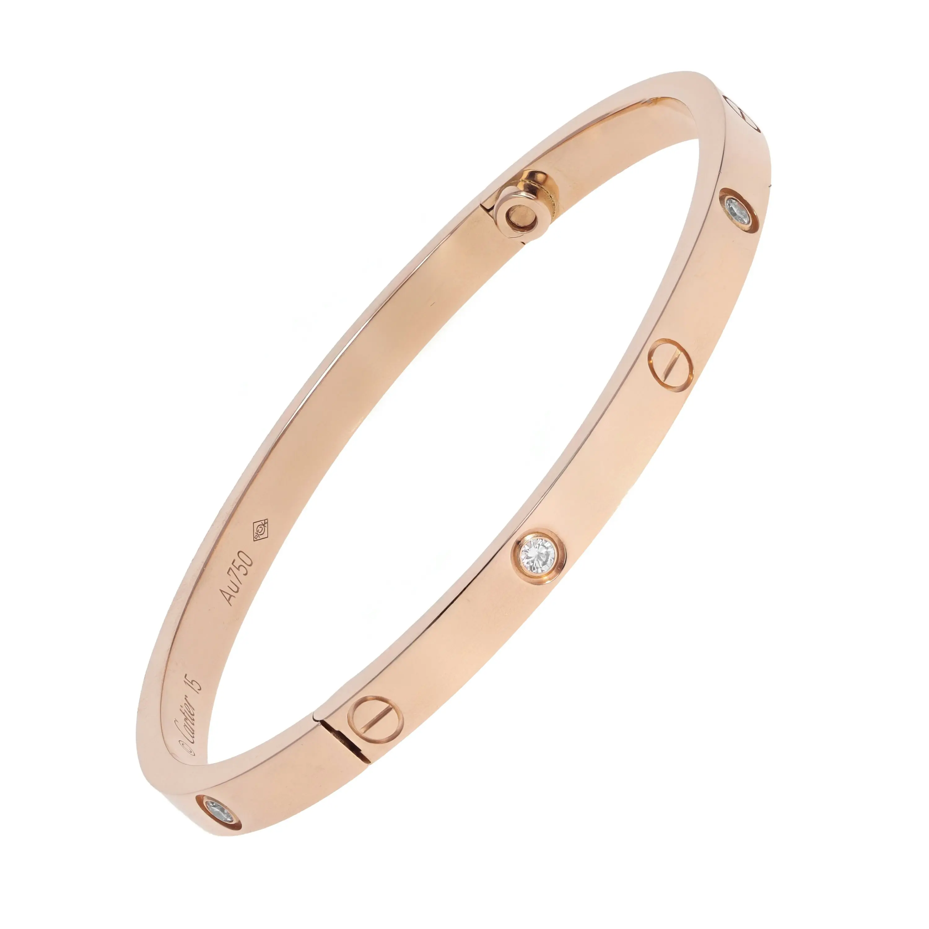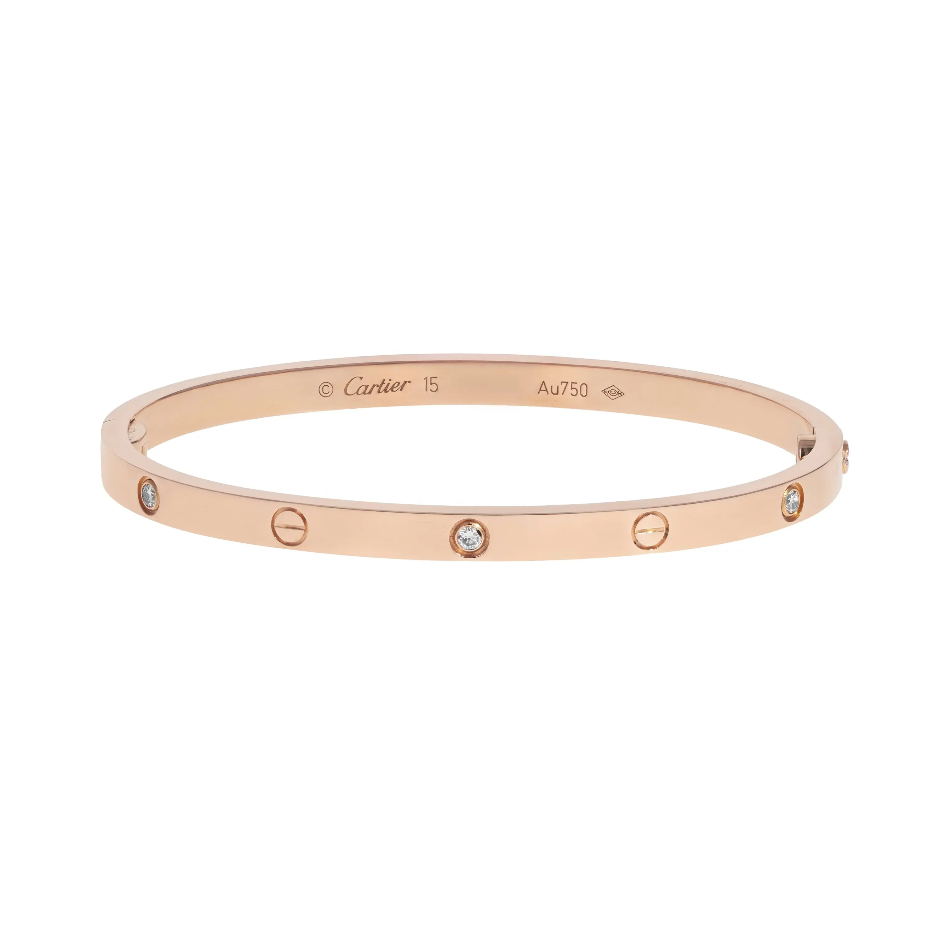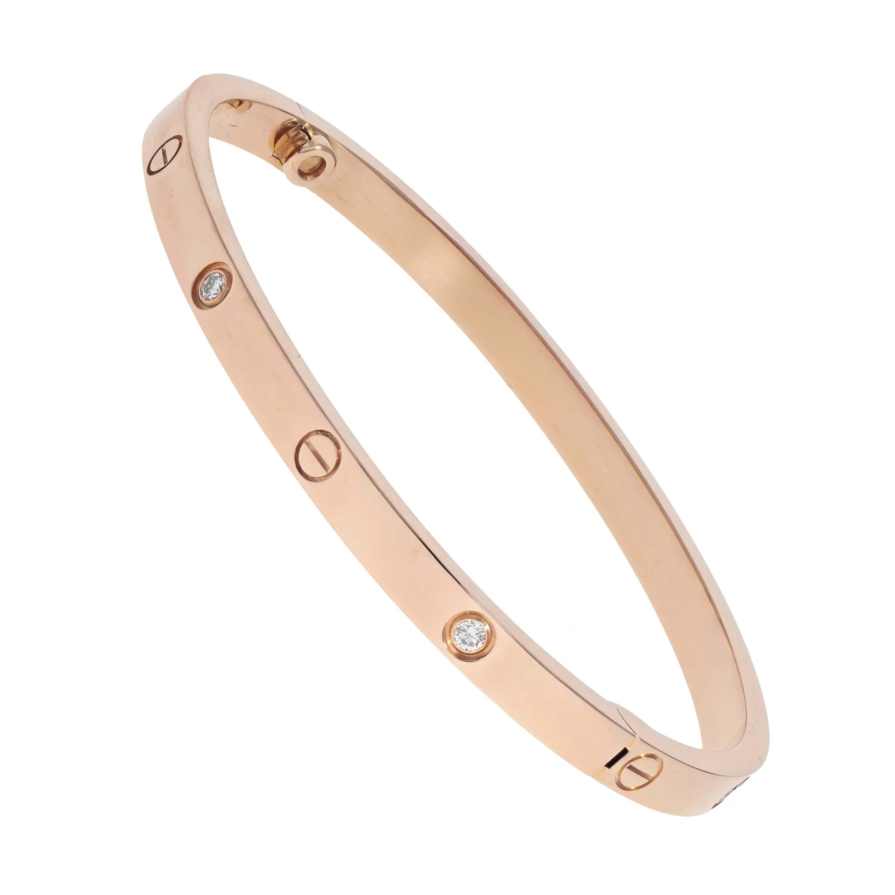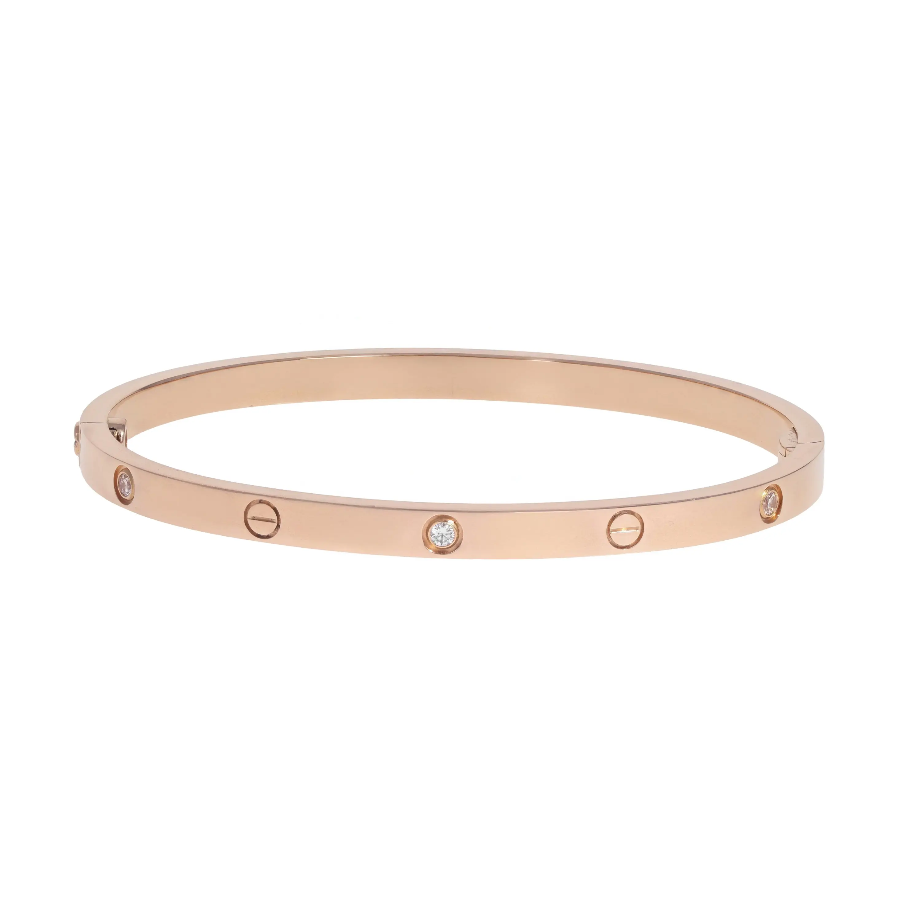 A pre-owned small model Cartier Love bracelet in 18kt rose gold and diamond. The bangle features a high polished finish with six (6) round brilliant-cut diamonds bezel-set and alternating with the signature screw design. The diamonds and engraved screw designs are evenly spaced all the way around the hinged bracelet and the bracelet is secured by a hidden screw clasp. The bracelet is a size 15 and the diamonds have a combined carat weight of 0.15cts. The bangle comes with the original box, paperwork, service papers, and Cartier screwdriver.