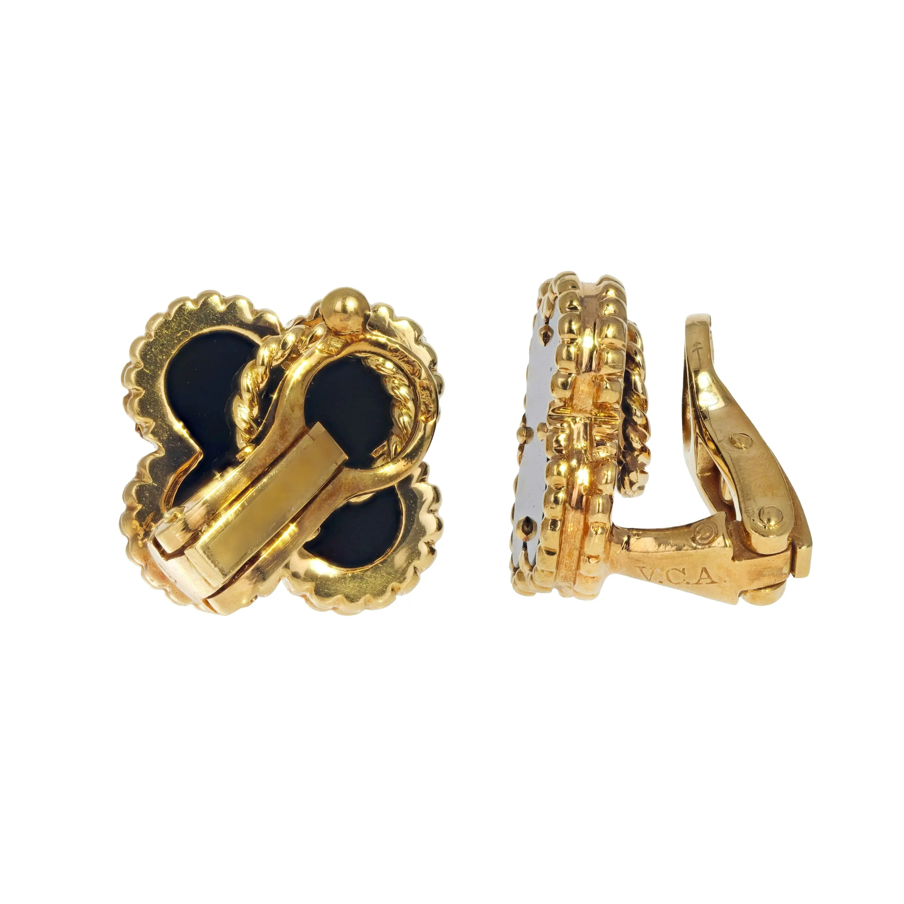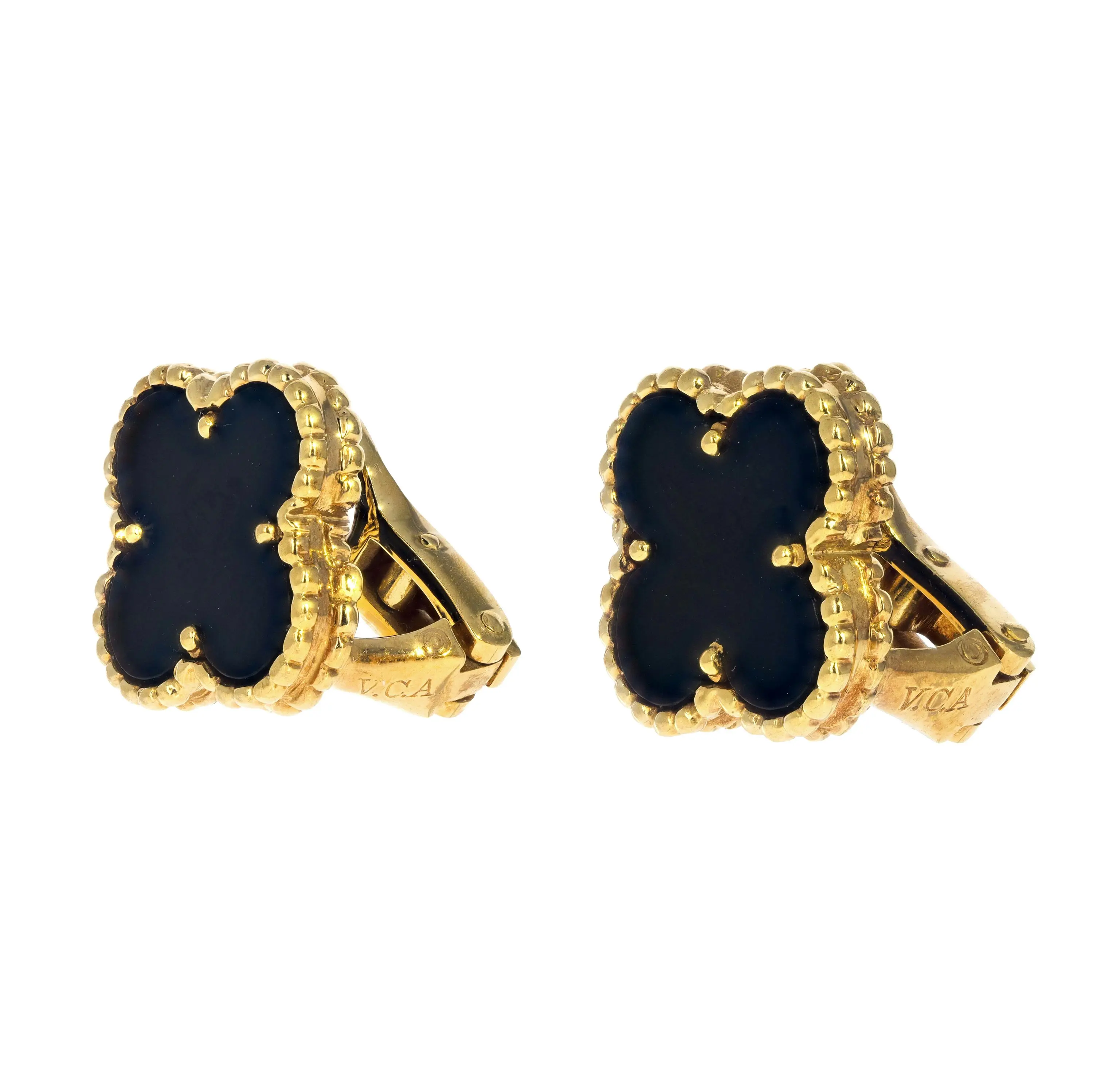 A pair of Van Cleef & Arpels 18kt yellow gold and black onyx stud earrings from the Vintage Alhambra Collection. The earrings each feature a singular, signature four petal motif pendant stationed secured with clip-on backings. The motif features a black onyx stone in a milgrain-edge.