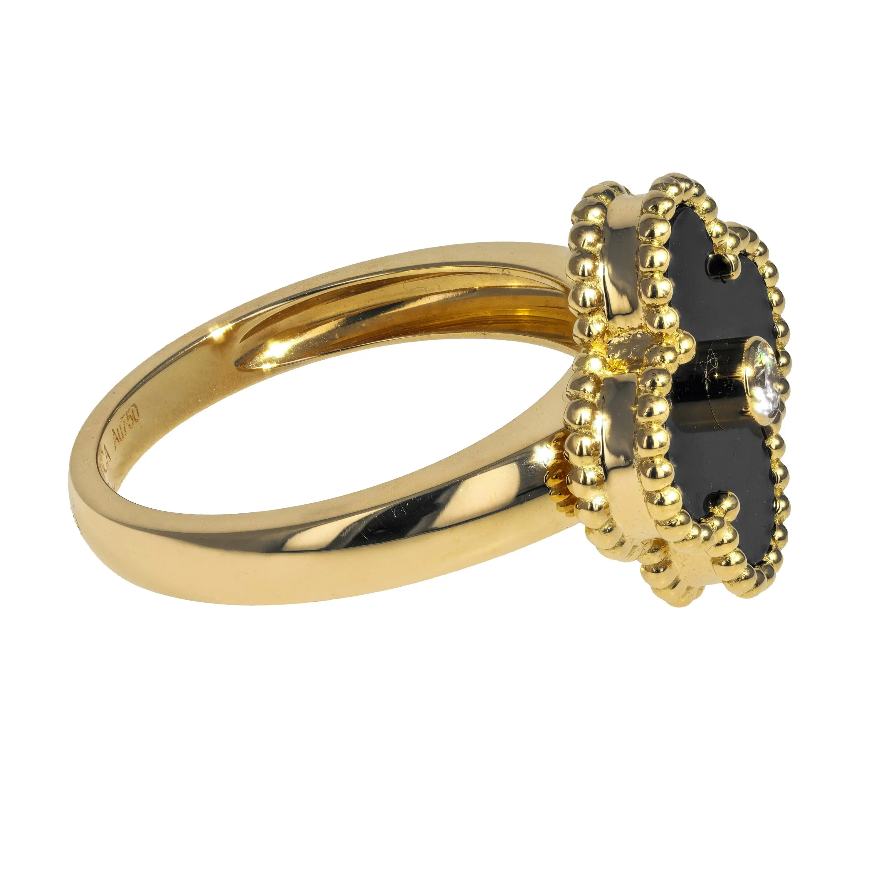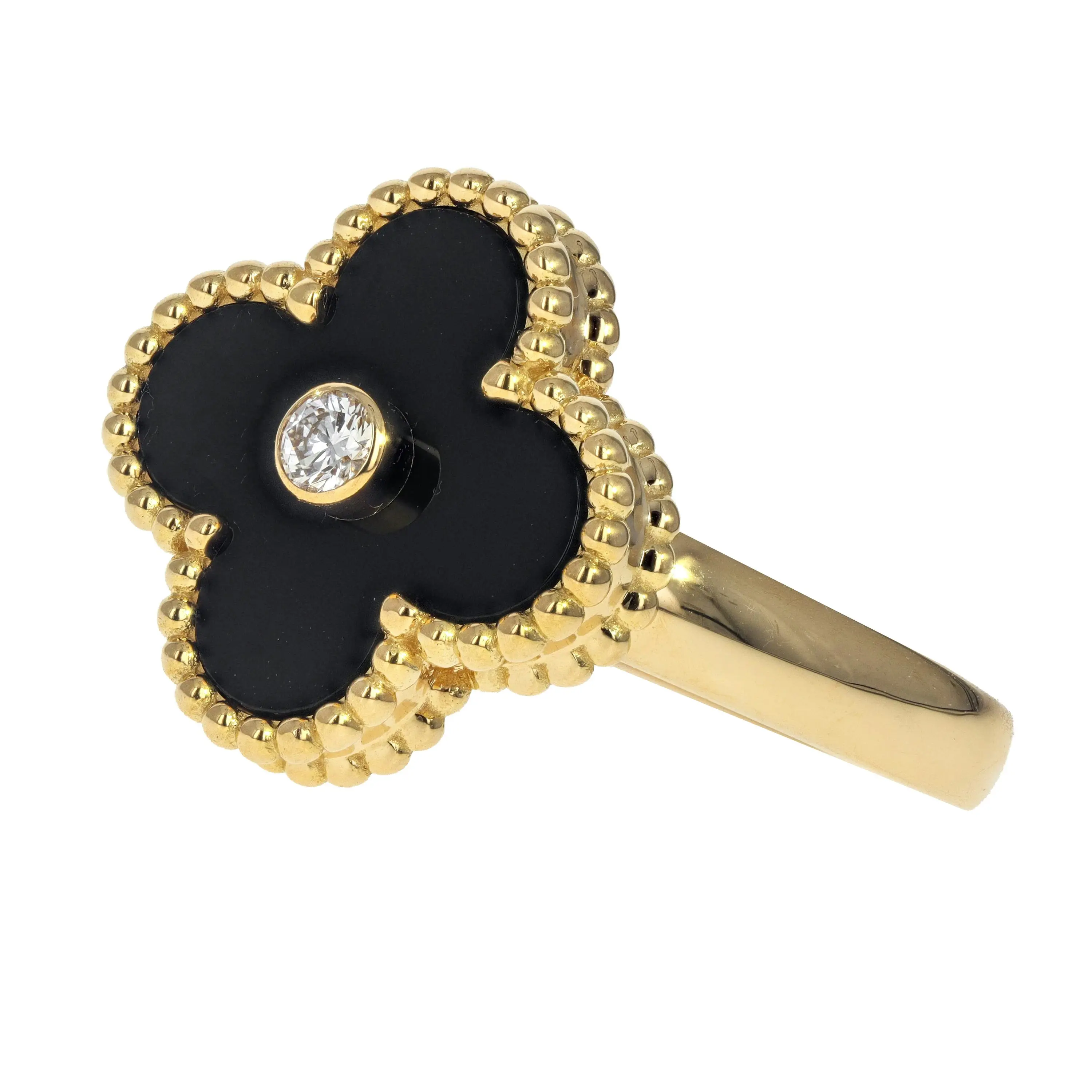 A pre-owned Van Cleef & Arpels 18kt yellow gold and black onyx ring from the Vintage Alhambra Collection. The ring features a singular, signature four petal motif pendant stationed at the top of the ring. The station features a black onyx stone in a milgrain-edge on all sides, with a single, bezel-set round brilliant-cut diamond in the center. The ring is a size 6.25