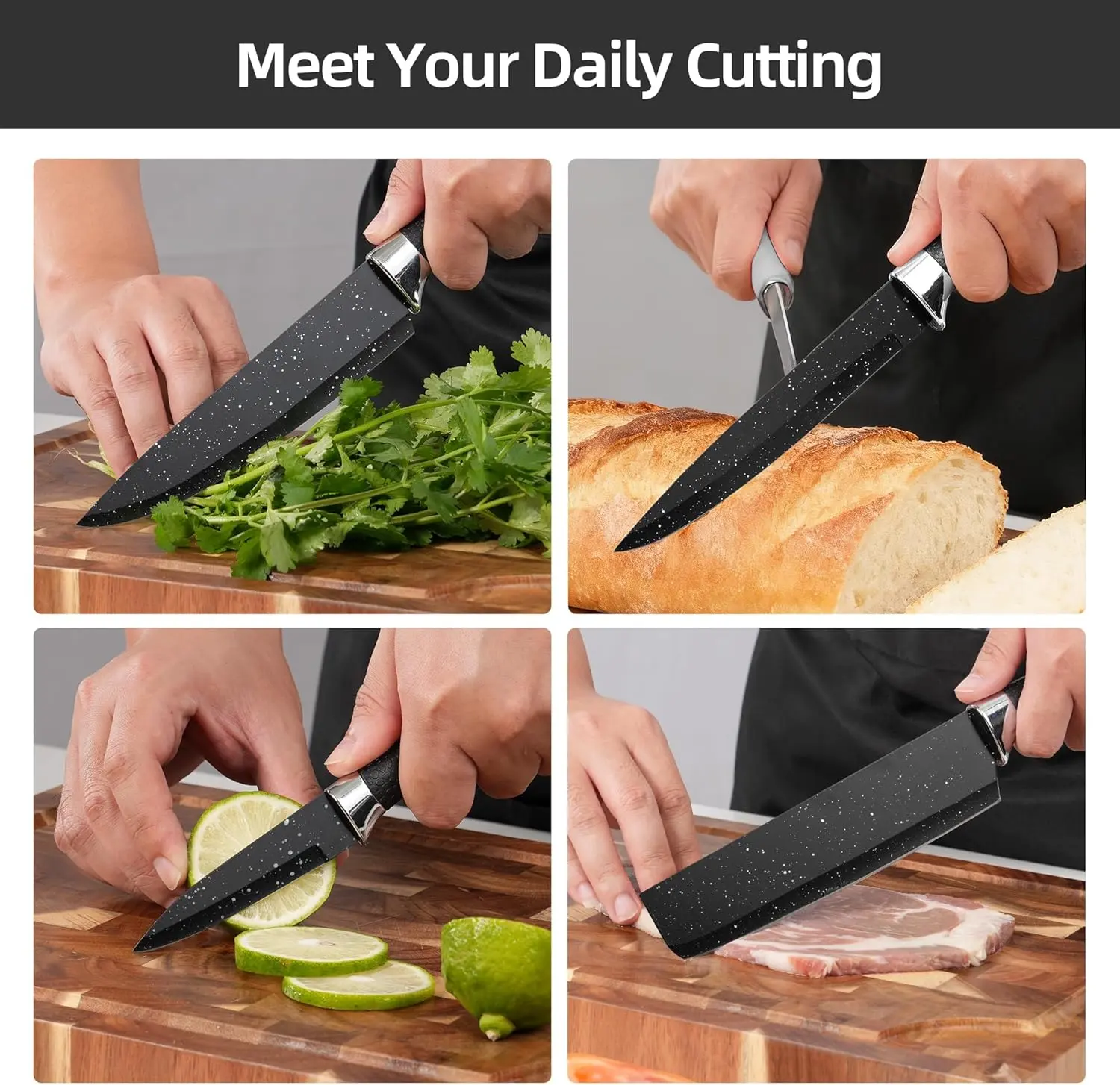 ·COMPLETE SET: 6-piece kitchen knife set includes 8" chef knife, 8" carving knife, 8" small cleaver, 3.5" paring knife, kitchen scissors, and a peeler for all your food prep needs