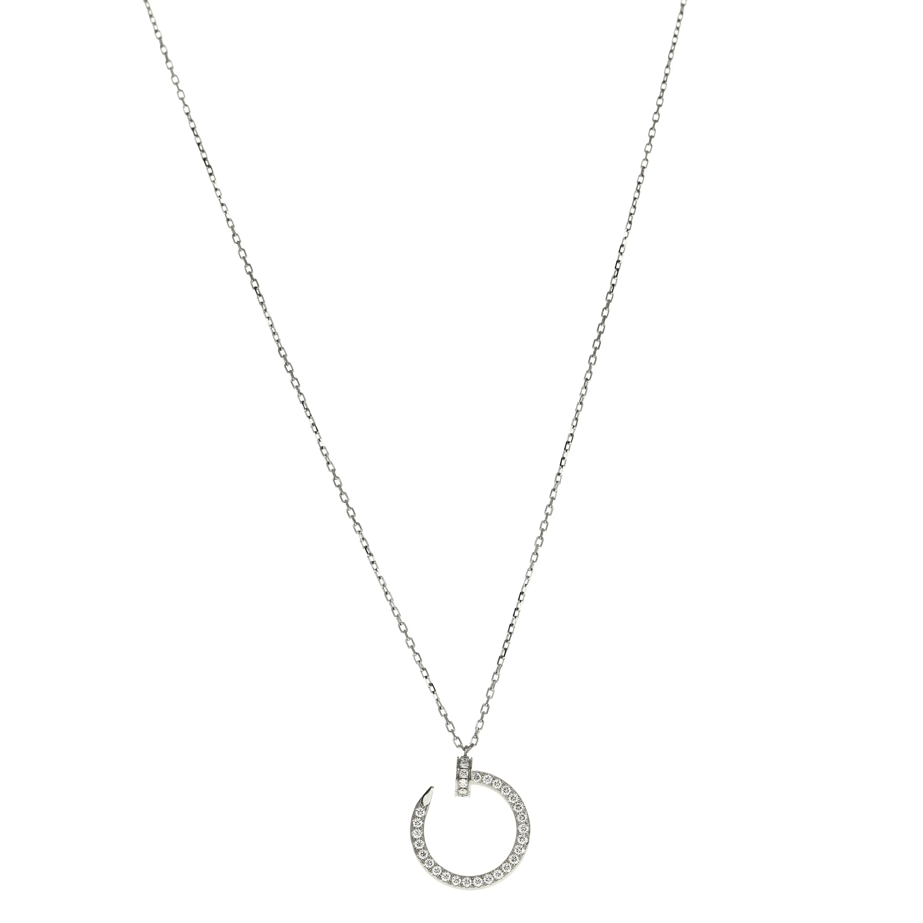 Pre-owned Cartier 18k white gold and diamond pendant necklace from the Juste Un Clou collection. The necklace features the signature curved nail pendant that is set with round brilliant diamonds. The pendant is sliding on an 18k white gold cable-link chain that measures 16 inches in length and is secured with a lobster clasp. This piece comes with the original papers.
