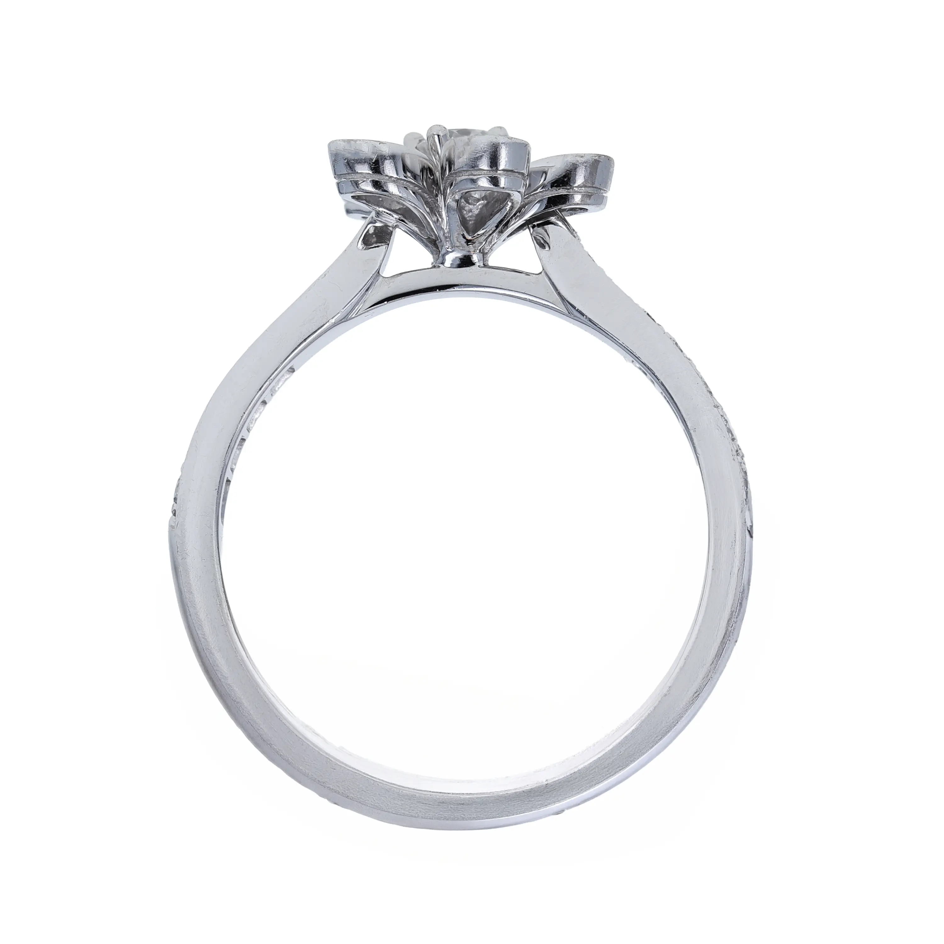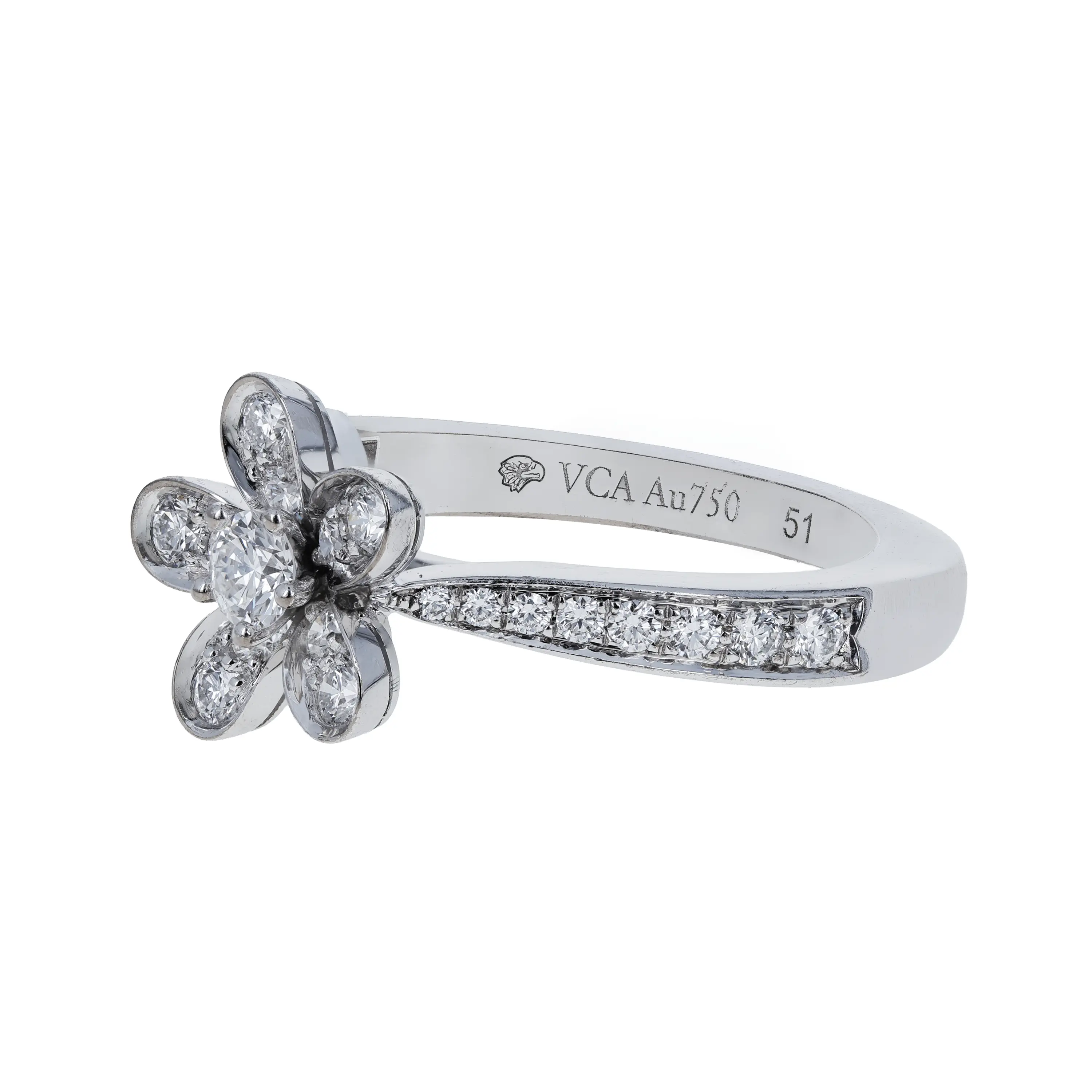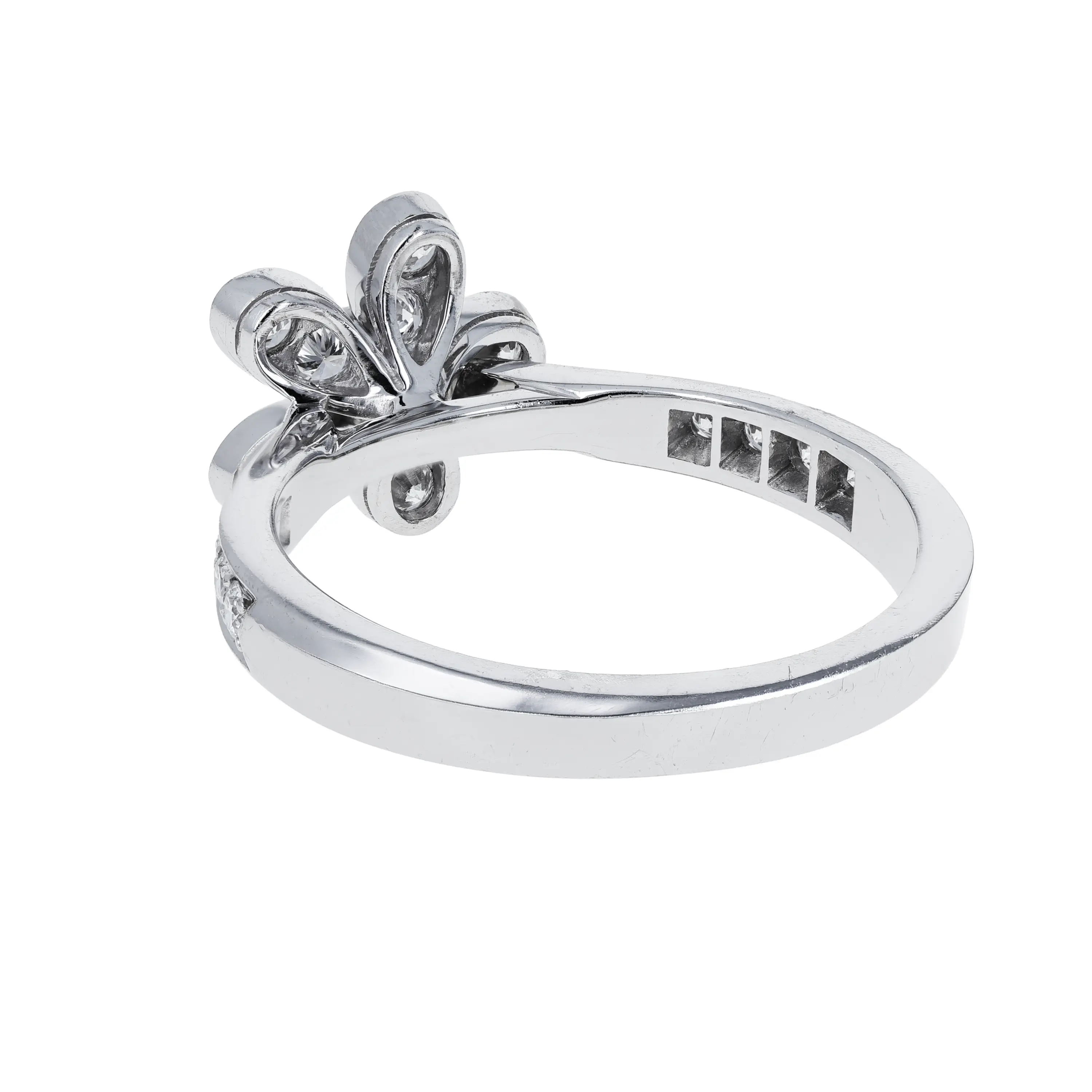 Pre-owned Van Cleef & Arpels 18k white gold and diamond ring from the Socrate collection. The ring features a five petal flower with two round brilliant diamonds set in each petal and a single round brilliant diamond set in a six-prong setting in the center. The flower is secured atop an 18k white gold ring that is pave-set with round brilliant diamonds and tapers towards the center flower. This piece is in a size 51 and comes with the original box and papers.